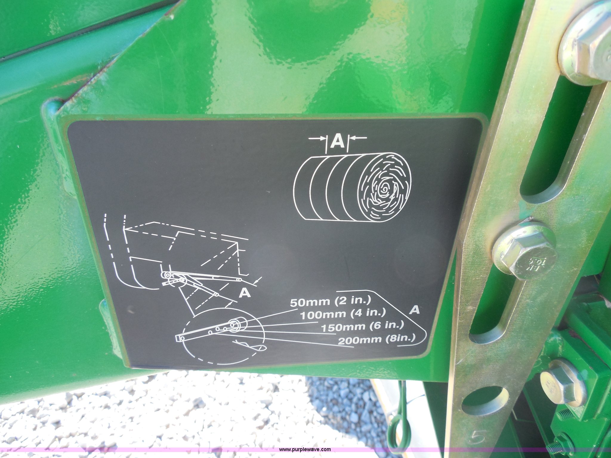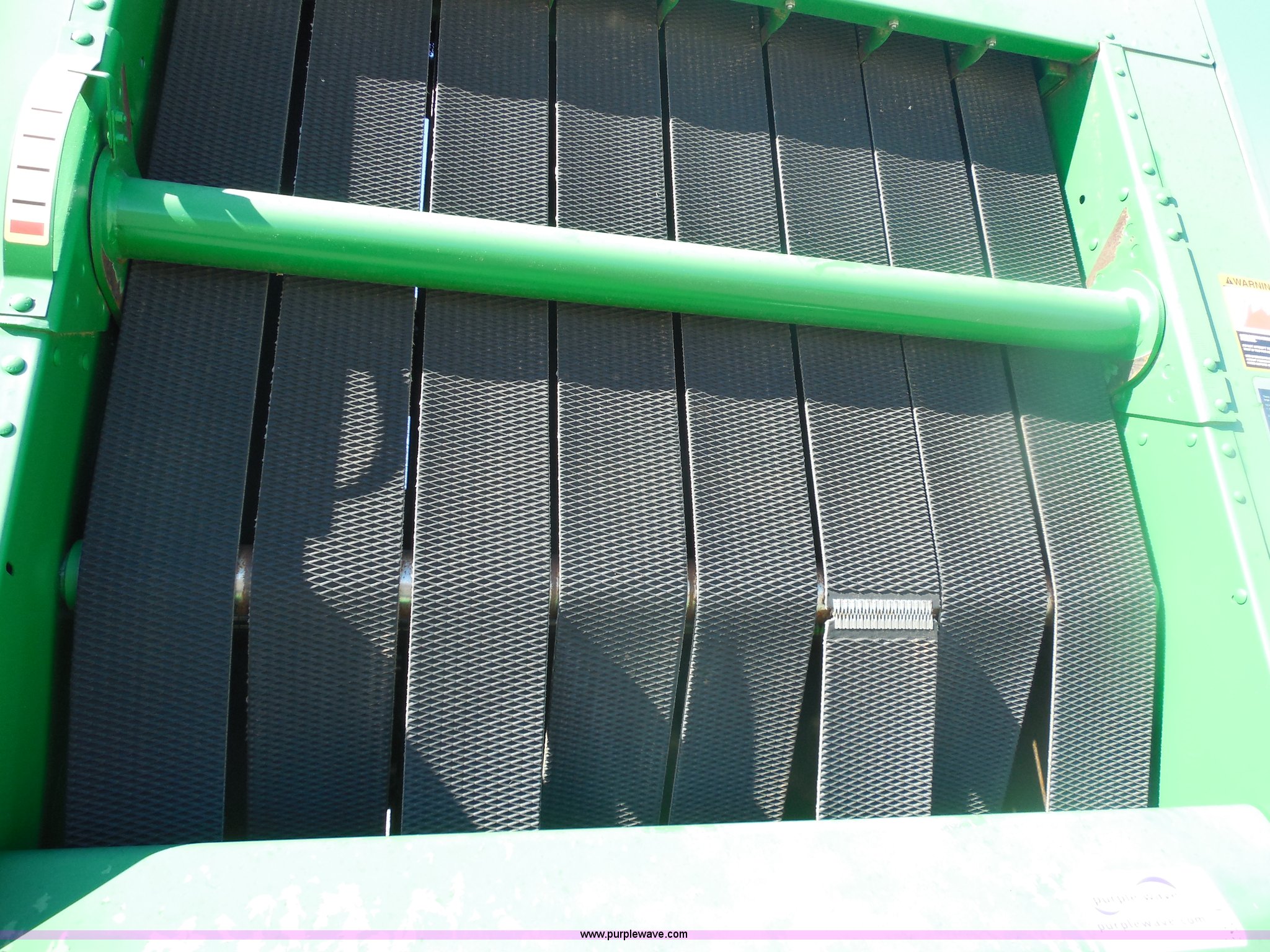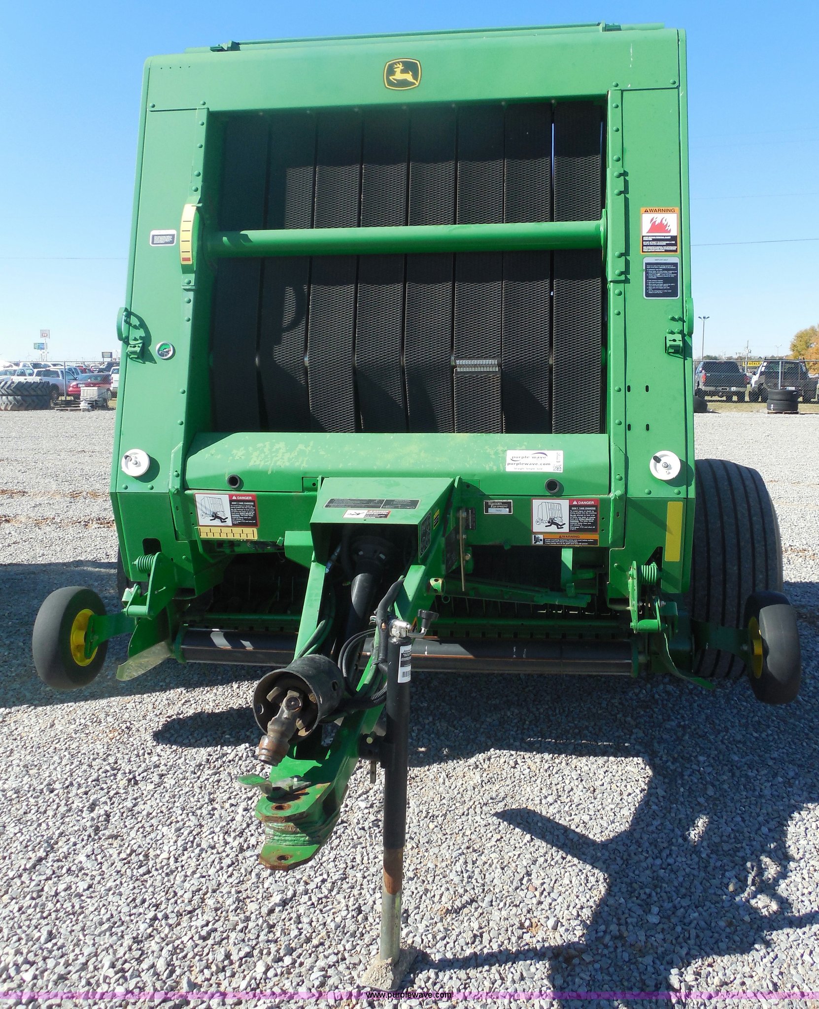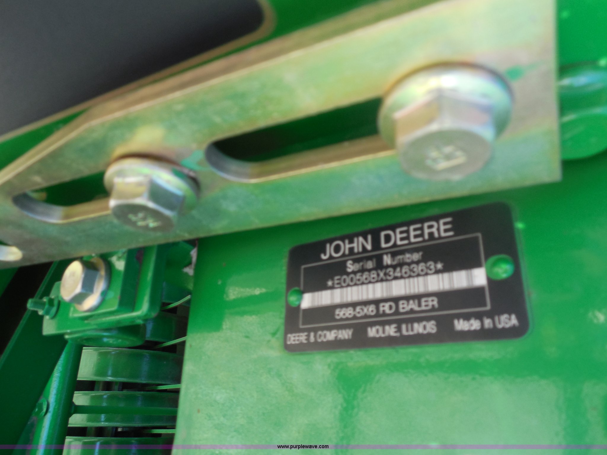 Purple Wave is selling a used Round Baler in Oklahoma. This item is a 2008 John Deere 568 round baler with the following: 9,558 bales on counter, 5' x 6' bale capacity, Megawide megatooth pickup, 87" width, 112 teeth, Twine and net wrap capacity, Bale-Trak PRO monitor control, (8) twine roll capacity, 1000 PTO, Bale kicker, 21.5 x 16 tires, Serial E00568X346363