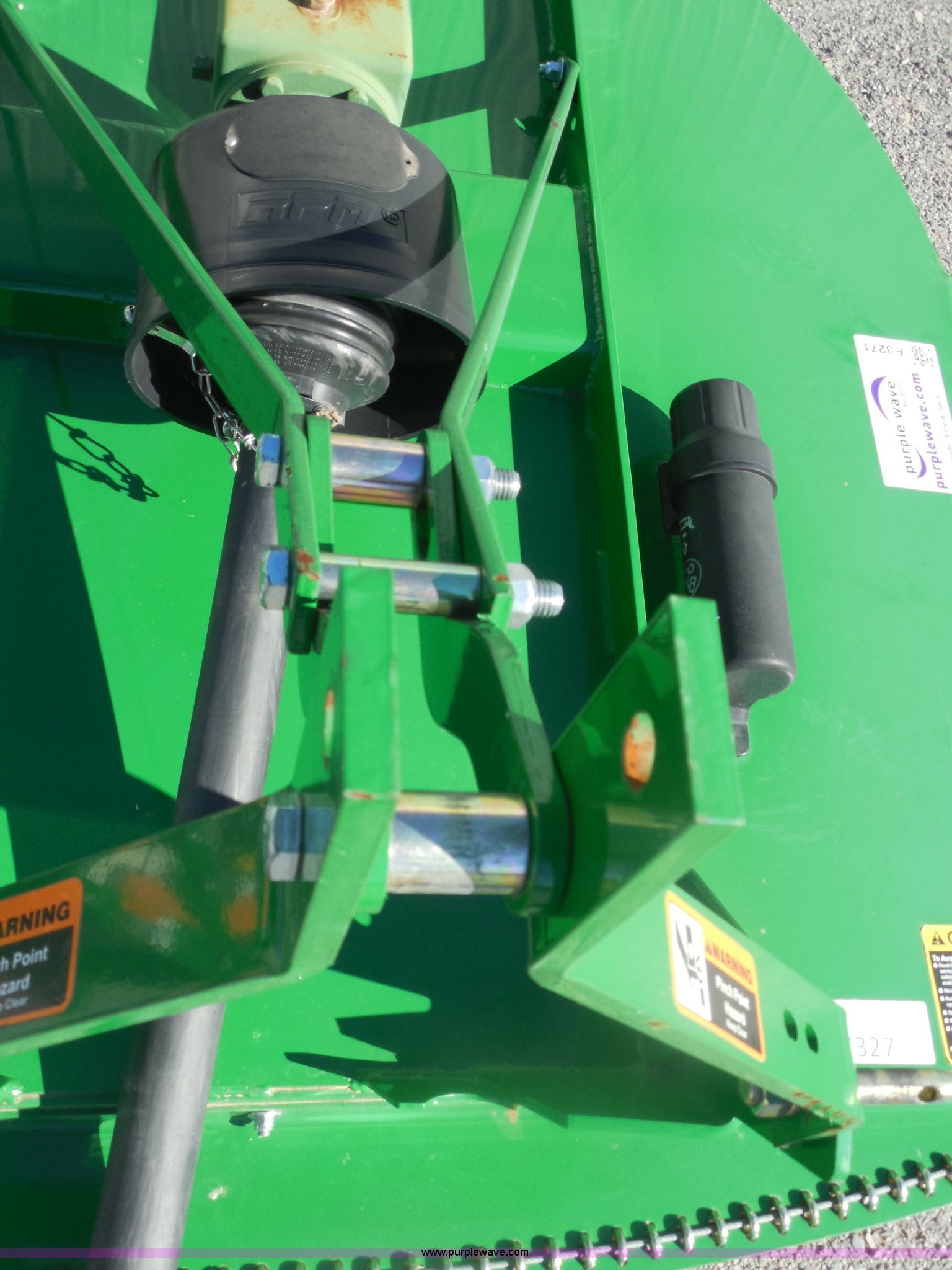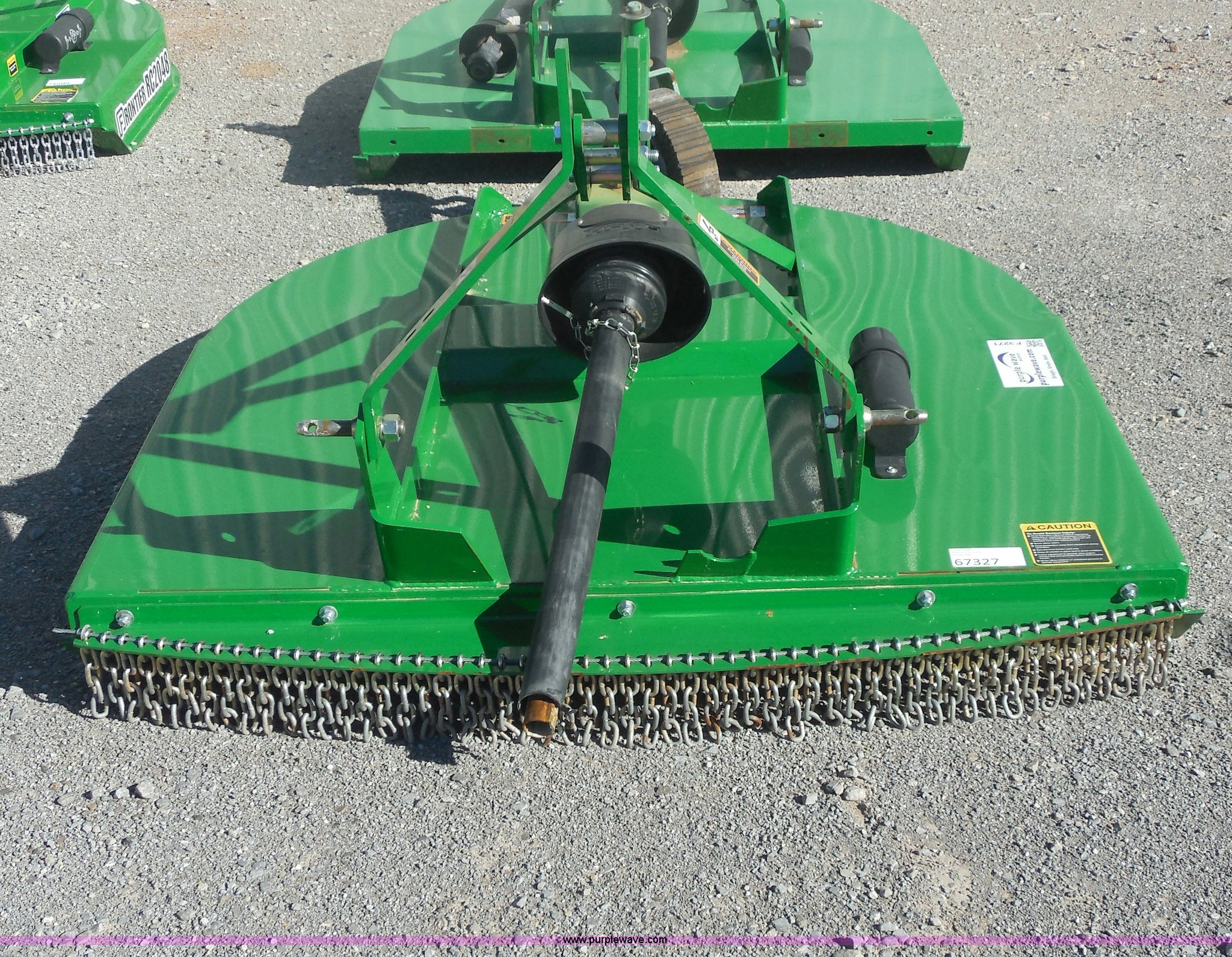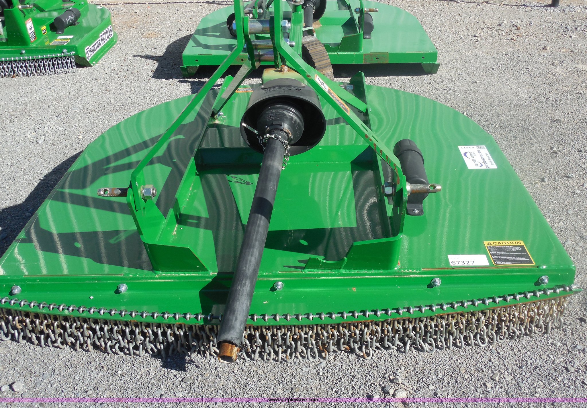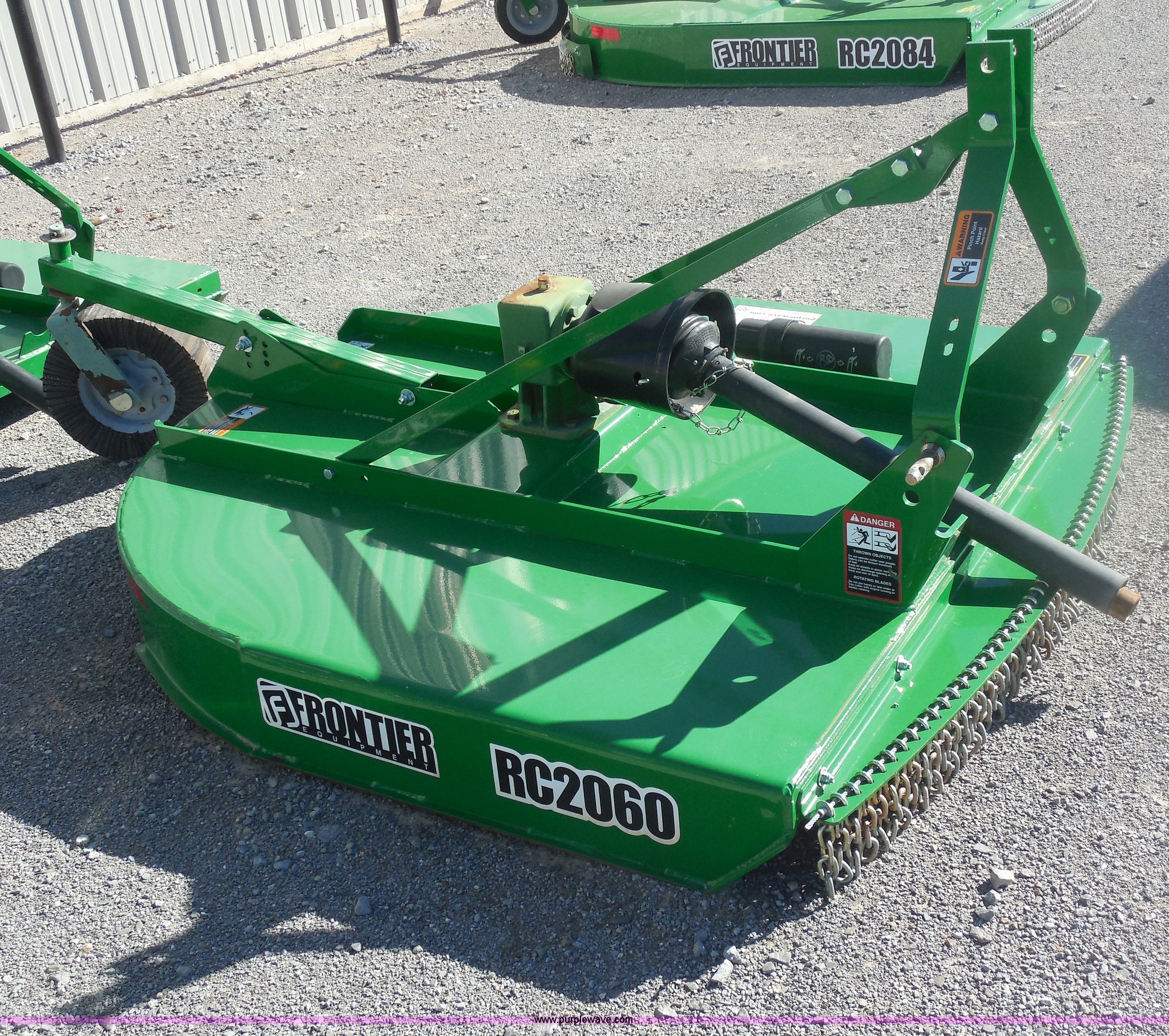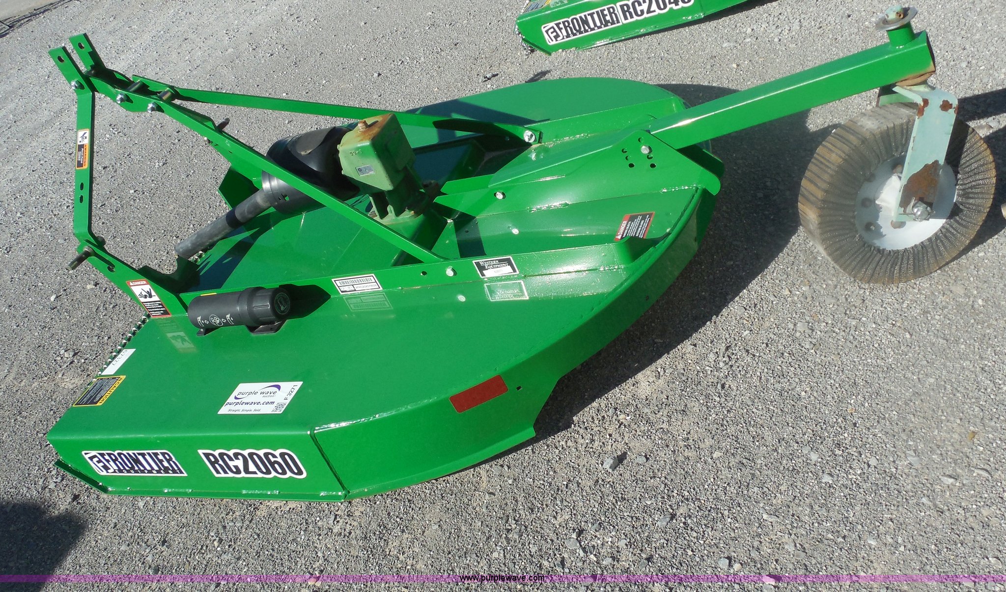 Purple Wave is selling a used Mower, Cutter, Shredder in Oklahoma. This item is a Frontier RC2060 rotary mower with the following: 5' cutting width, 1.5" to 9"H cutting height, 1" brush cutting capacity, 540 PTO, Category I three point hitch, Adaptable to category II, 540 PTO, 63" overall width, 101.2" overall length, Heat treated suction blades, Blade tip speed 14,335 feet per minute, Imatch auto hitch compatible, Serial XFRC20X011808