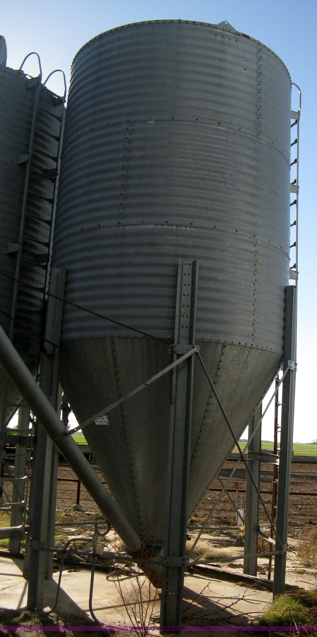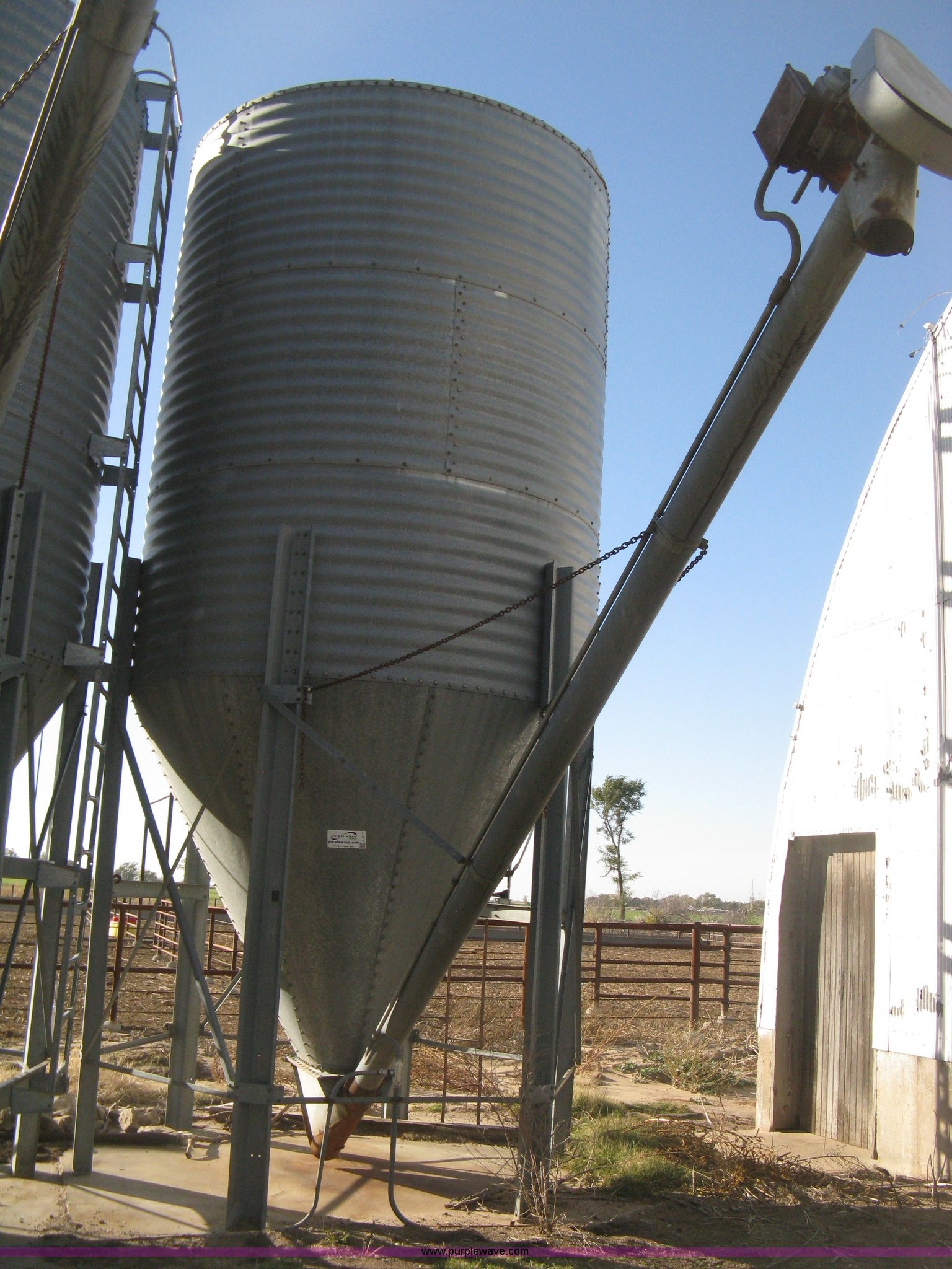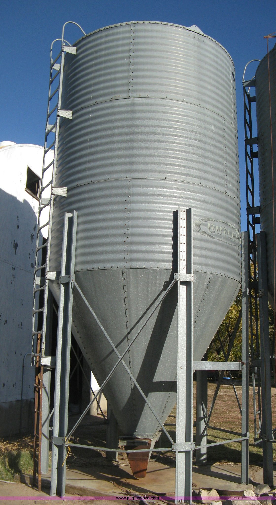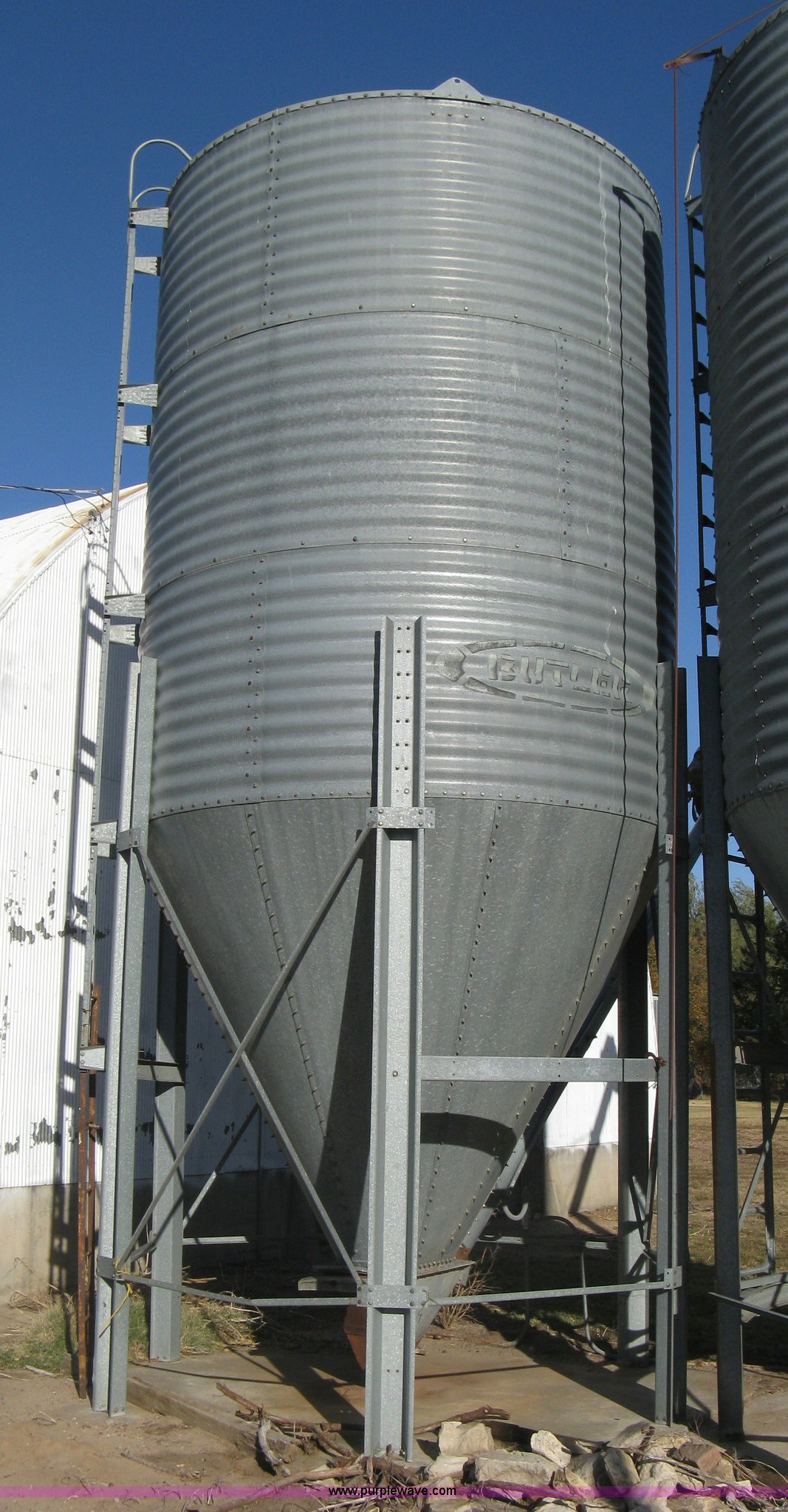 Purple Wave is selling a used Other Grain or Fertilizer Handling in Kansas. This item is a Butler bulk bin with the following: Cone bottom, Approx. 650 bu. capacity, Three 42" rings, 90"L cone bottom, Galvanized, Approx. 18'L unloading auger, 6" diameter, Electric motor, Side mount ladder