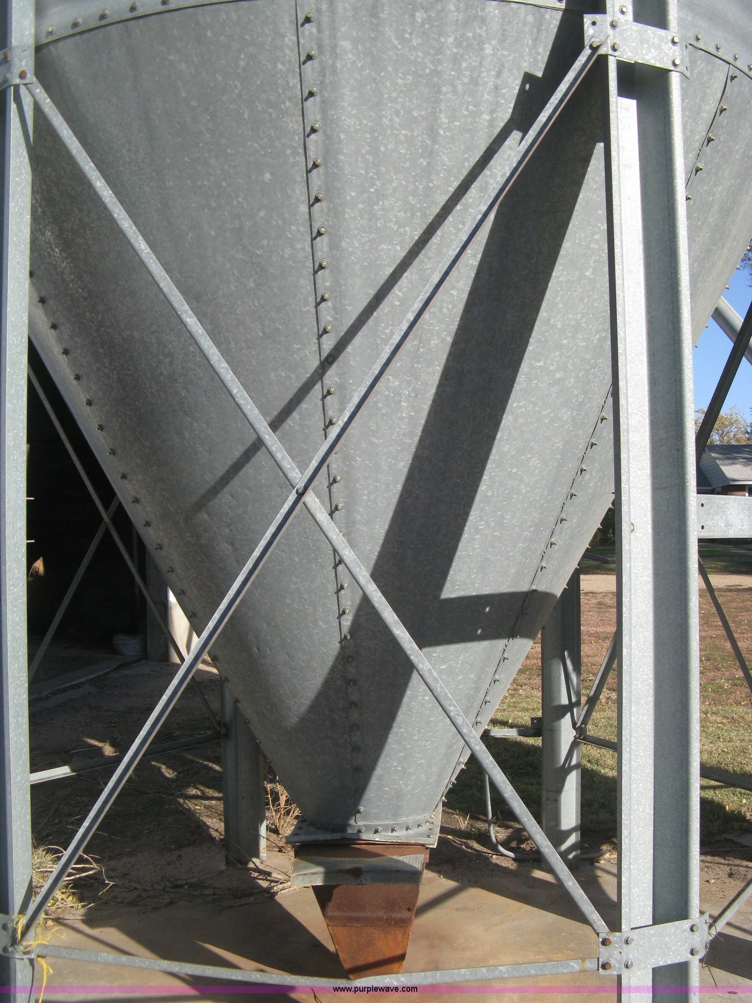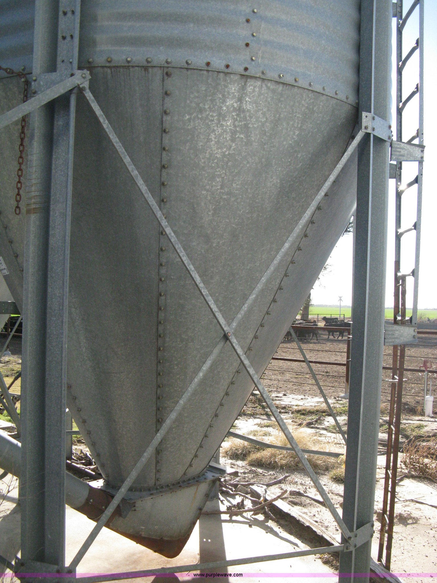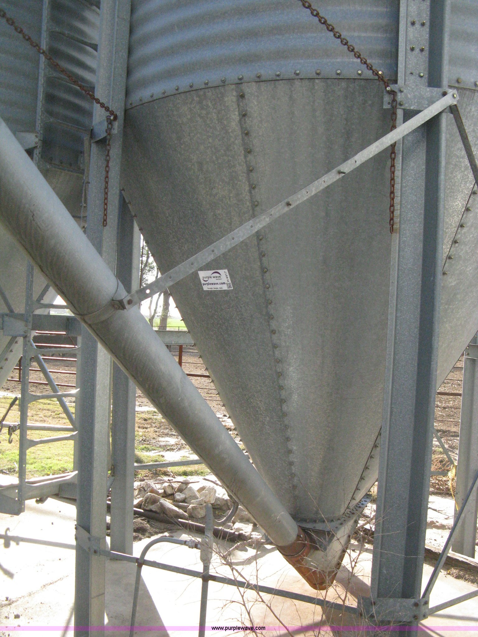 Purple Wave is selling a used Other Grain or Fertilizer Handling in Kansas. This item is a Butler bulk bin with the following: Cone bottom, Approx. 650 bu. capacity, Three 42" rings, 90"L cone bottom, Galvanized, Approx. 18'L unloading auger, 6" diameter, Electric motor, Side mount ladder