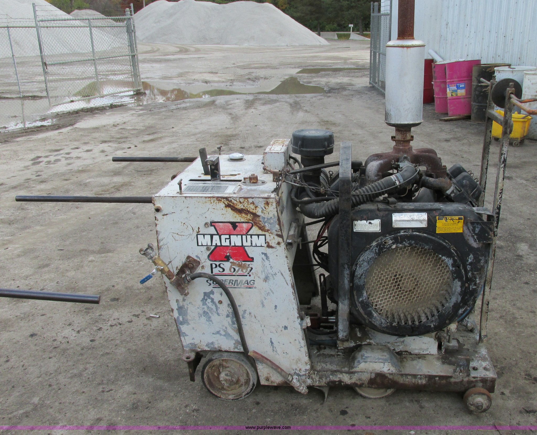 Purple Wave is selling a used Concrete Equip. or Acces. in Kansas. This item is a Magnum PS6585-14 walk-behind saw with the following: 2,478 hours on meter, Four cylinder gas engine, 38 HP, 24" blade capacity, Self-propelled, Forward and reverse, 12V electric start, Lifting eye