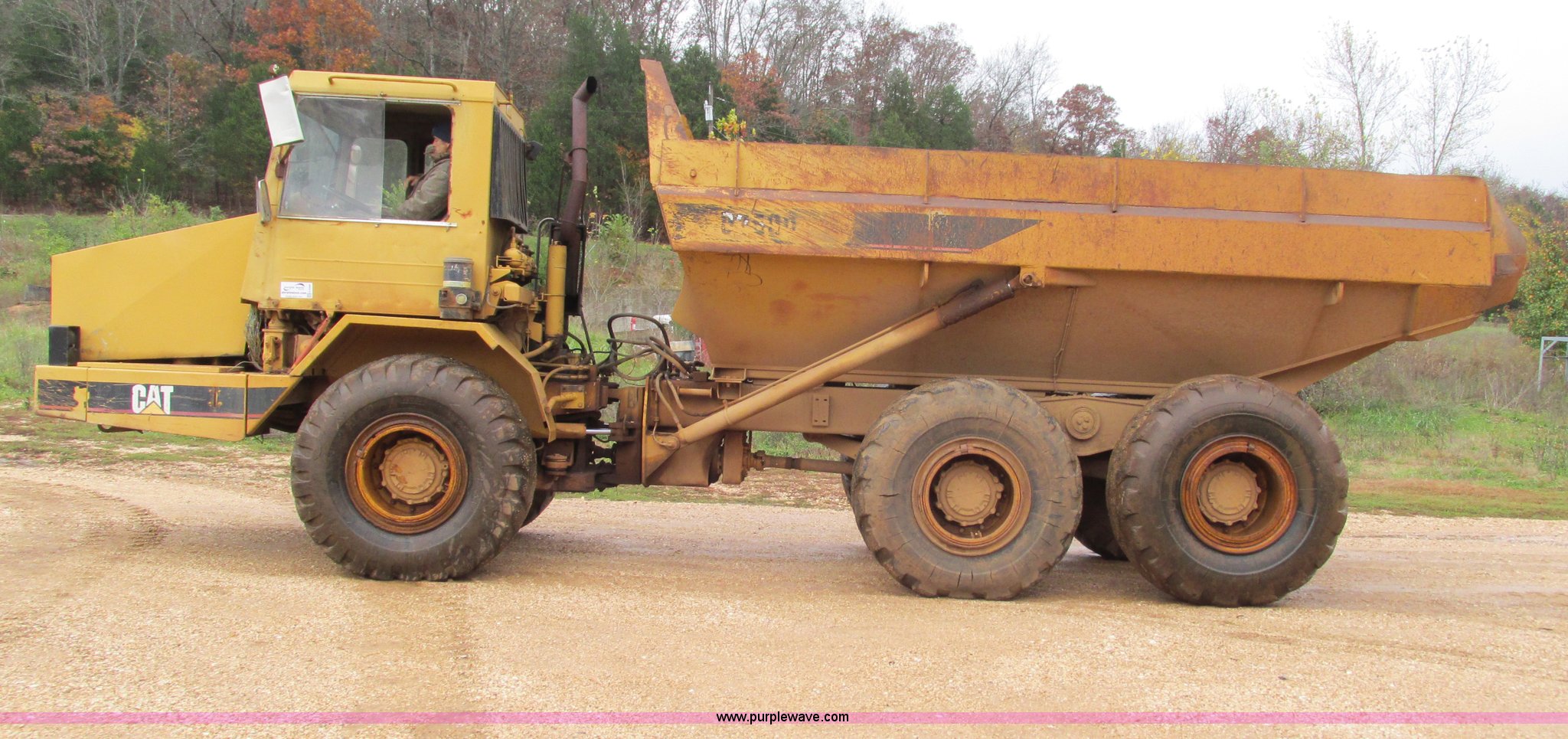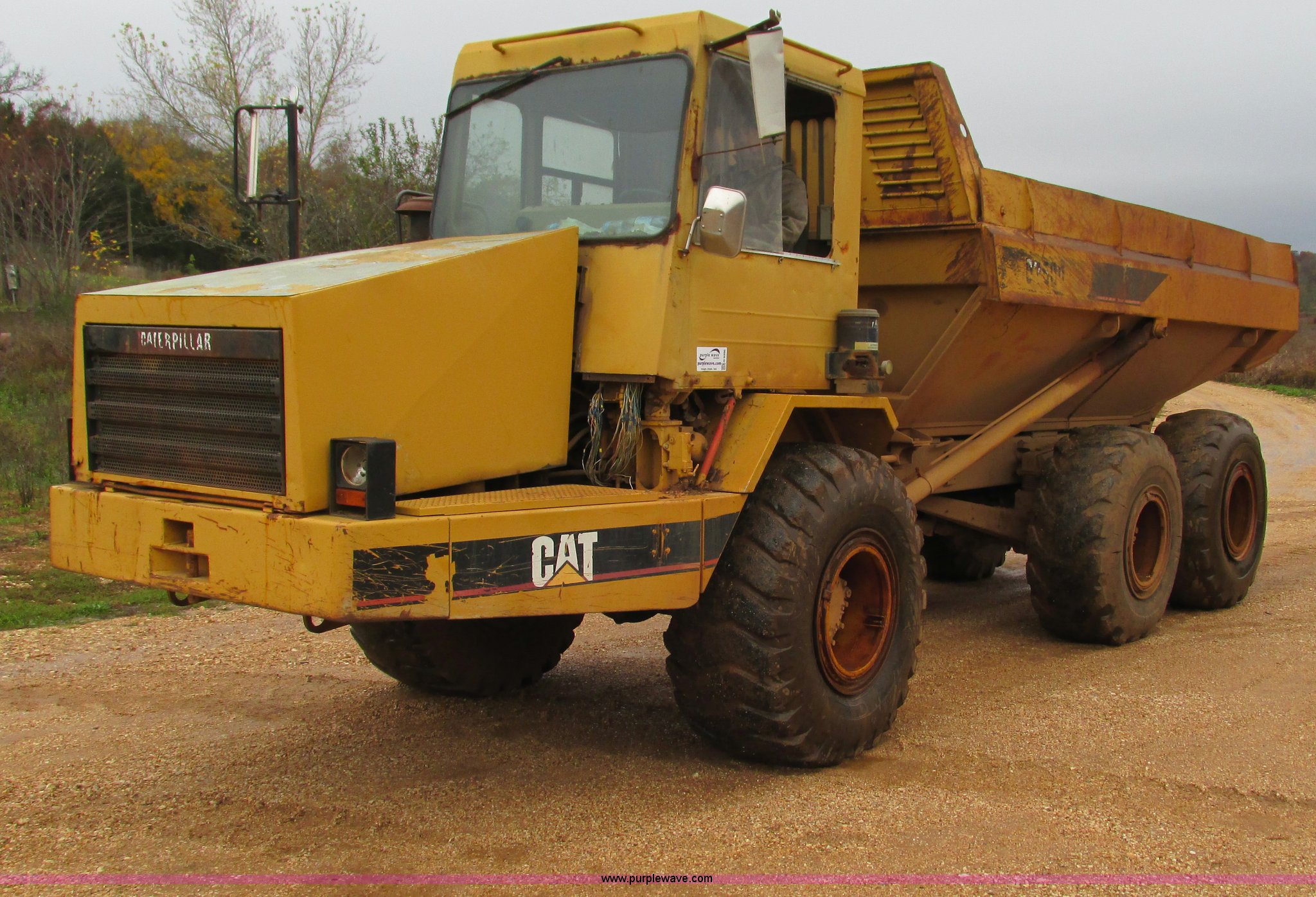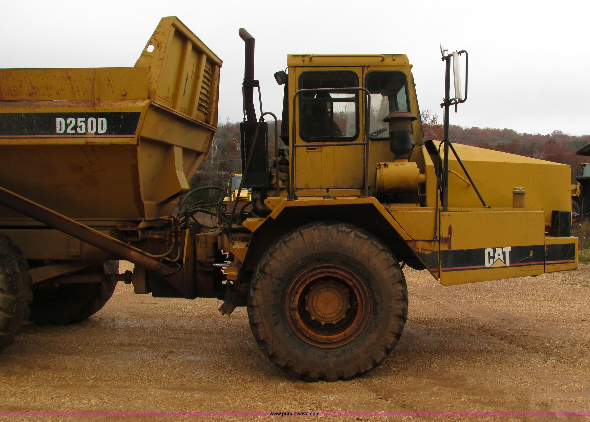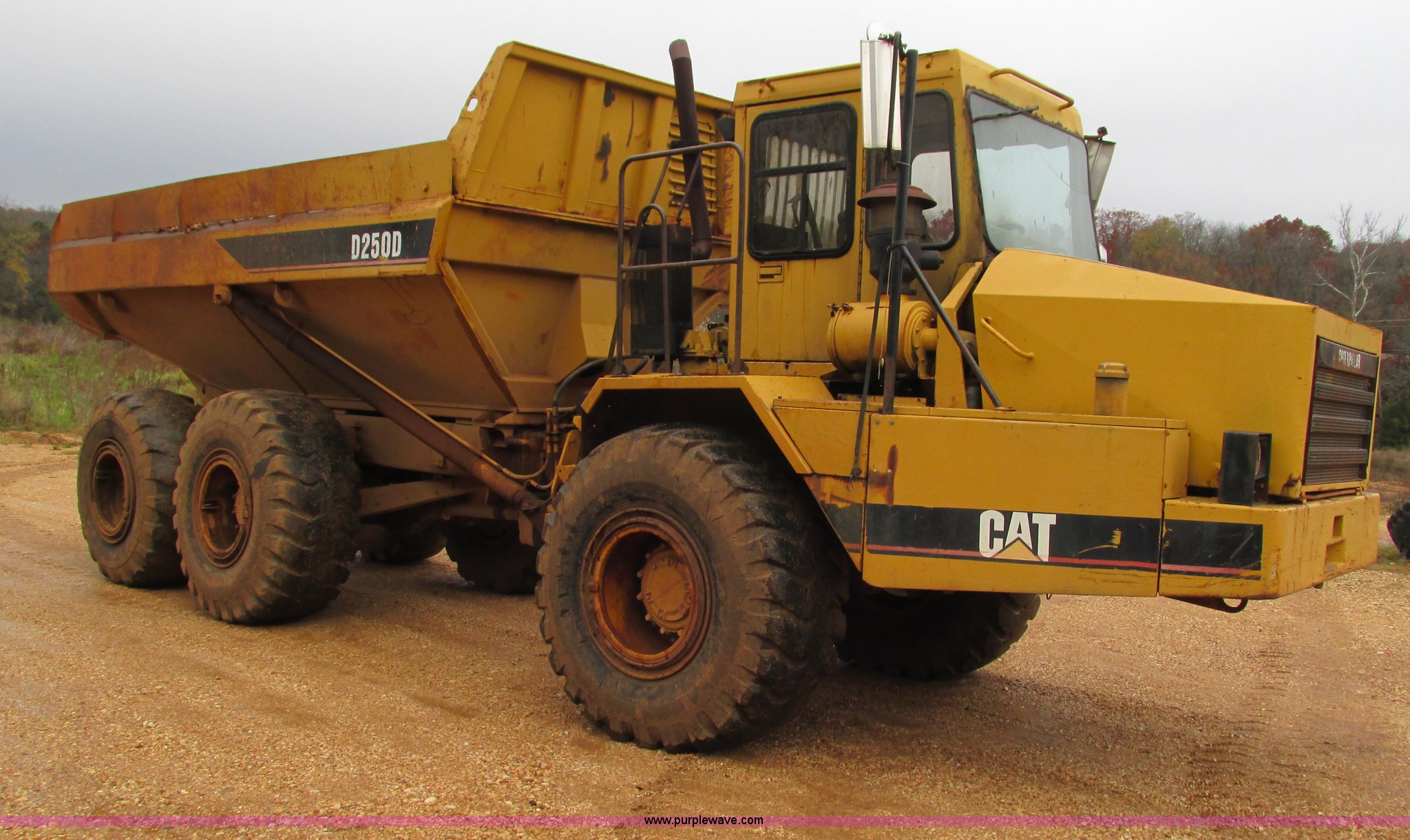 Purple Wave is selling a used Articulated Haul Truck in Missouri. This item is a Caterpillar D250D haul truck with the following: 10,947 hours on meter, Caterpillar 3116 six cylinder diesel engine, Automatic transmission, Spring suspension seat, Articulated hydraulic steering, Twin hoist cylinders, Approx. 16 cu. yd. capacity, 50,264 lbs payload capacity, Caterpillar Superflex suspension, Air acutated brakes, 23.5-25 tires, 38,000 lbs. base operating weight, Interior/exterior cosmetic damage, Windshield cracked, Glass missing, Rust, Non-operational parking brake, Tires cracked, Seat torn, Covers will be installed prior to auction, Serial 4TF037999Y8271