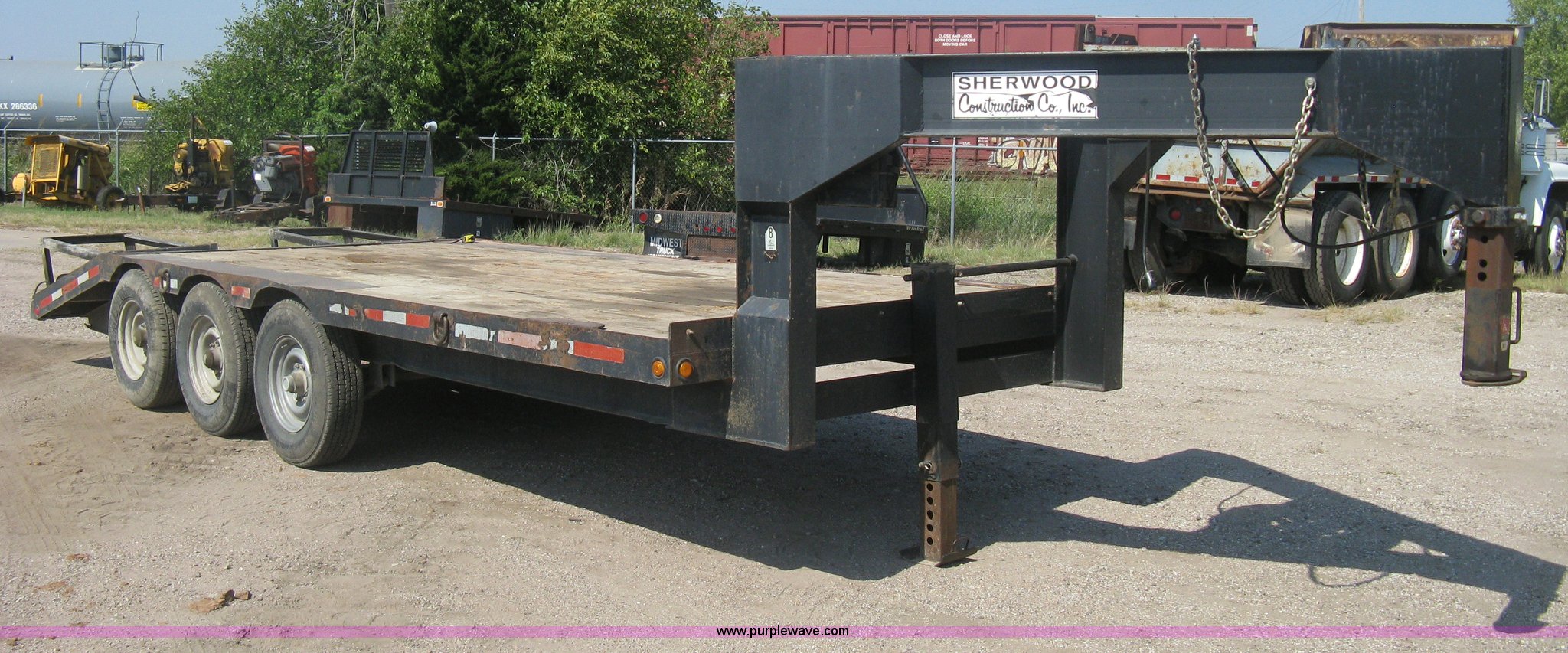 1981 JFW triple axle gooseneck trailer. 16'L x 8'W deck, 4'L steel dovetail, Wood floor, (2) fold up ramps, 48"L x 25"W, (4) D-ring tie downs, Steel wheels, Single post landing gear, Adjustable height hitch, Break-away safety chains, Break-away brake box, Six pin trailer wire plug-in, Shop built gooseneck hitch, originally bumper pull, Eight lug, LT215/85R16 tires, Unit# 15.98. 7105. Sherwood Construction. 3219 W May. Wichita, KS 67277