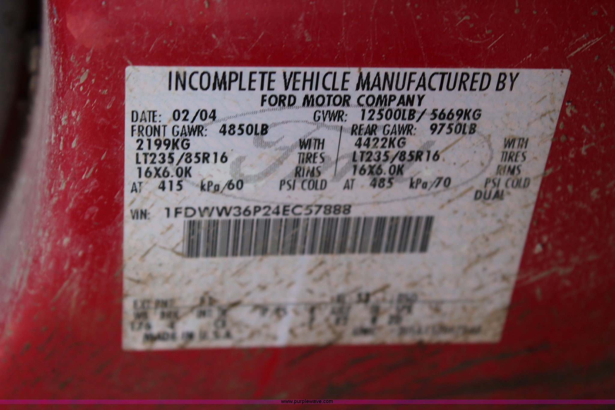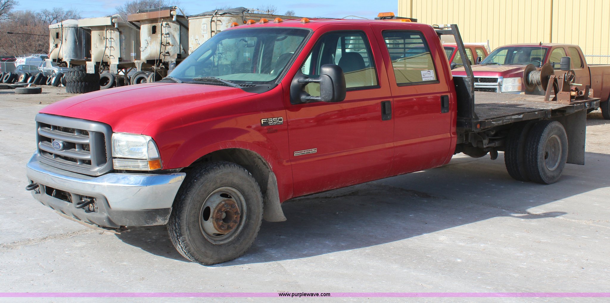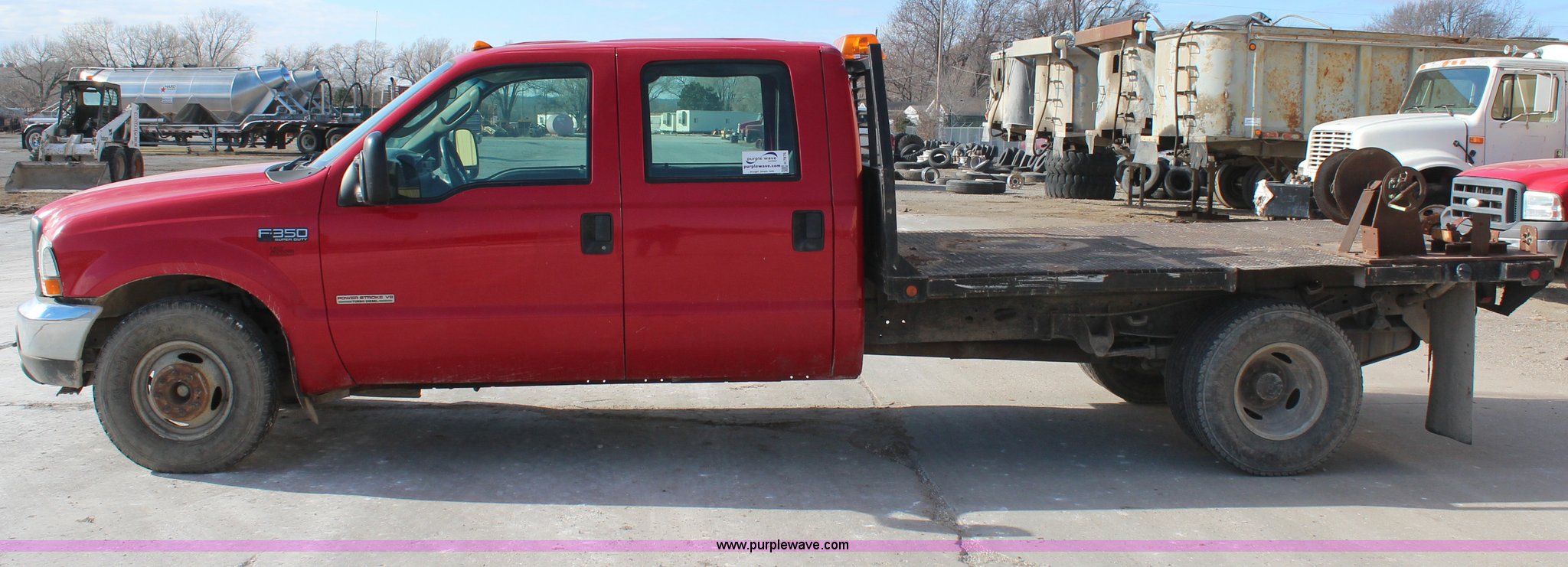 Purple Wave is selling a used Passenger Vehicle in Kansas. This item is a 2004 Ford F350 Crew Cab flatbed pickup truck with the following: 162514 miles on odometer, 6.0L V8 OHV 32V turbo diesel engine, Automatic transmission, AC and heat, AM/FM, Cruise, Manual windows and locks, 10'L x 7'9"W flatbed, Receiver hitch, Cloth interior, 235/85R16 tires
