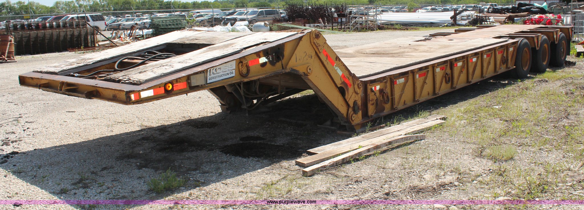 1979 LKI lowboy trailer. 39'L x 8'W overall, 29'L deck, 7' top deck, 3.5' neck, Fold down neck, Spring suspension, Air brakes, 8.25R15 tires. 8115. Koss Construction Company. SW Pauline Road. Topeka, KS 66609