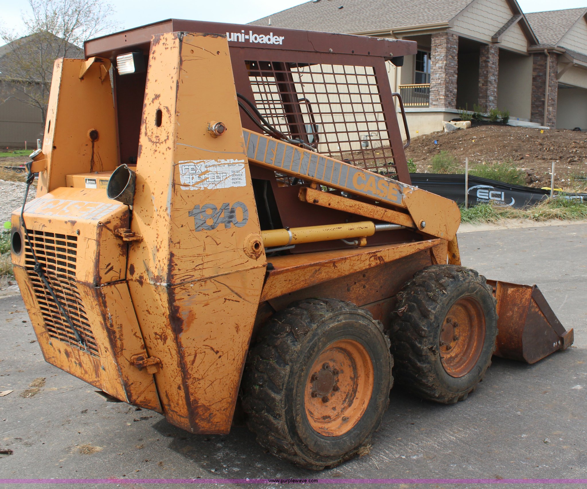Purple Wave is selling a used Skid Steer Loader in Kansas. This item is a 1992 Case 1840 skid steer with the following: 1,021 hours on meter, Four cylinder diesel engine, 51 HP, Auxiliary hydraulics, 63" bucket, 1,400 lbs operating load rating, 10-16.5 foam-filled tires, Lights are broken, 5,558 lbs. base operating weight, Serial JAF0078205
