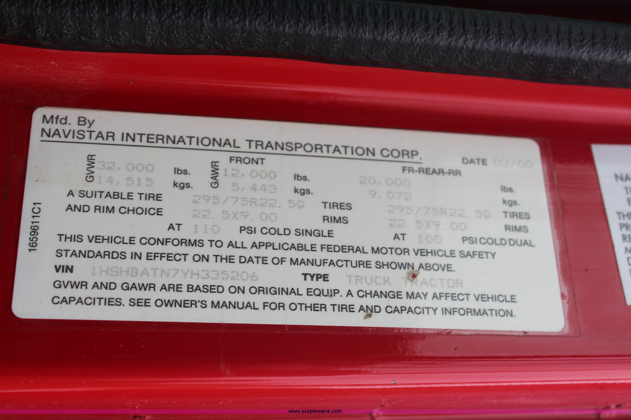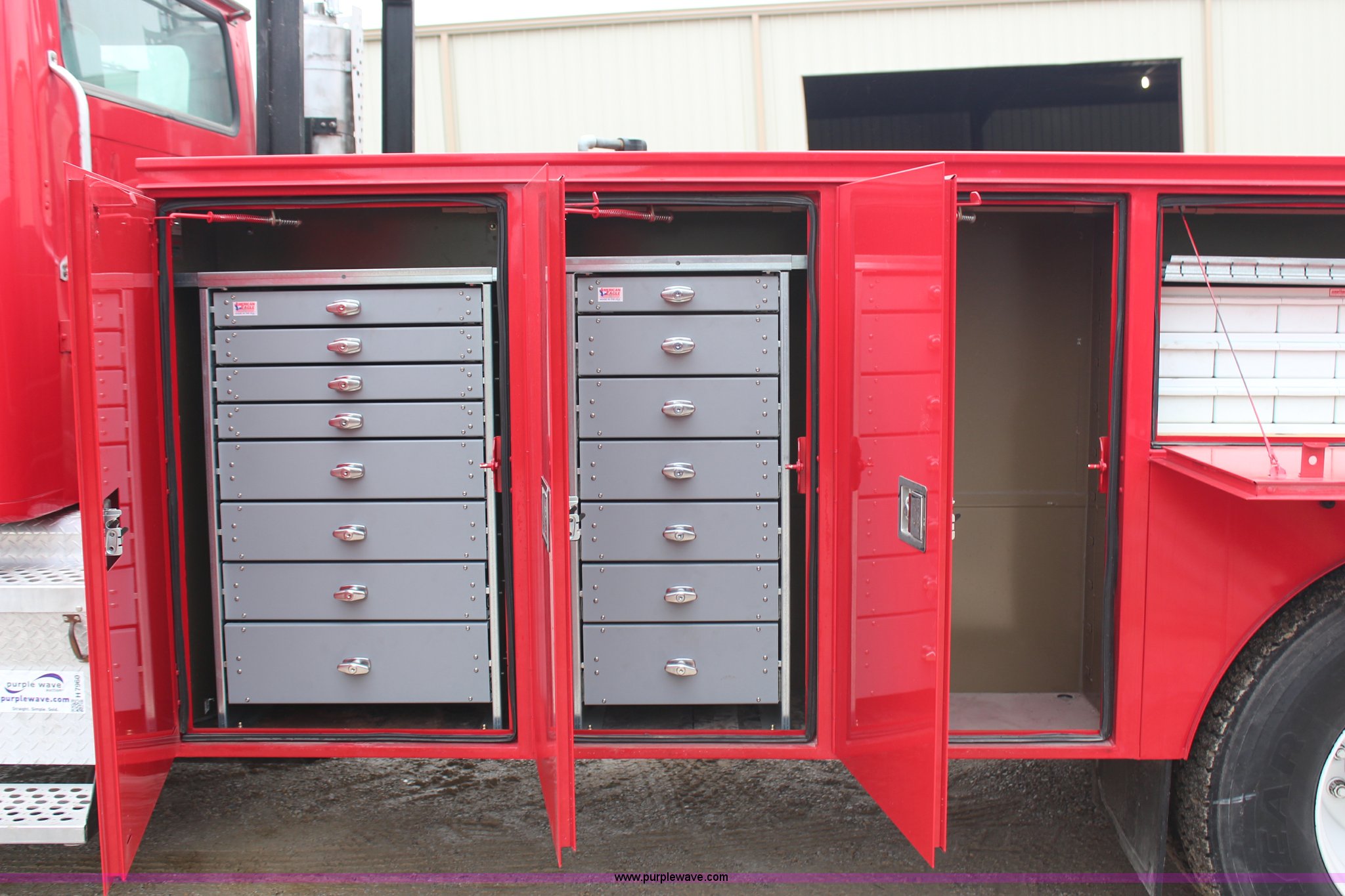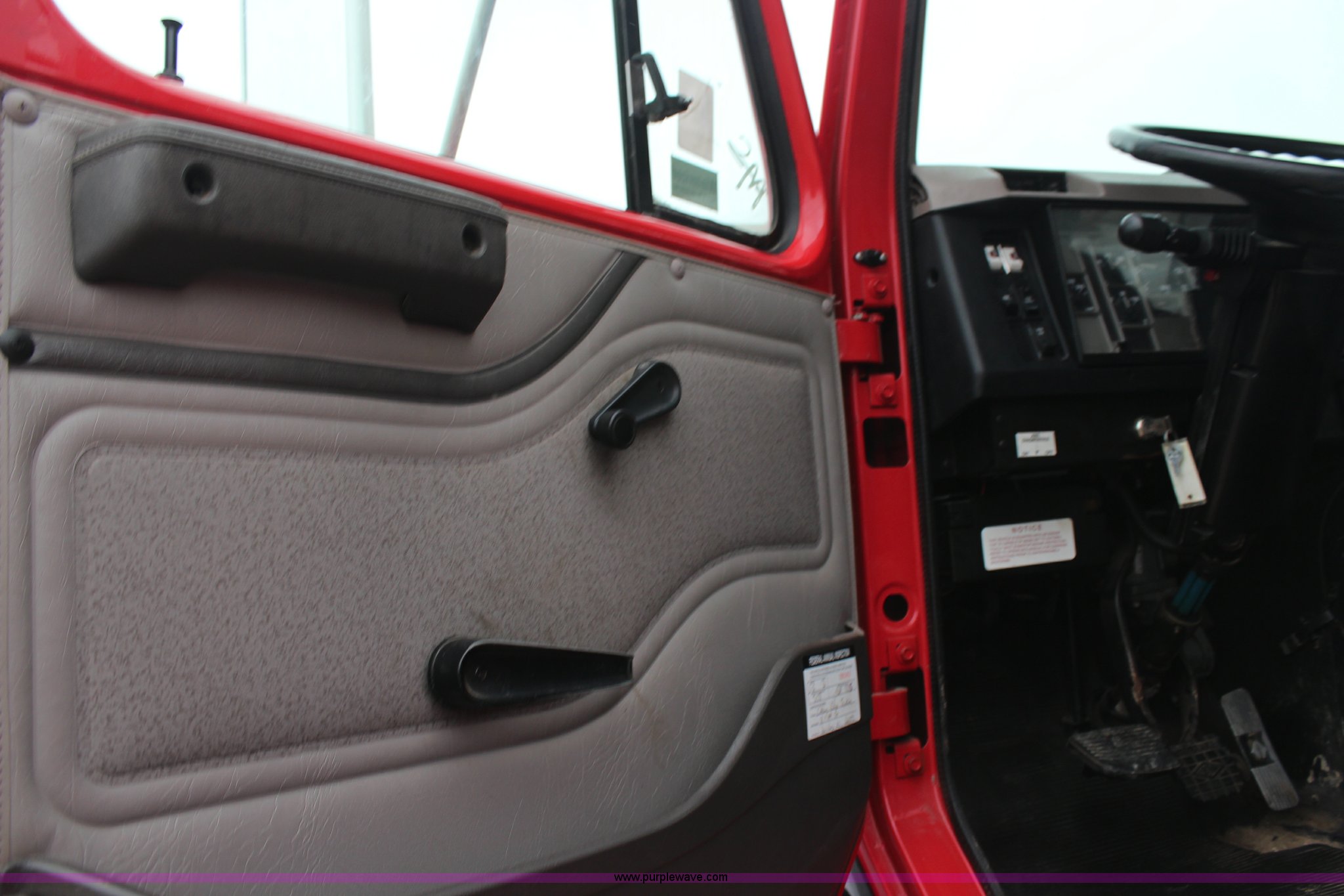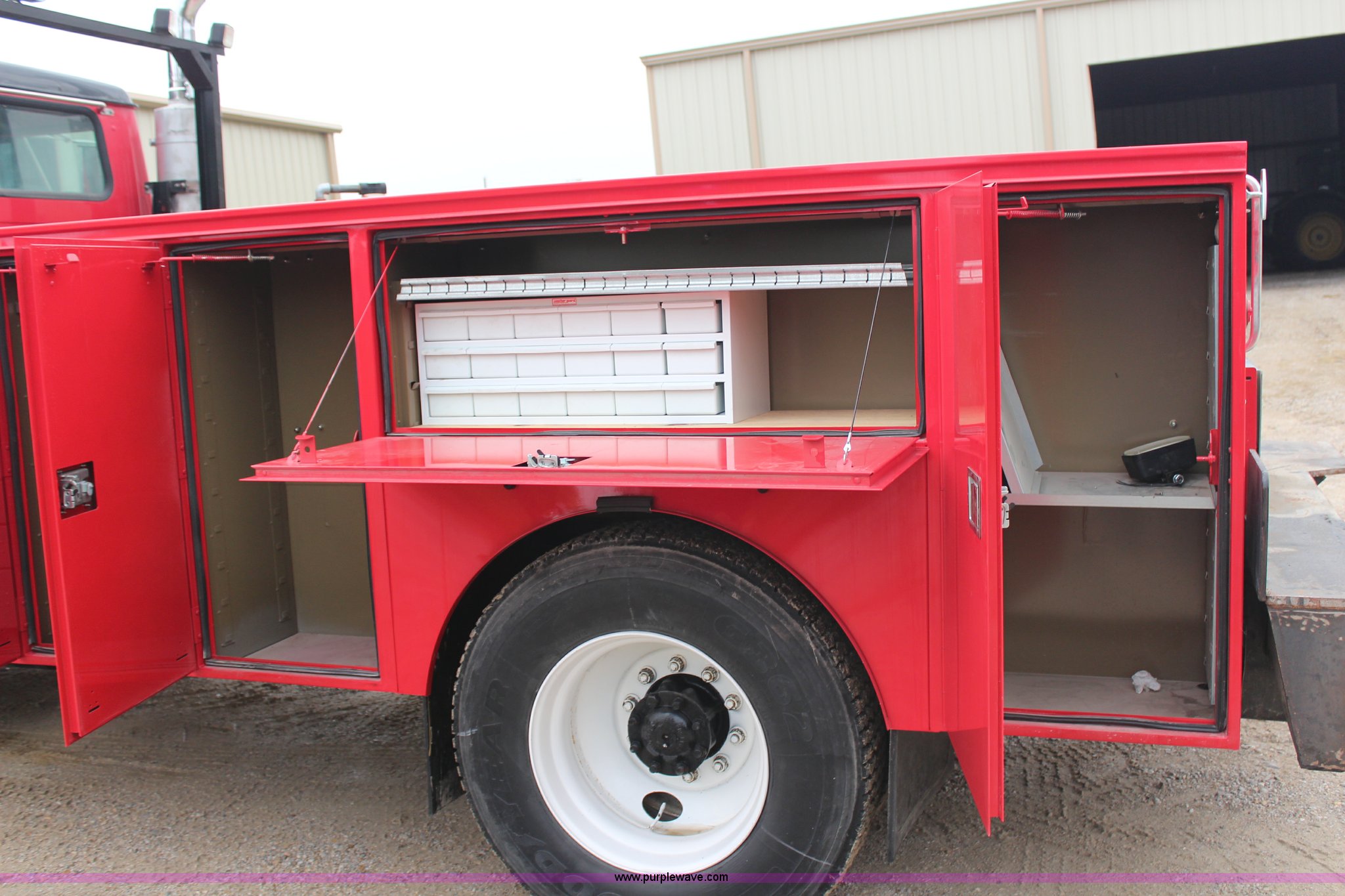 Purple Wave is selling a used Service Truck in Kansas. This item is a 2000 International 8100 service truck with the following: 355,518 miles on odometer, 14,629 hours on meter, Caterpillar 3126 diesel engine, Nine speed manual transmission, Cruise, AM/FM/cassette, 2012 Omaha bed, 13'L, 16"L rear bumper, 300 gallon fuel transfer tank, Pump, Work lights, Pintle hitch, Rear air hookup, 100 gallon fuel tank, Aluminum front wheels, Torch and plastic bins not included