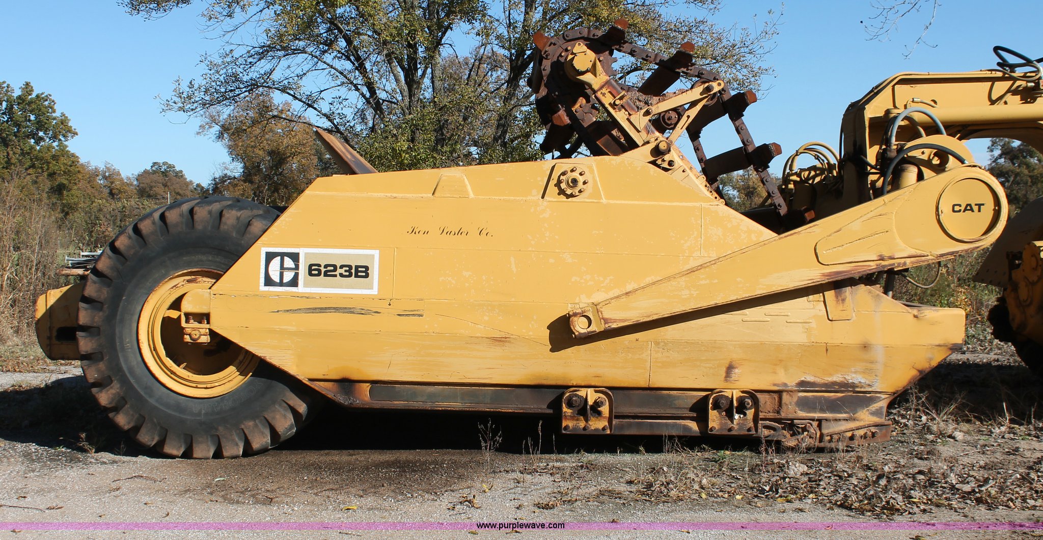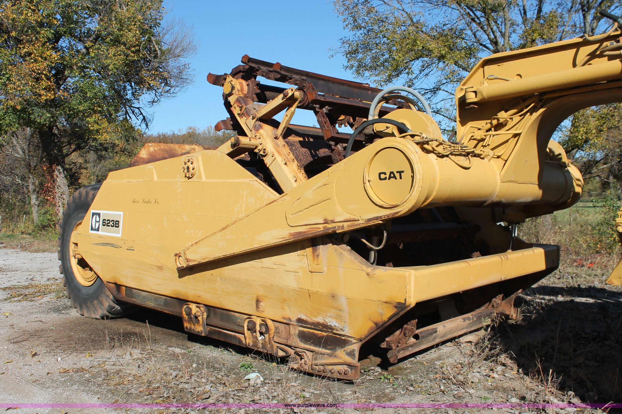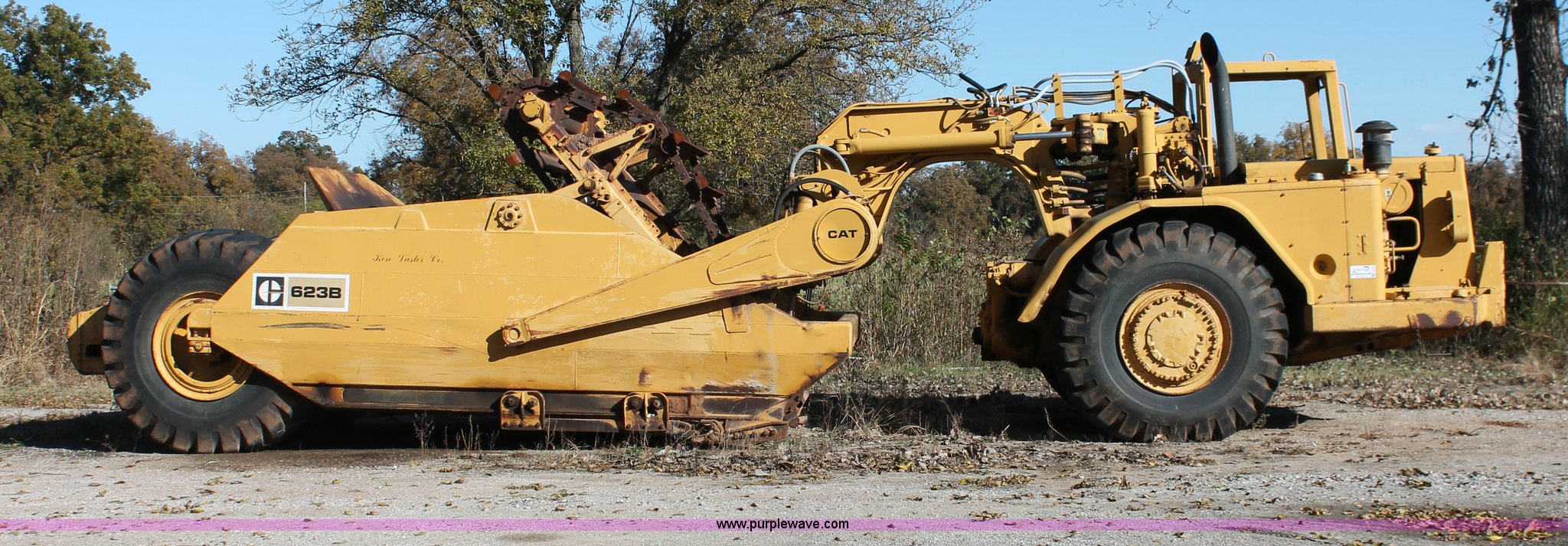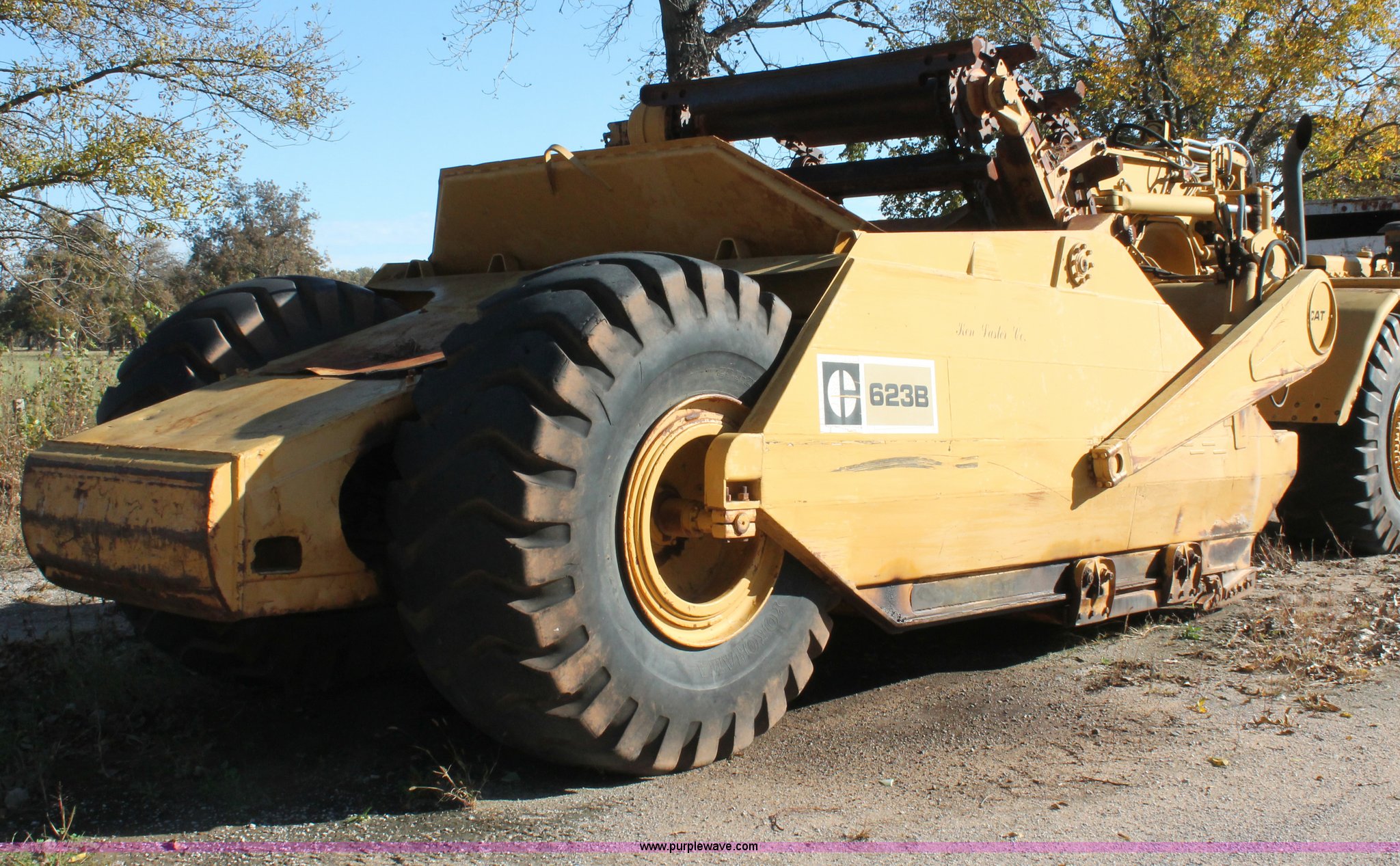 Purple Wave is selling a used Elevating Scraper in Oklahoma. This item is a 1975 Caterpillar 623B elevating scraper with the following: 5,599 hours on meter, Caterpillar 3406PC engine, 8F-1R gears, OROPS, Front work lights, 86"W paddles, 120"W cut, 23 yd. heaped bowl capacity, Floating hitch, Recently replaced Yokohoma 29.5-29 tires, 33,325 lbs. base operating weight, Scraper serial 61L704, Serial 46P688