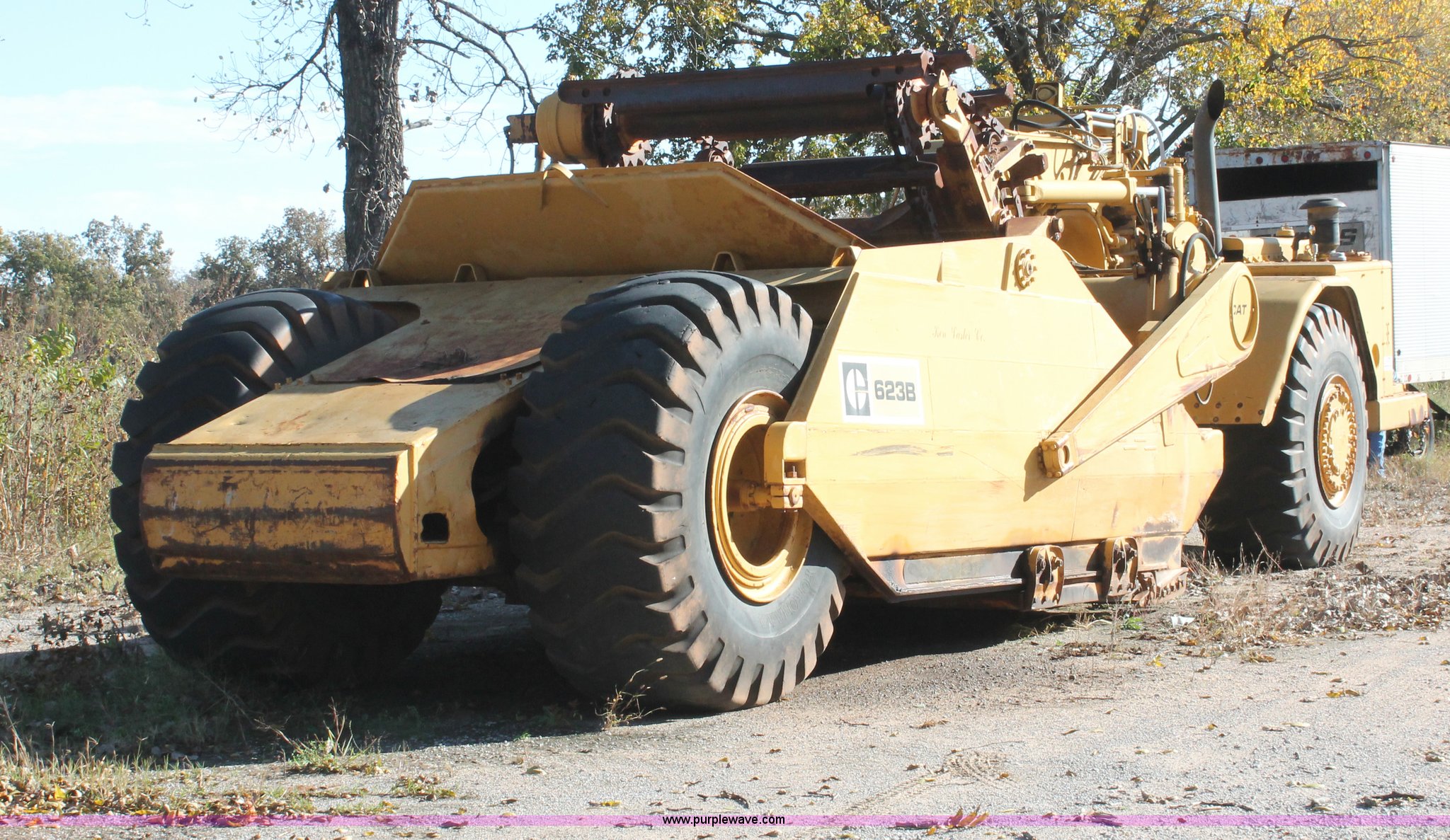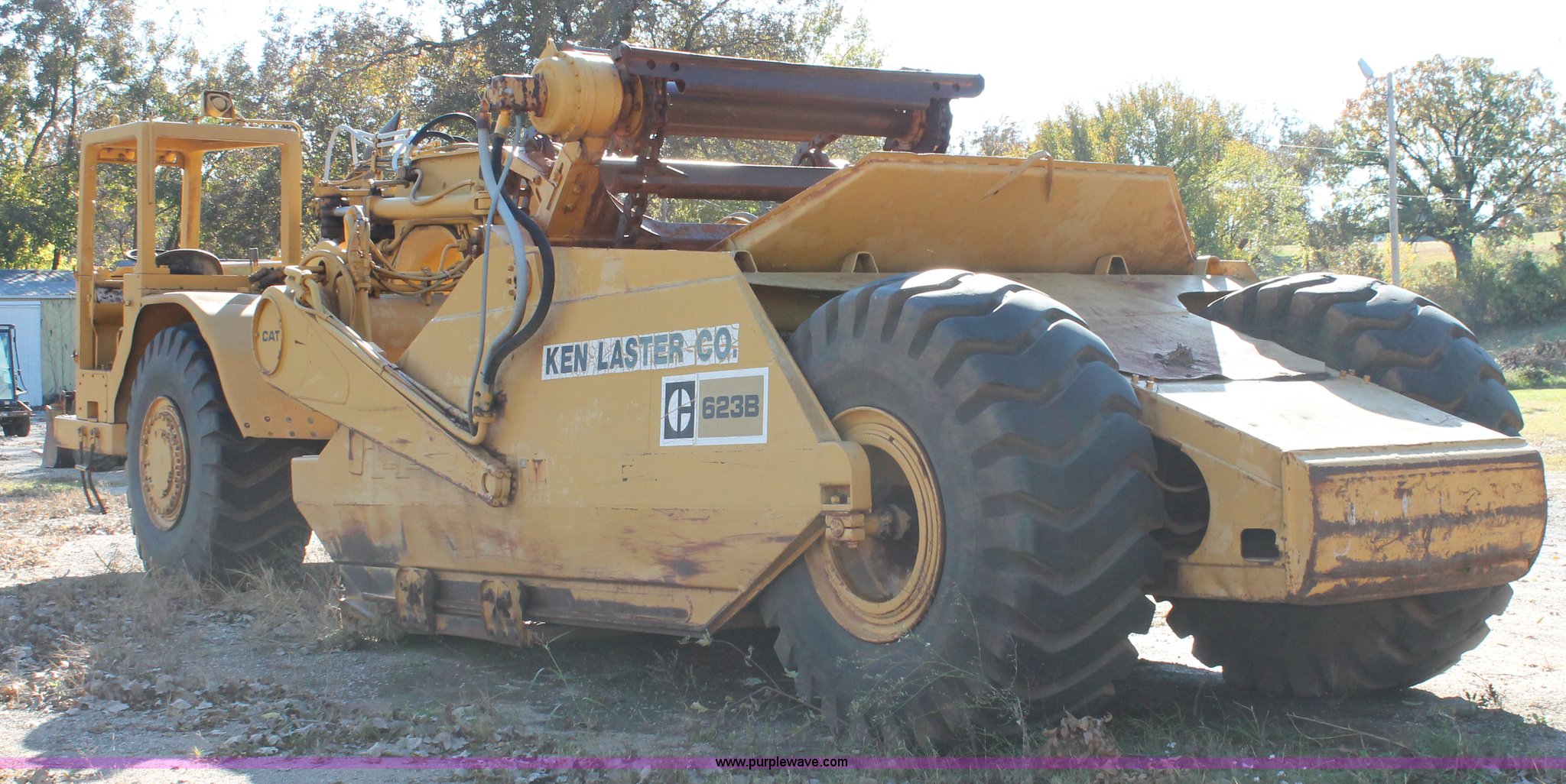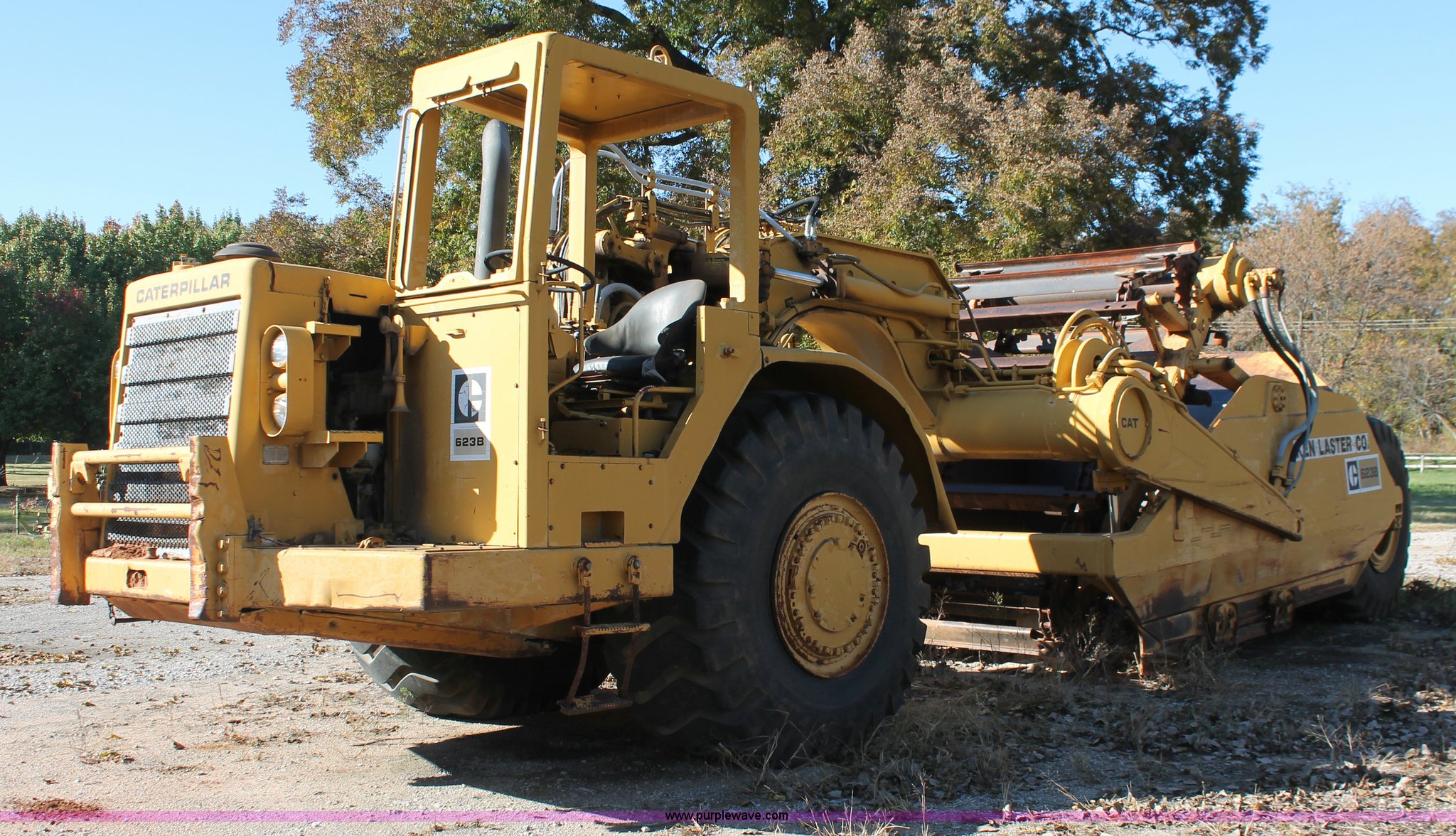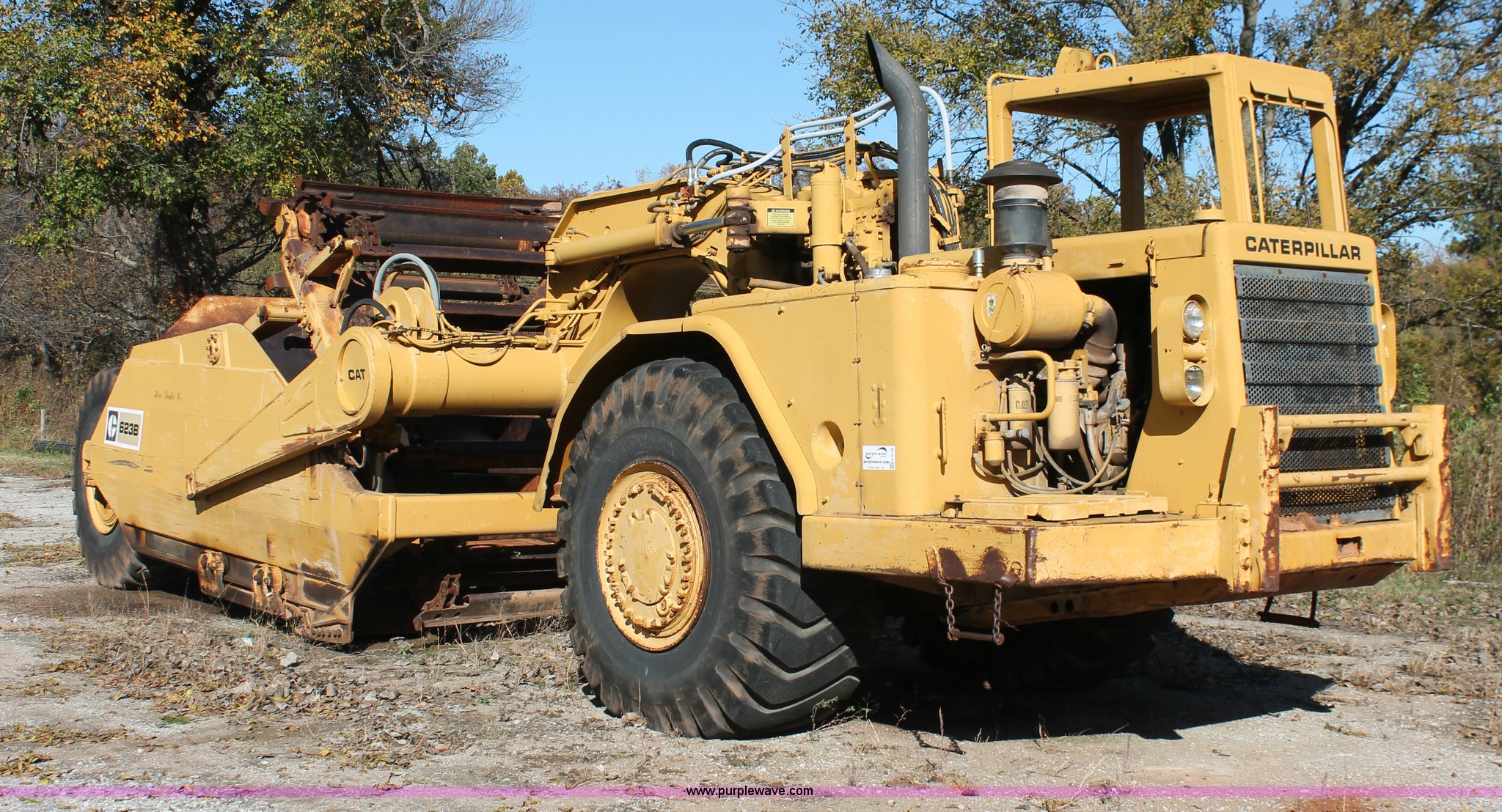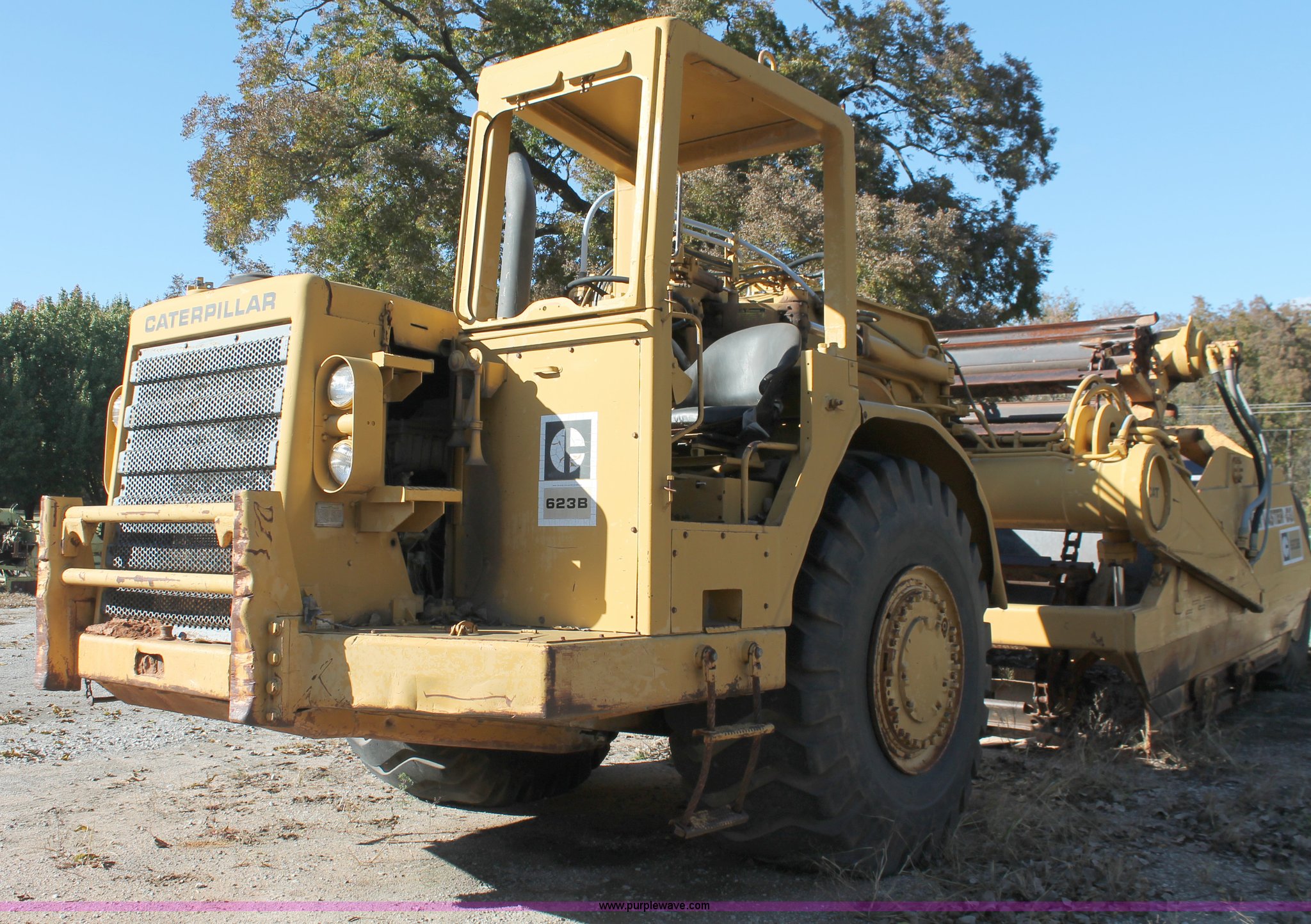 Purple Wave is selling a used Elevating Scraper in Oklahoma. This item is a 1975 Caterpillar 623B elevating scraper with the following: 5,599 hours on meter, Caterpillar 3406PC engine, 8F-1R gears, OROPS, Front work lights, 86"W paddles, 120"W cut, 23 yd. heaped bowl capacity, Floating hitch, Recently replaced Yokohoma 29.5-29 tires, 33,325 lbs. base operating weight, Scraper serial 61L704, Serial 46P688