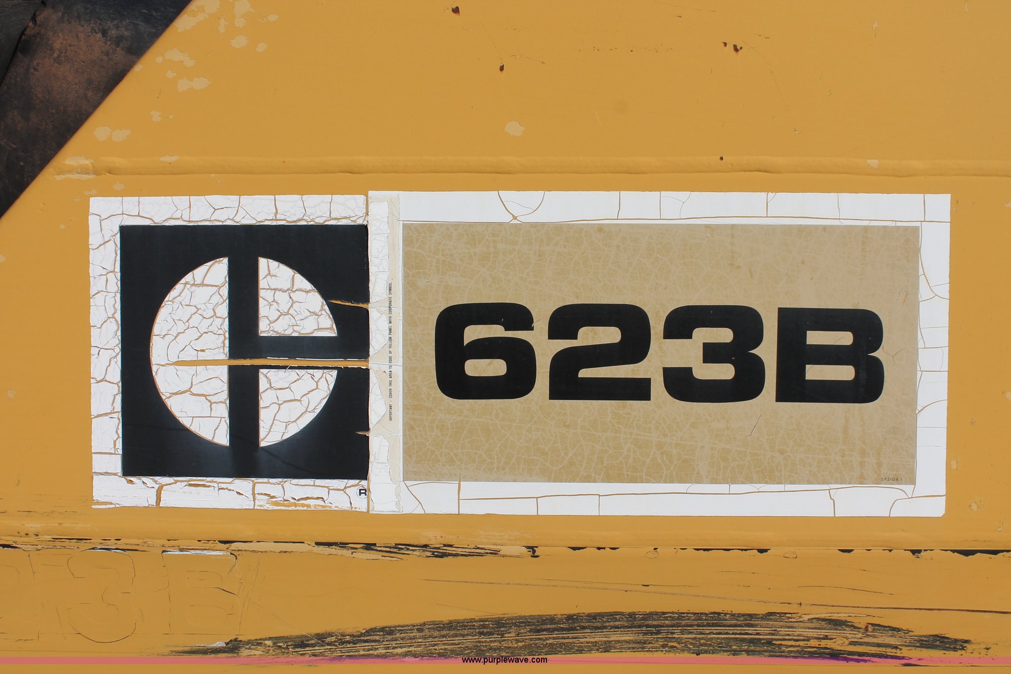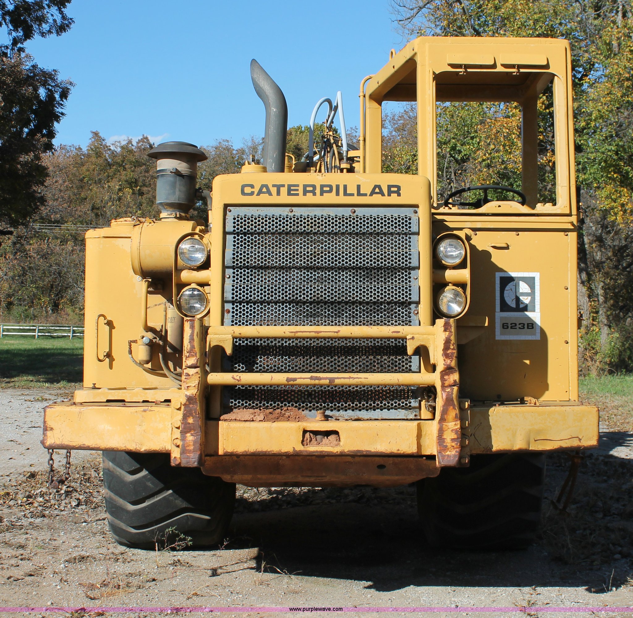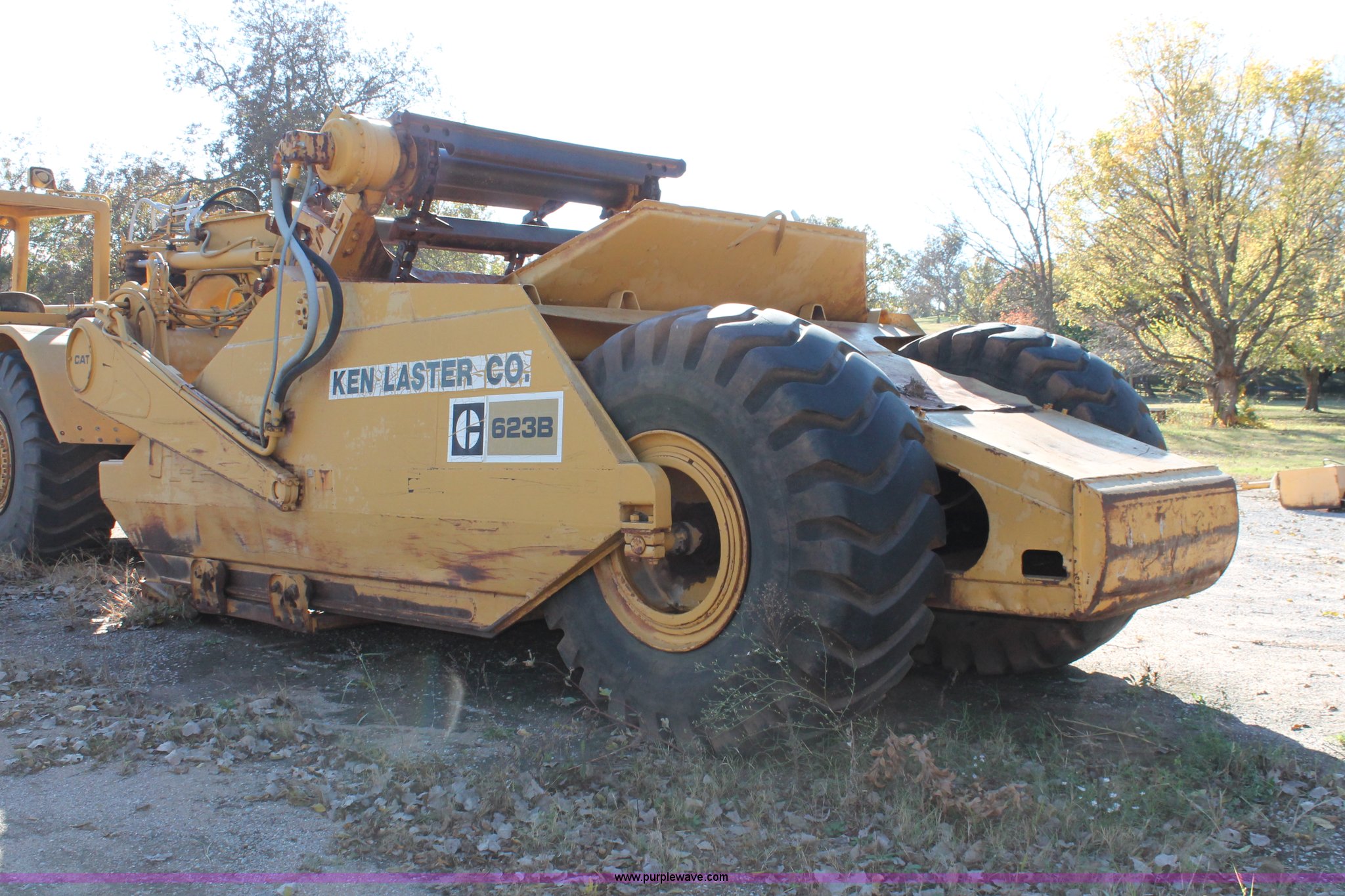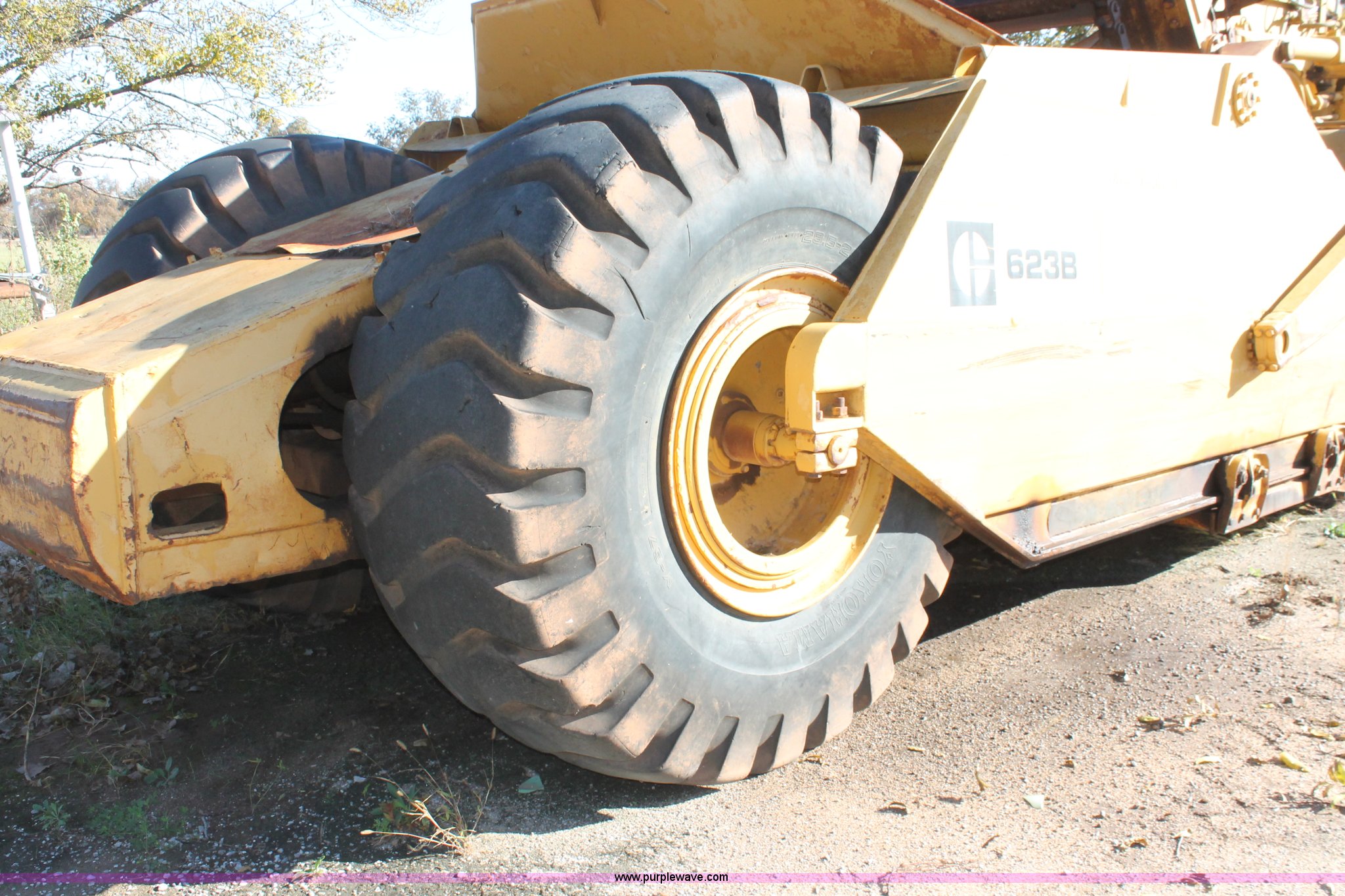 Purple Wave is selling a used Elevating Scraper in Oklahoma. This item is a 1975 Caterpillar 623B elevating scraper with the following: 5,599 hours on meter, Caterpillar 3406PC engine, 8F-1R gears, OROPS, Front work lights, 86"W paddles, 120"W cut, 23 yd. heaped bowl capacity, Floating hitch, Recently replaced Yokohoma 29.5-29 tires, 33,325 lbs. base operating weight, Scraper serial 61L704, Serial 46P688