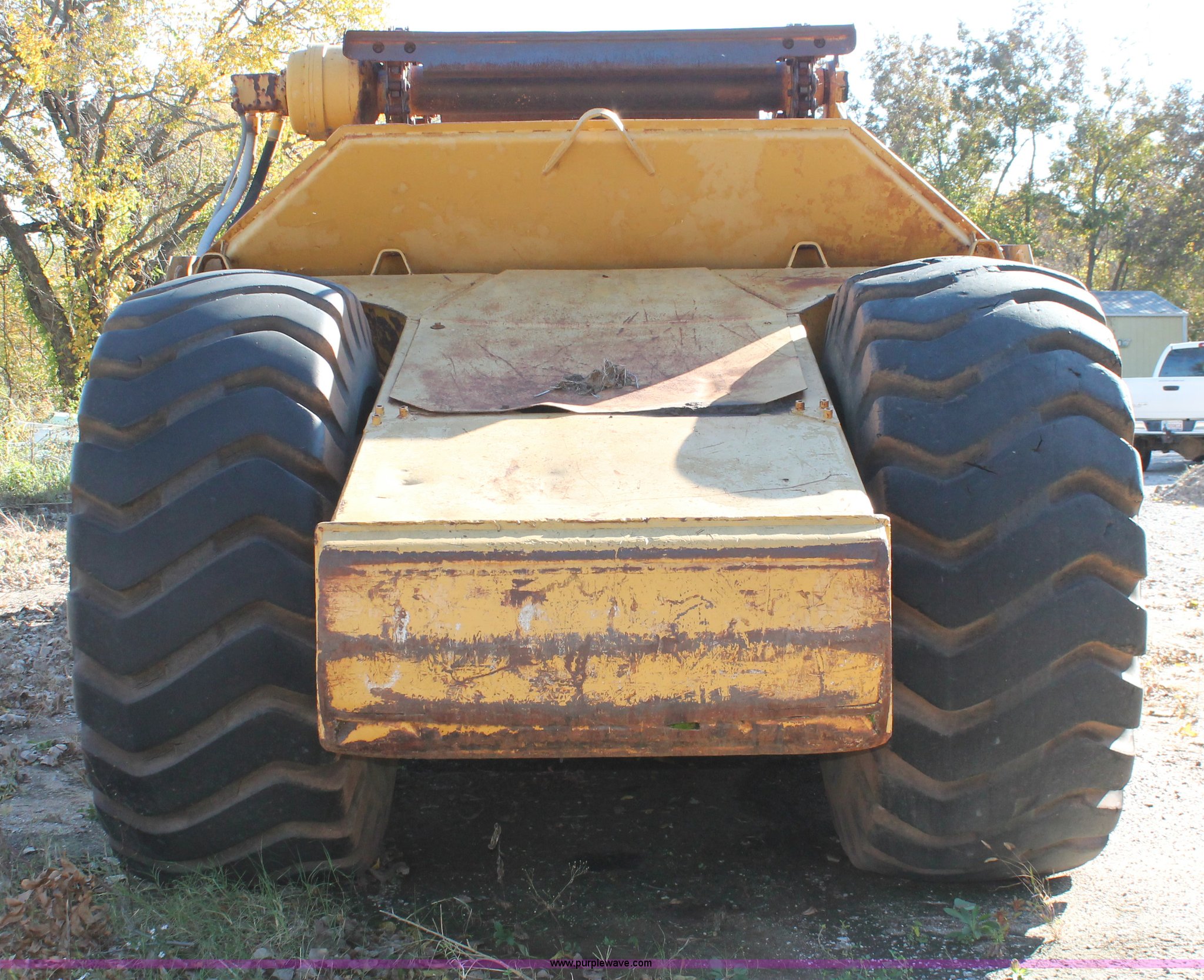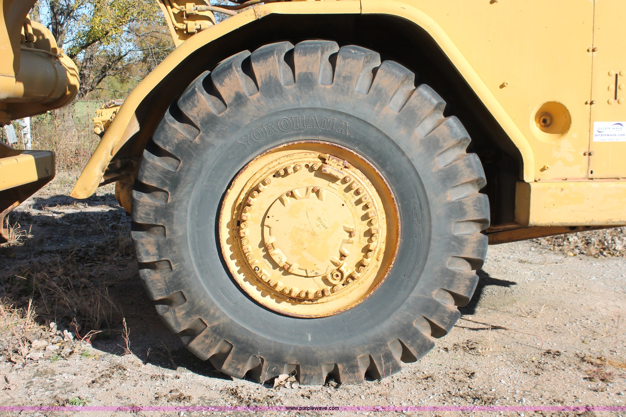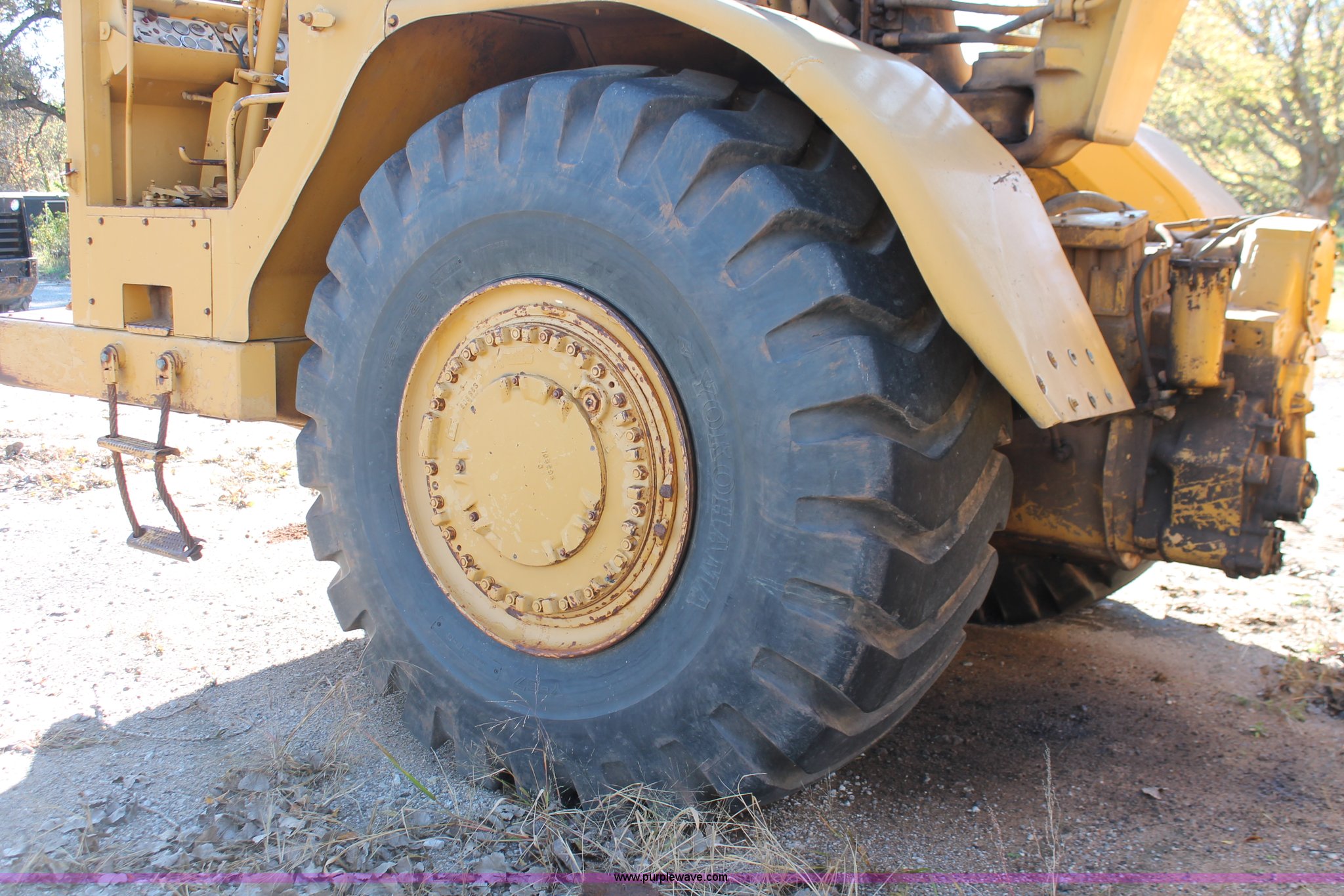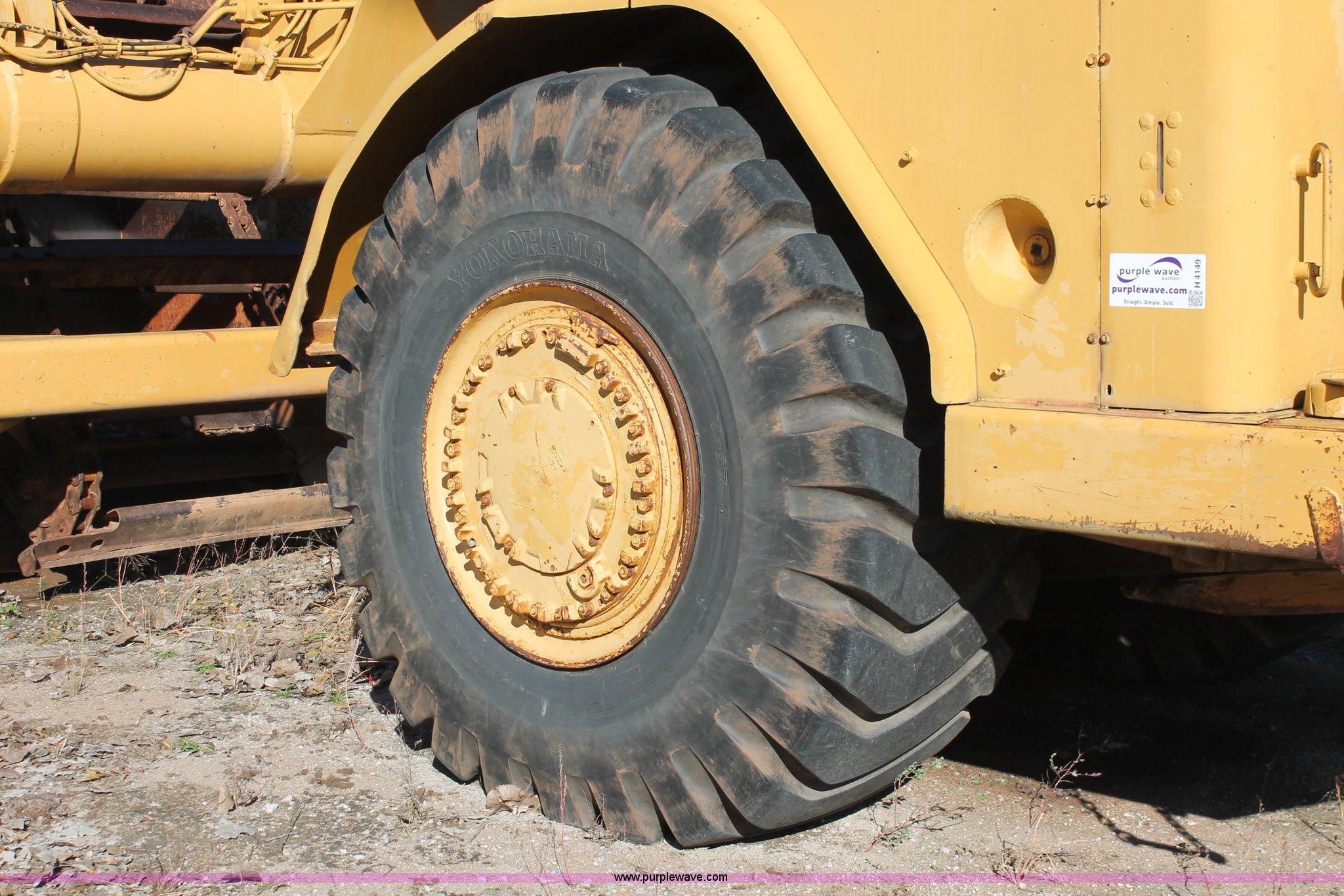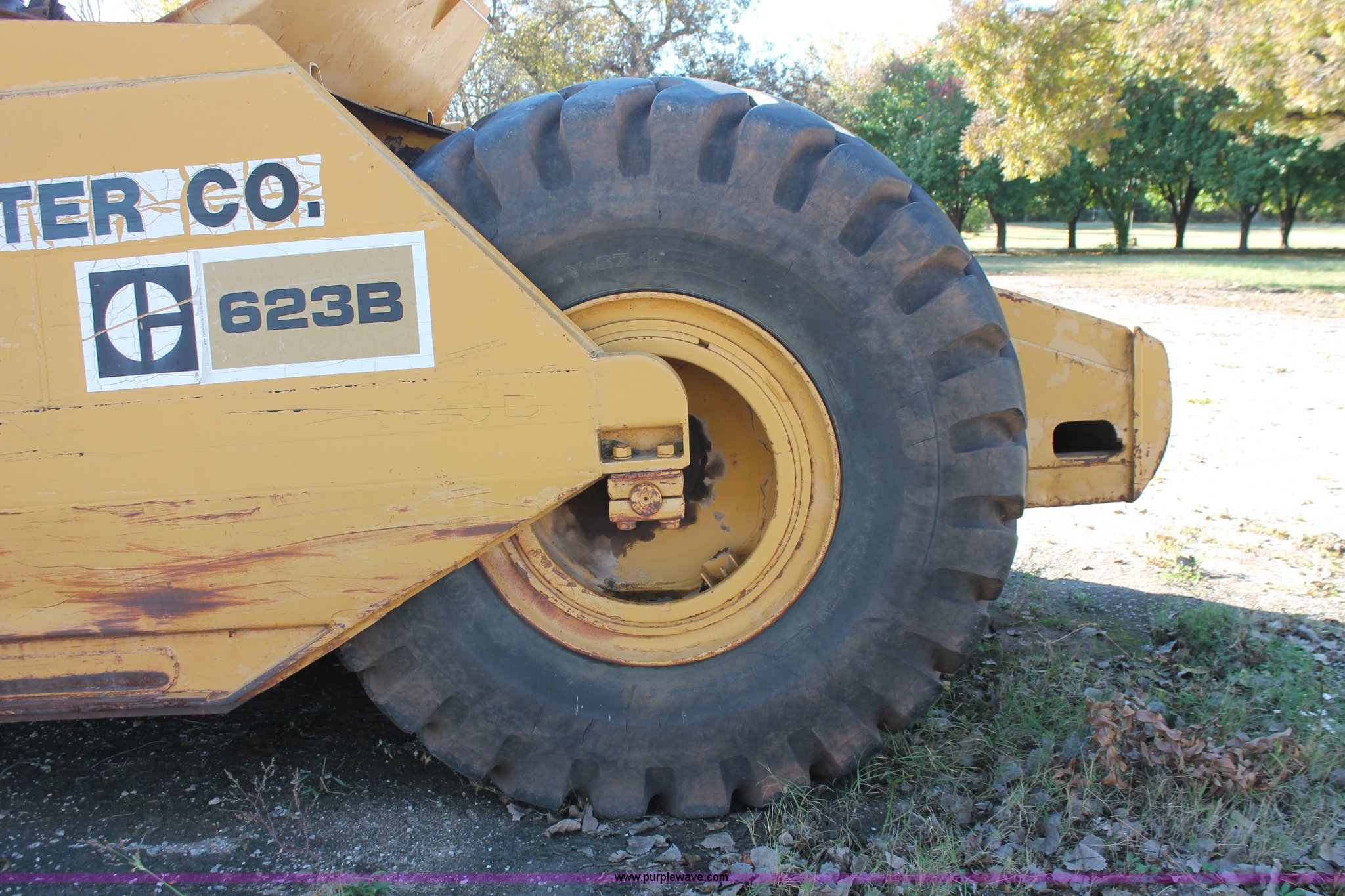 Purple Wave is selling a used Elevating Scraper in Oklahoma. This item is a 1975 Caterpillar 623B elevating scraper with the following: 5,599 hours on meter, Caterpillar 3406PC engine, 8F-1R gears, OROPS, Front work lights, 86"W paddles, 120"W cut, 23 yd. heaped bowl capacity, Floating hitch, Recently replaced Yokohoma 29.5-29 tires, 33,325 lbs. base operating weight, Scraper serial 61L704, Serial 46P688