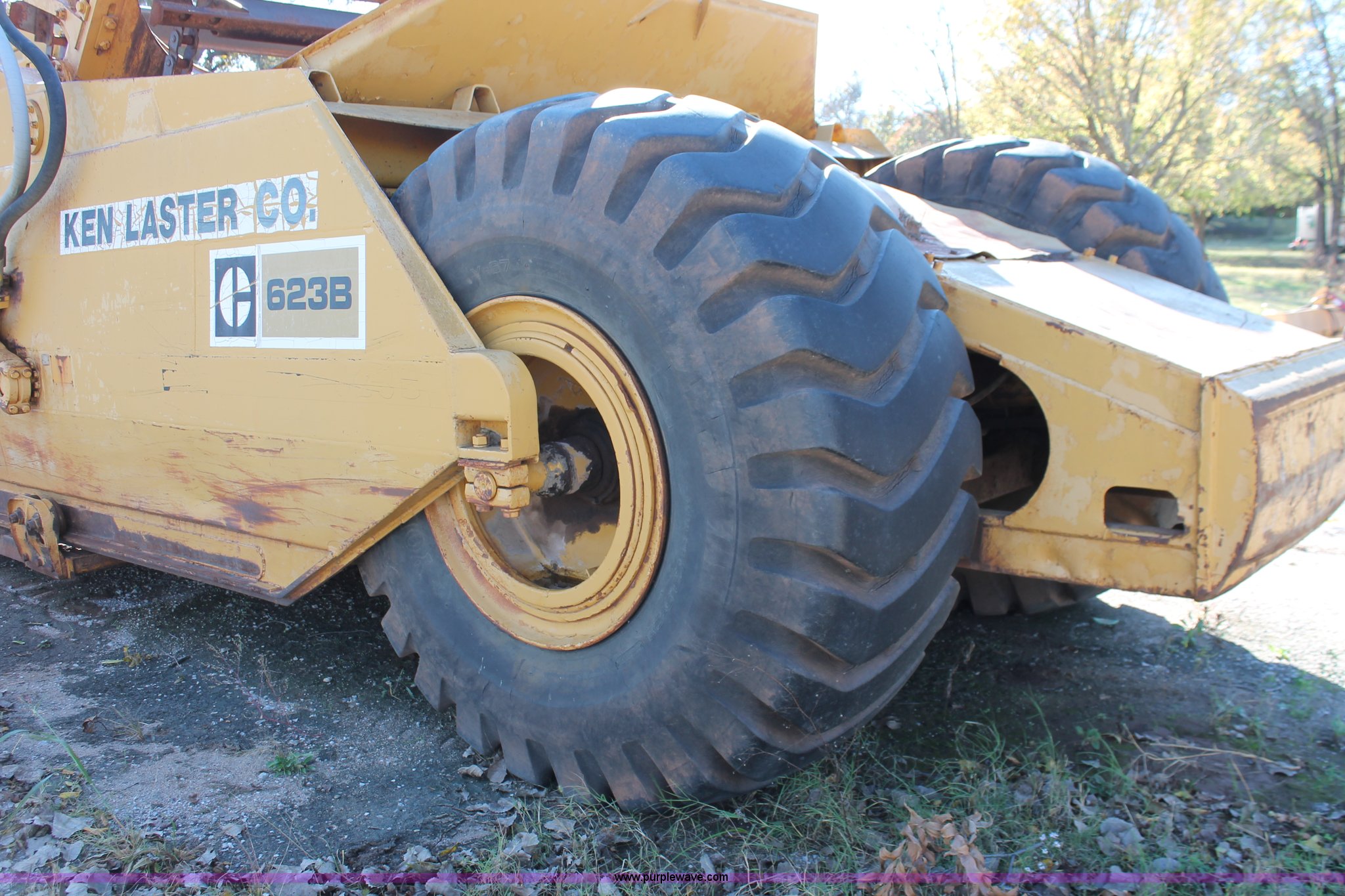 1975 Caterpillar 623B elevating scraper. 5,599 hours on meter, Caterpillar 3406PC engine, 8F-1R gears, OROPS, Front work lights, 86"W paddles, 120"W cut, 23 yd. heaped bowl capacity, Floating hitch, Recently replaced Yokohoma 29.5-29 tires, 33,325 lbs. base operating weight, Scraper serial 61L704, Serial 46P688. View equipment video. Laster Construction. 6911 E 151st. Bixby, OK 74008