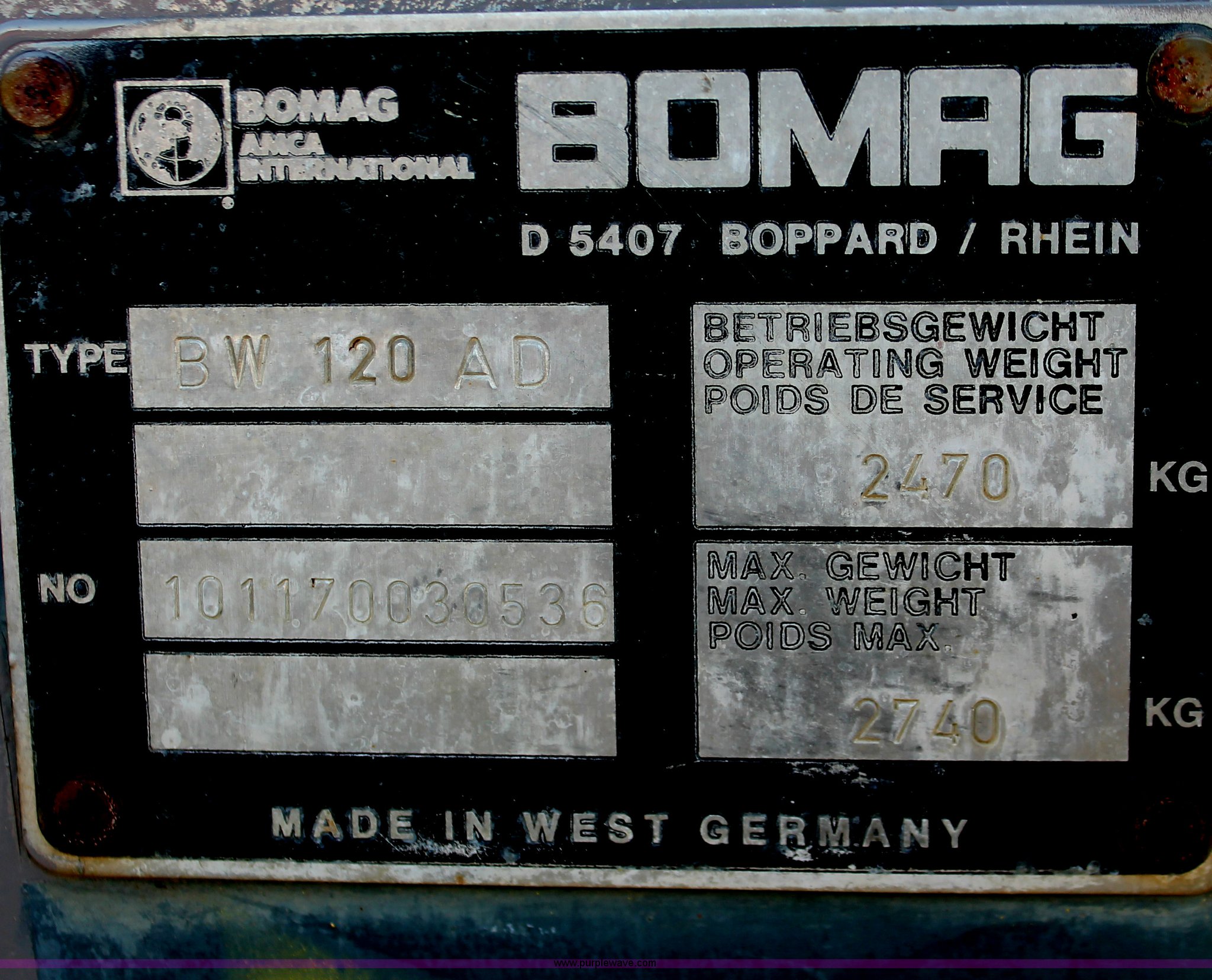 Purple Wave is selling a used Double Drum Roller Compactor in Oklahoma. This item is a 1990 Bomag BW120AD vibratory roller with the following: 2,328 hours on meter, Deutz two cylinder engine, Model 7716002, 23.5 kW, Type F21511, Front and rear fluid, 26" diameter rollers, 46"W rollers, 5,088 lbs. base operating weight, Serial 101170030536