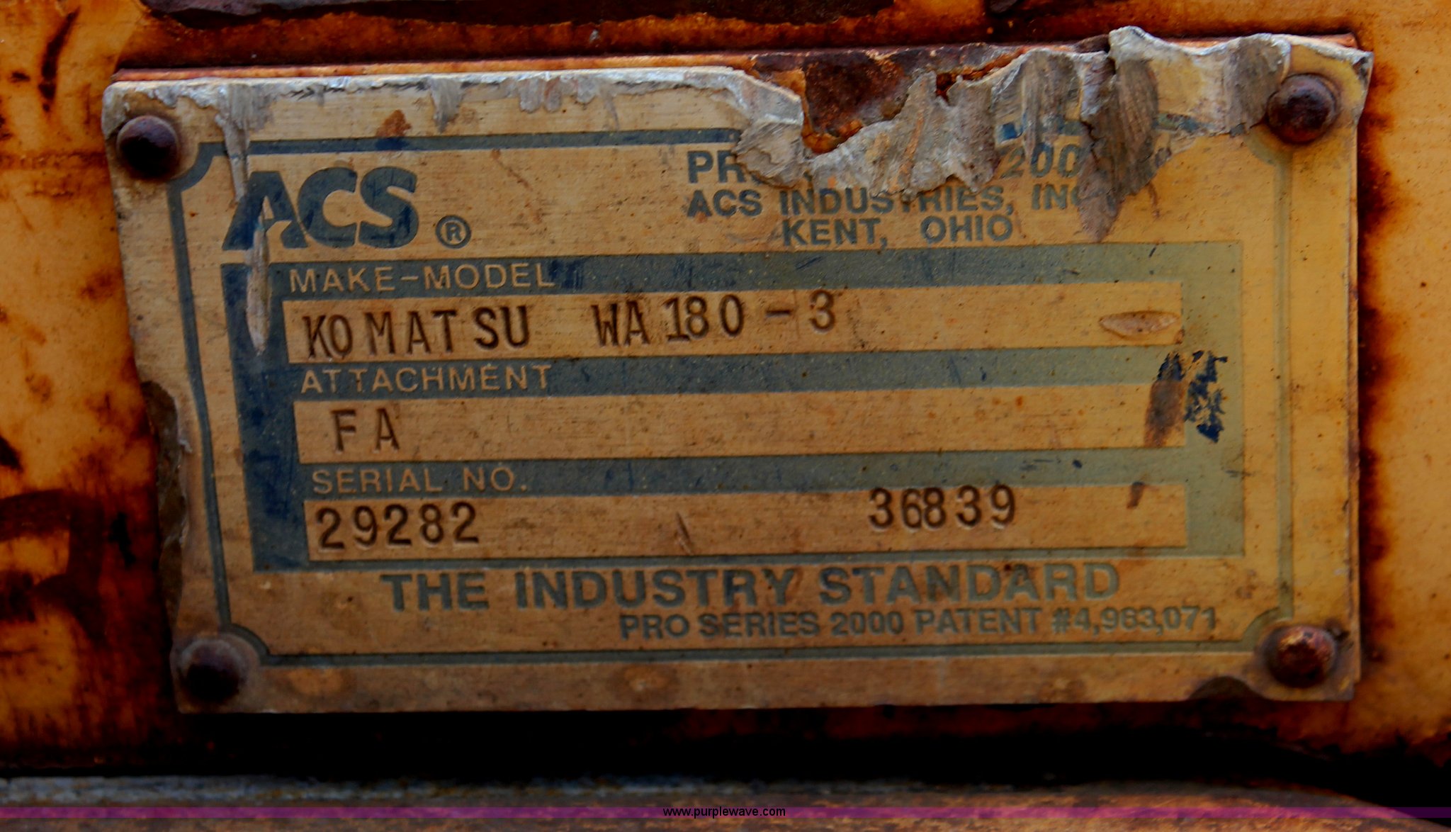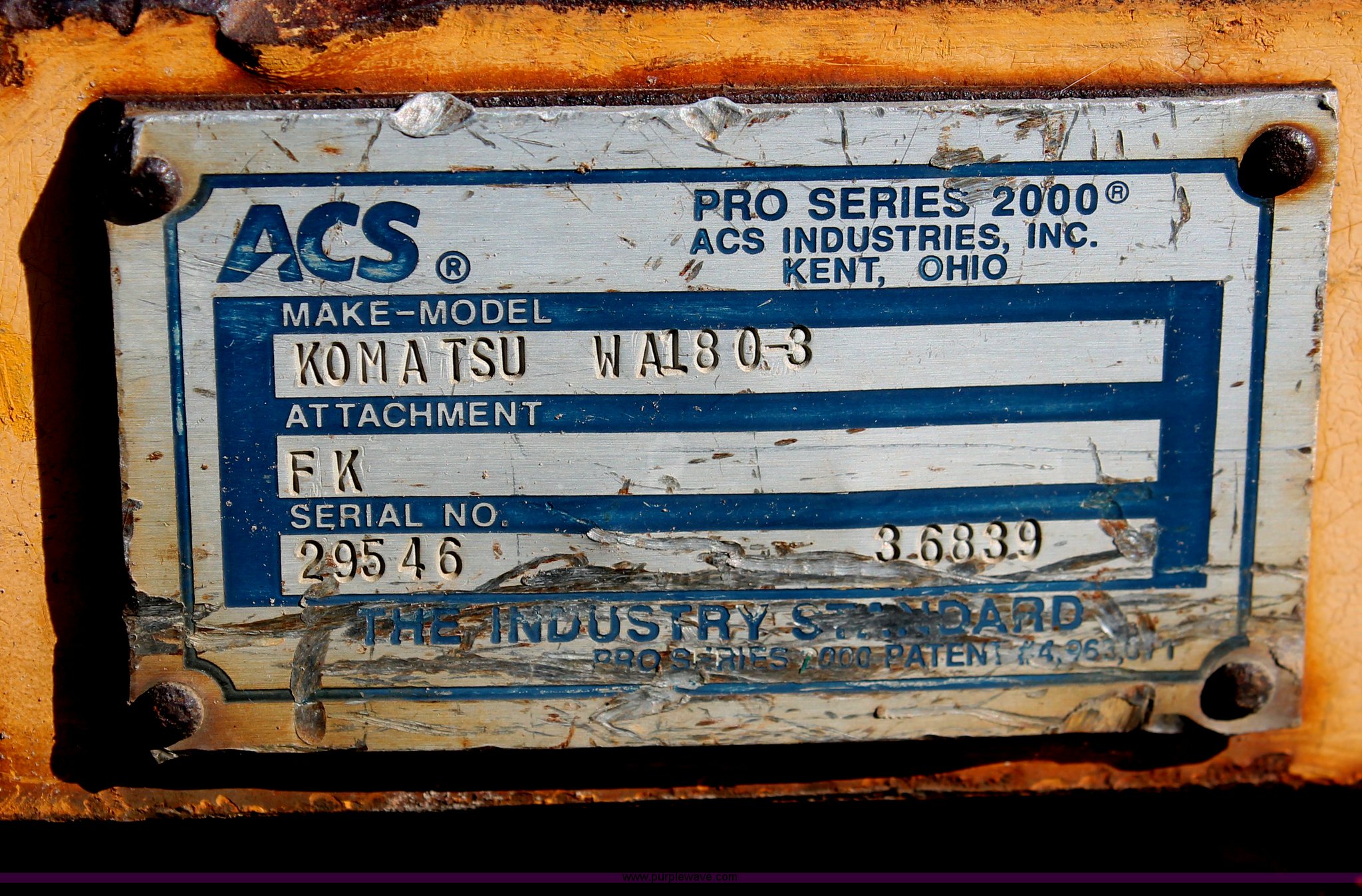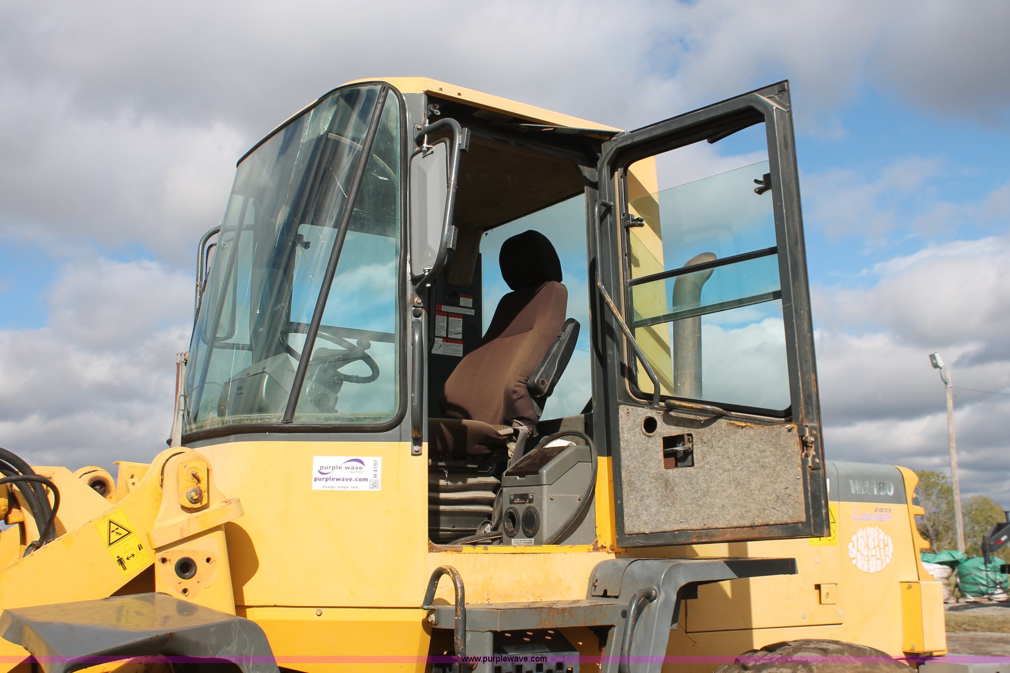 Purple Wave is selling a used Wheel Loader in Oklahoma. This item is a 1999 Komatsu WA180-3L Advance articulated wheel loader with the following: 6,187 hours on meter, Komatsu 5.9L six cylinder diesel engine, Model S6D102E-1, Serial 45717849, Four speed powershift transmission, Enclosed cab, AC and heat, Spring suspension seat, Front work lights, Joystick loader control, Front and rear windshield wipers, ACS quick attach, Serial 29160, ACS 96" bucket, Smooth bolt-on edge, Serial 29282, ACS quick attach forks, 48" x 6" forks, Adjustable forks, Serial 29546, Rear counter weight, Pin hitch, Bridgestone V-Steele K-traction 17.5R25 tires, 20,816 lbs. base operating weight, Cracked glass, Serial A80305