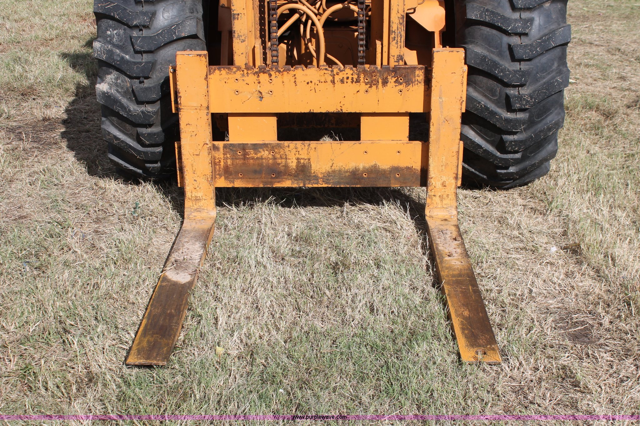 Purple Wave is selling a used Strt. Mast Rough Terr. Forklift in Oklahoma. This item is a 1989 Case 584E Construction King forklift with the following: 2,446 hours on meter, Case four cylinder diesel engine, Forward and reverse gears, Four wheel drive, Differential lock, OROPS, Front work lights, Three stick hydraulic operation, Lift, Tilt, Side shift, 48" x 5" forks, Width adjustable, Two stage mast, 21.5' max height, 4,000 lbs lift capacity, 19.5L-24 front tires, 12-16.5 rear tires, 14,000 lbs. base operating weight, Serial JJG0068460