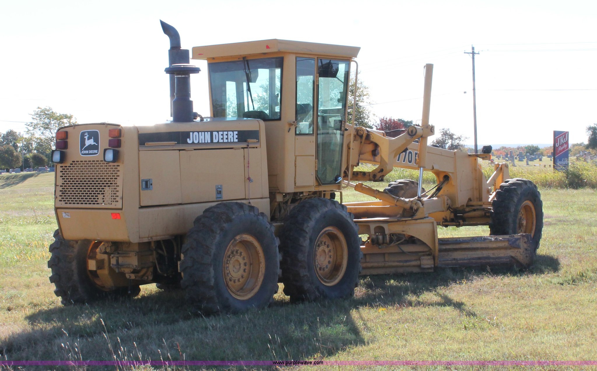 Purple Wave is selling a used Motor Grader in Oklahoma. This item is a 1995 John Deere 770BH articulated motor grader with the following: 14,121 hours on meter, John Deere 6076ADW31 diesel engine, 165 HP, Serial RG6076A548447, Powershift transmission, 8F-4R gears, Differential lock, Enclosed cab, AC and heat, AM/FM, Front and rear work lights, Windshield wipers, High cab profile, 14' moldboard, Side shift, Five tooth scarifier, (9) tooth capacity, Nine blade control valves, Titan 14.00-24TG tires, 31,300 lbs. base operating weight, Tires replaced 2011, Serial DW770BH551153
