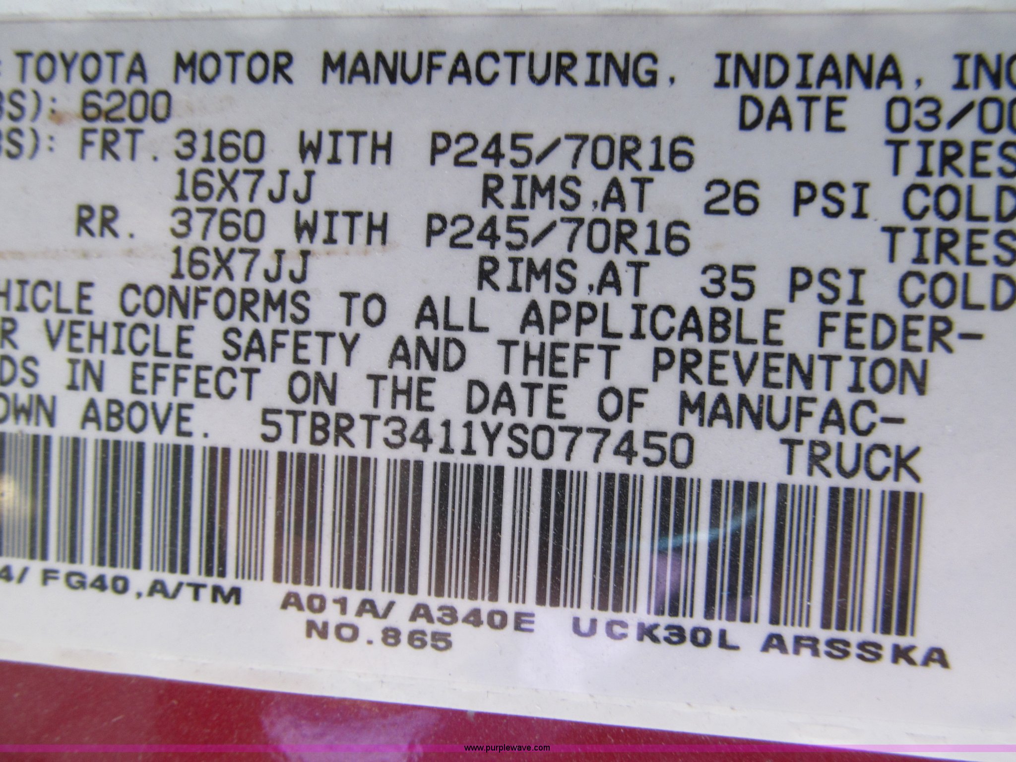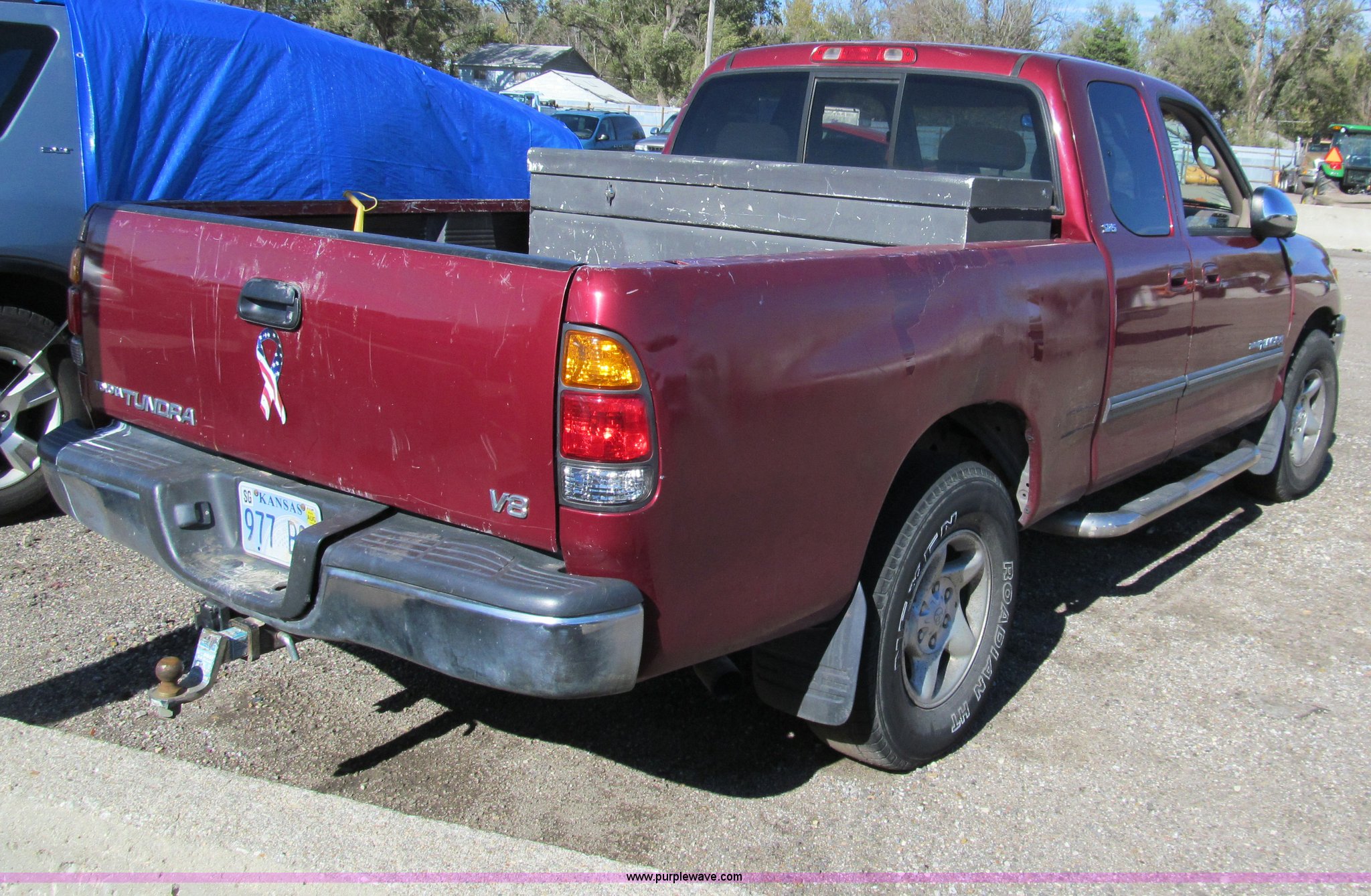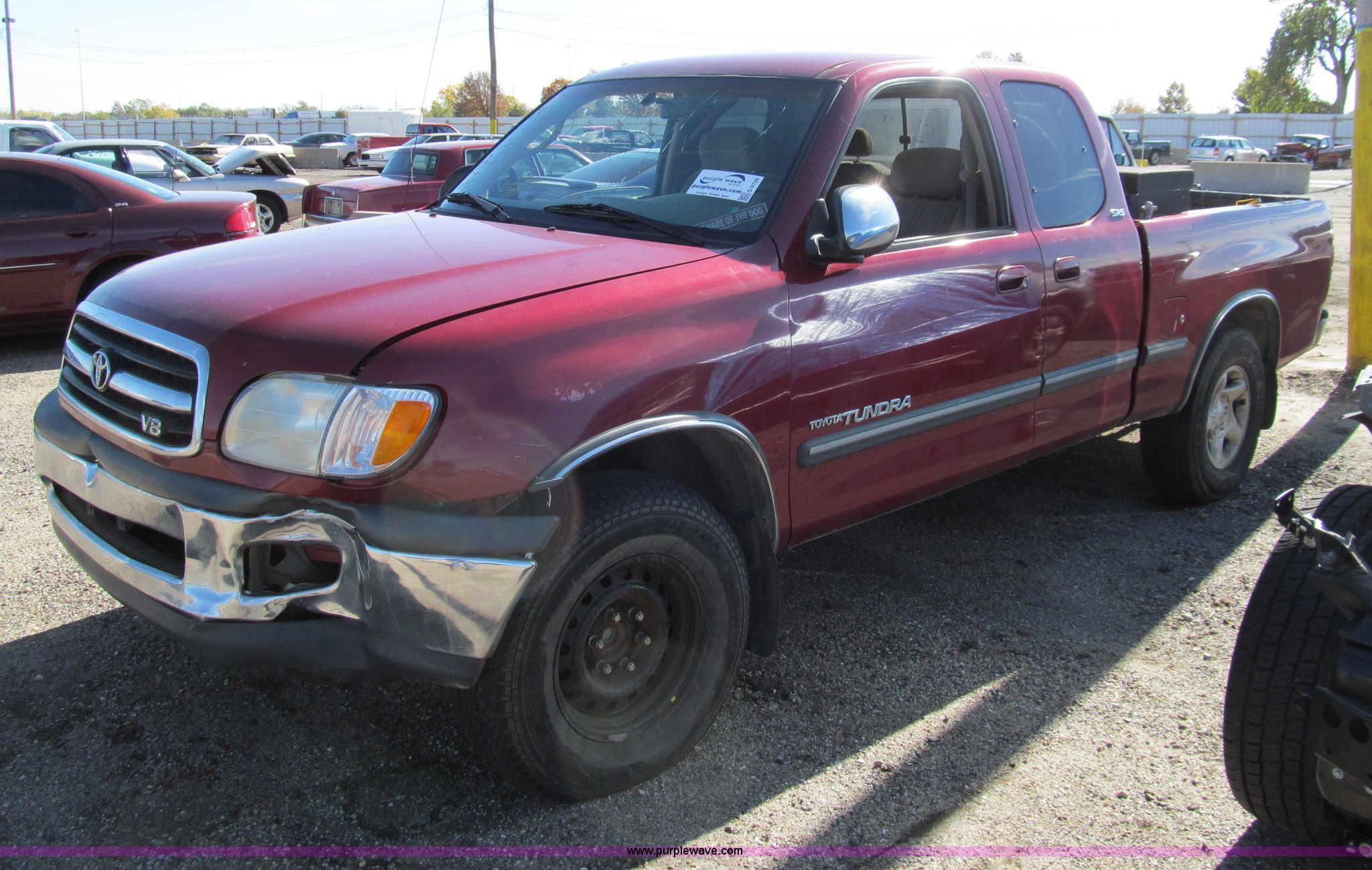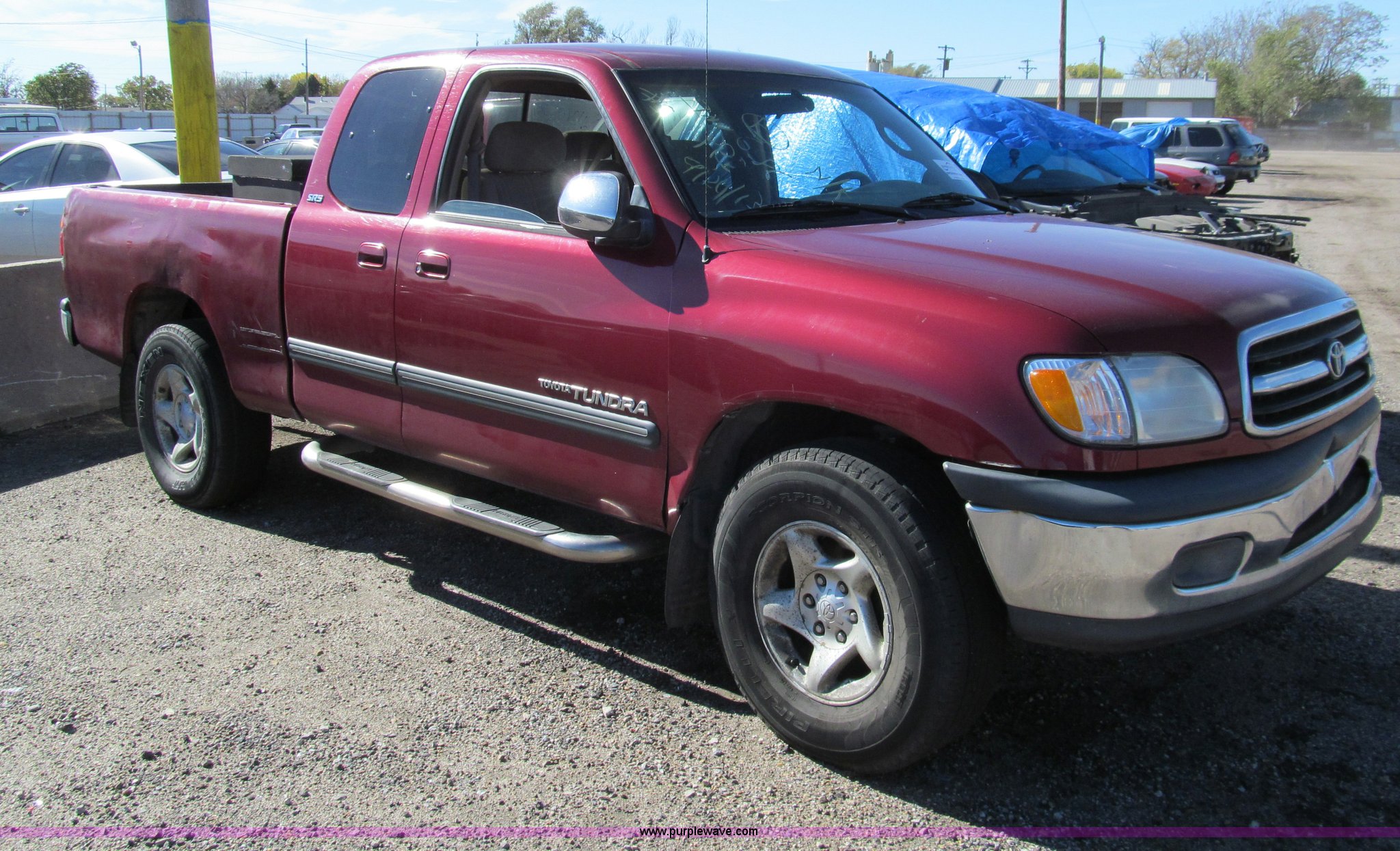 Purple Wave is selling a used Wrecked and Abandoned in Kansas. This item is a 2000 Toyota Tundra SR5 Access Cab pickup truck with the following: Unknown miles on odometer, 4.7L V8 DOHC 32V gas engine, Automatic transmission, AC and heat, AM/FM/cassette, Power windows and locks, Cloth interior, Running boards, Toolbox, Receiver hitch, 3 1/4" drop hitch, Trailer wiring, 265/75R16 tires, Windshield cracked, Front bumper damage, Case# 13C518409
