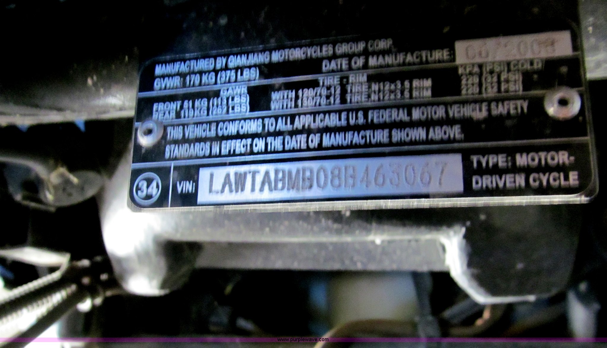 Purple Wave is selling a used Wrecked and Abandoned in Kansas. This item is a 2008 Vente scooter with the following: Unknown miles on odometer, 120/70-12 tires, Case# 13C063267