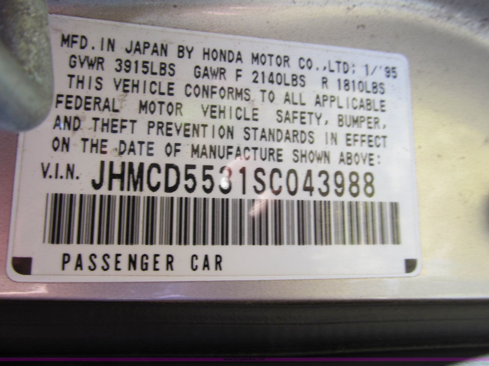 Purple Wave is selling a used Wrecked and Abandoned in Kansas. This item is a 1995 Honda Accord LX with the following: 189,138 miles on odometer, 2.2L L4 SOHC 16V gas engine, Five speed manual transmission, AC and heat, Tilt, Power windows, locks, and mirrors, Cloth interior, Sunroof, Keys, 185/70R14 tires, Case# 13C67213