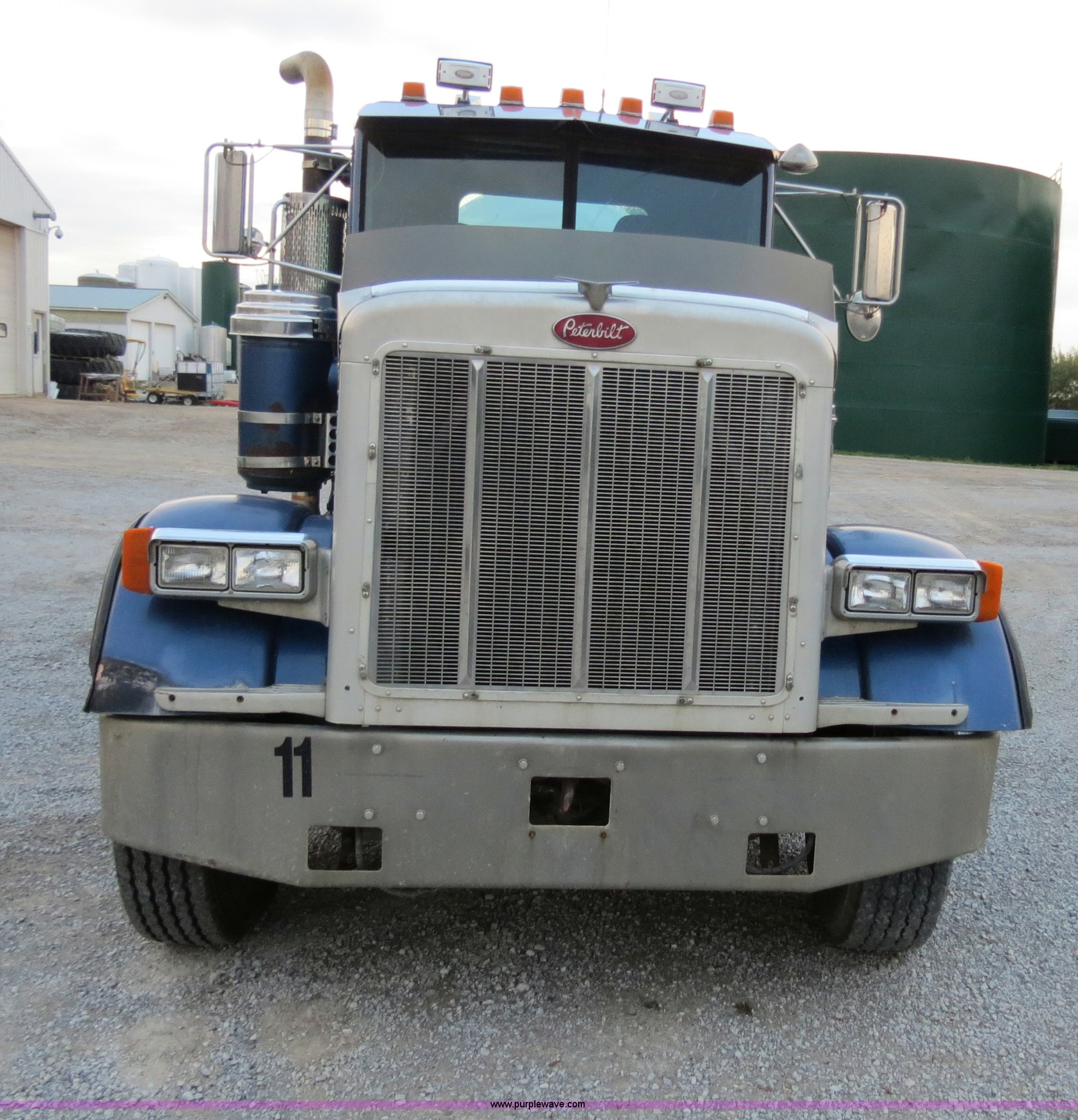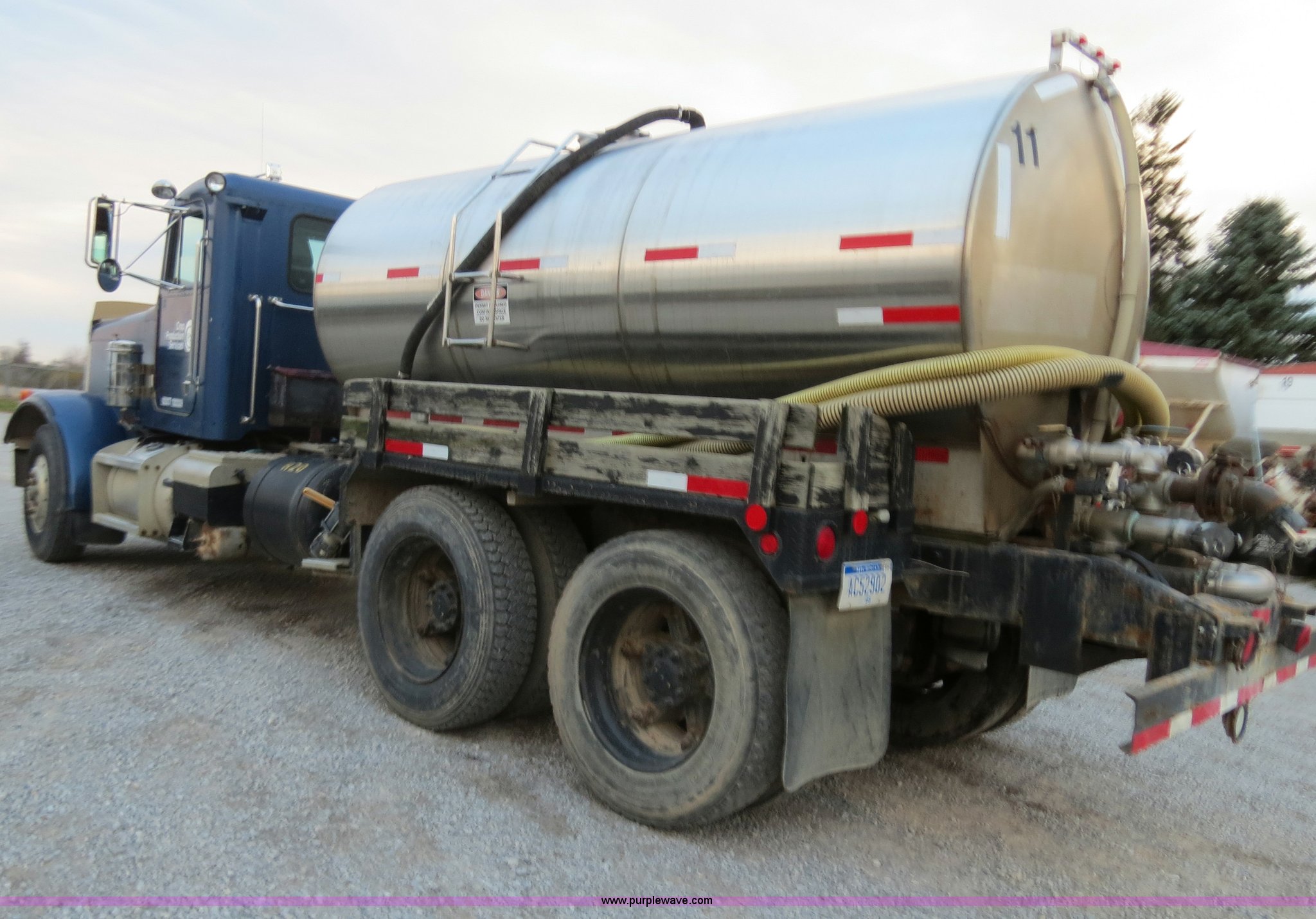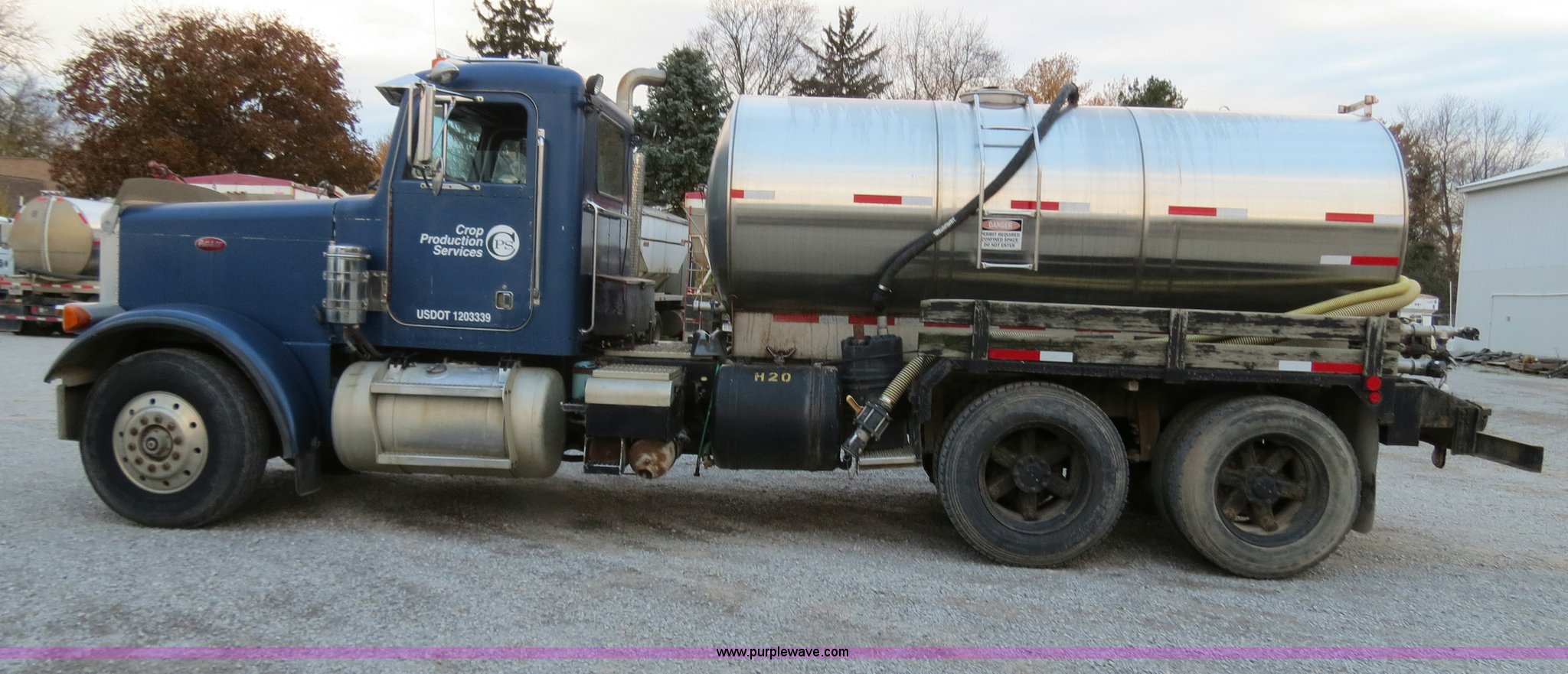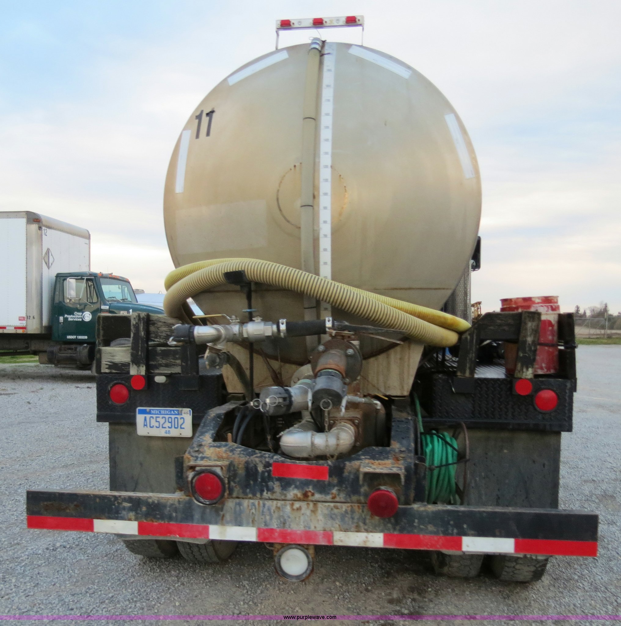 Purple Wave is selling a used Tank Truck or Water Truck in Michigan. This item is a 1990 Peterbilt 379 nurse truck with the following: 364,172 miles on odometer, Cummins NT 14.0L L6 turbo diesel engine, Eaton Fuller Road Ranger 13 speed manual transmission, AC and heat, AM/FM, Passenger daylight door, Air suspension seat, Passenger side power window, Heated mirrors, Spotlight, 2,000 gallon stainless steel tank, (2) rear 4" quick coupler, 4" hose with quick coupler, 2" hose with quick coupler, Side access ladder, Top load, Side walk platforms, Chrome bumper, Dual fuel tanks, Single rear exhaust stack, Aluminum deck plate, PTO, Wet kit, Air suspension, Air brakes, Jake brake, Aluminum front wheels, 315/80R22.5 front tires, Dayton 285/75R24.5 rear tires, GVWR 58,600 lbs, FAWR 14,600 lbs, IAWR 22,000 lbs, RAWR 22,000 lbs
