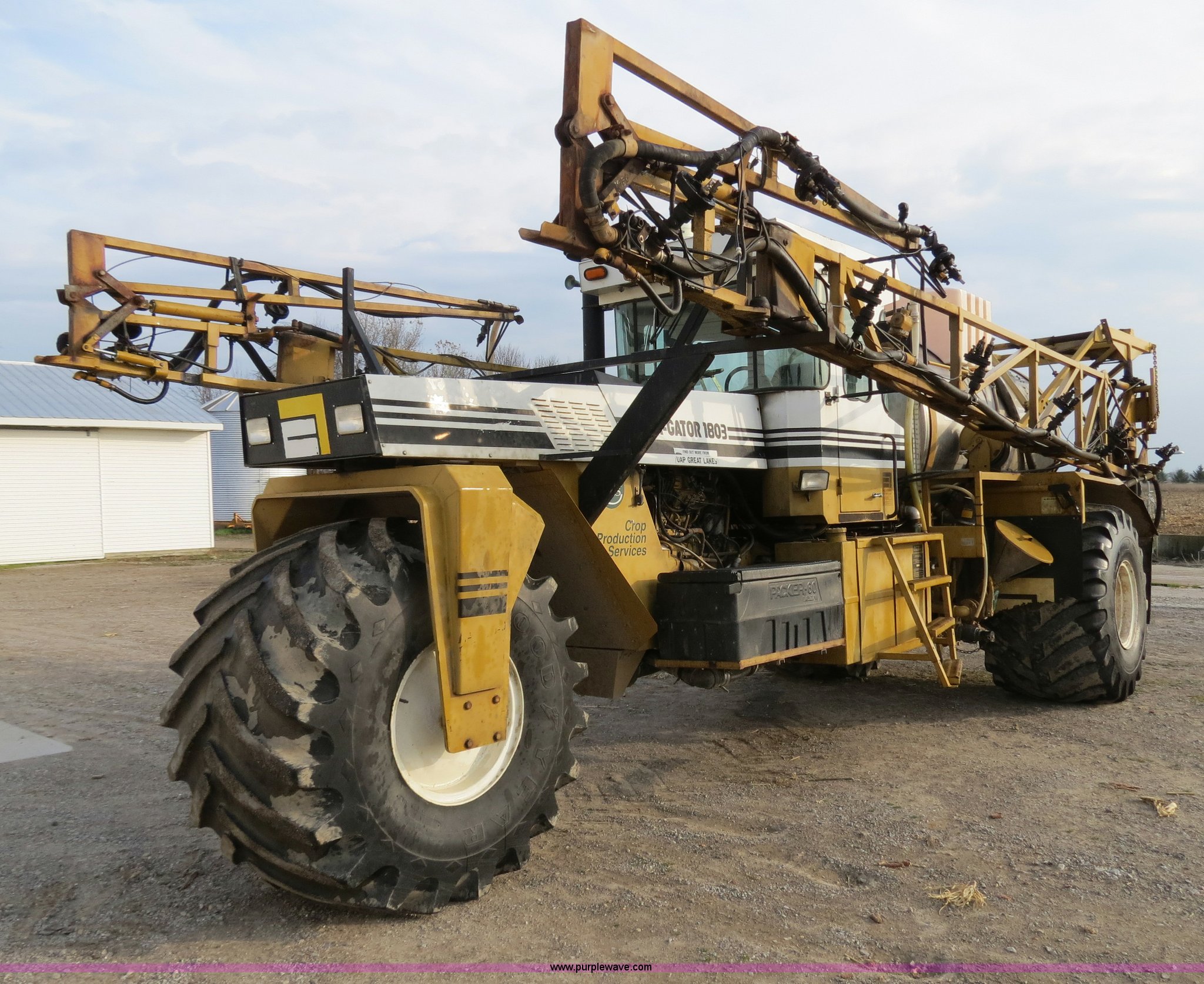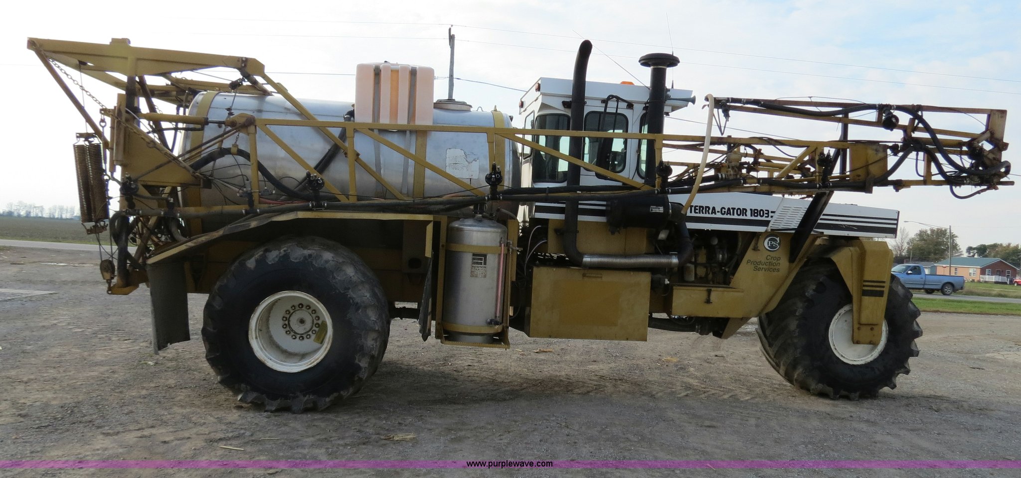 1995 Ag-Chem TerraGator 1803 liquid applicator floater. 50,596 miles on odometer, 5,250 hours on meter, Cummins 8.3L six cylinder turbo diesel engine 275 HP, Automatic transmission Four speed with four speed auxiliary transmission, Modelt 1800 stainless steel induction tank 1,800 gallon capacity, Serial L180472, 100 gallon top rinse tank, Dickey John DJCMS100 monitor, Dickey John DJCCS100 application rate monitor, 60/80' boom width (5) boom sections, Four-way nozzle bodies, 60" nozzle spacing, Hydraulic boom fold, 55 gallon foam marker, Chemical eductor, Auto flush, AC and heat, AM/FM, Spring suspension seat, Tilt steering wheel, Trimble Ag GPS, Trimble light bar, Radar ground speed sensor, Work lights, Plastic toolbox, 66x43.00-25 tires, Serial 1833354, Unit# 81292. View equipment video. Crop Production Services - Owendale. 3601 4th St. Owendale, MI 48754