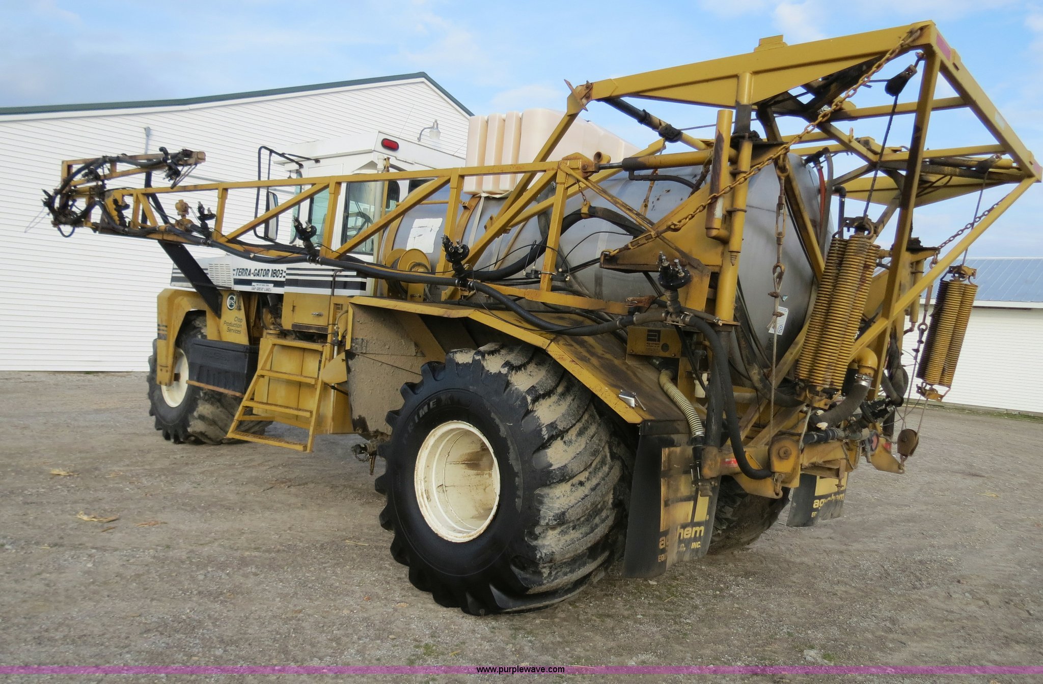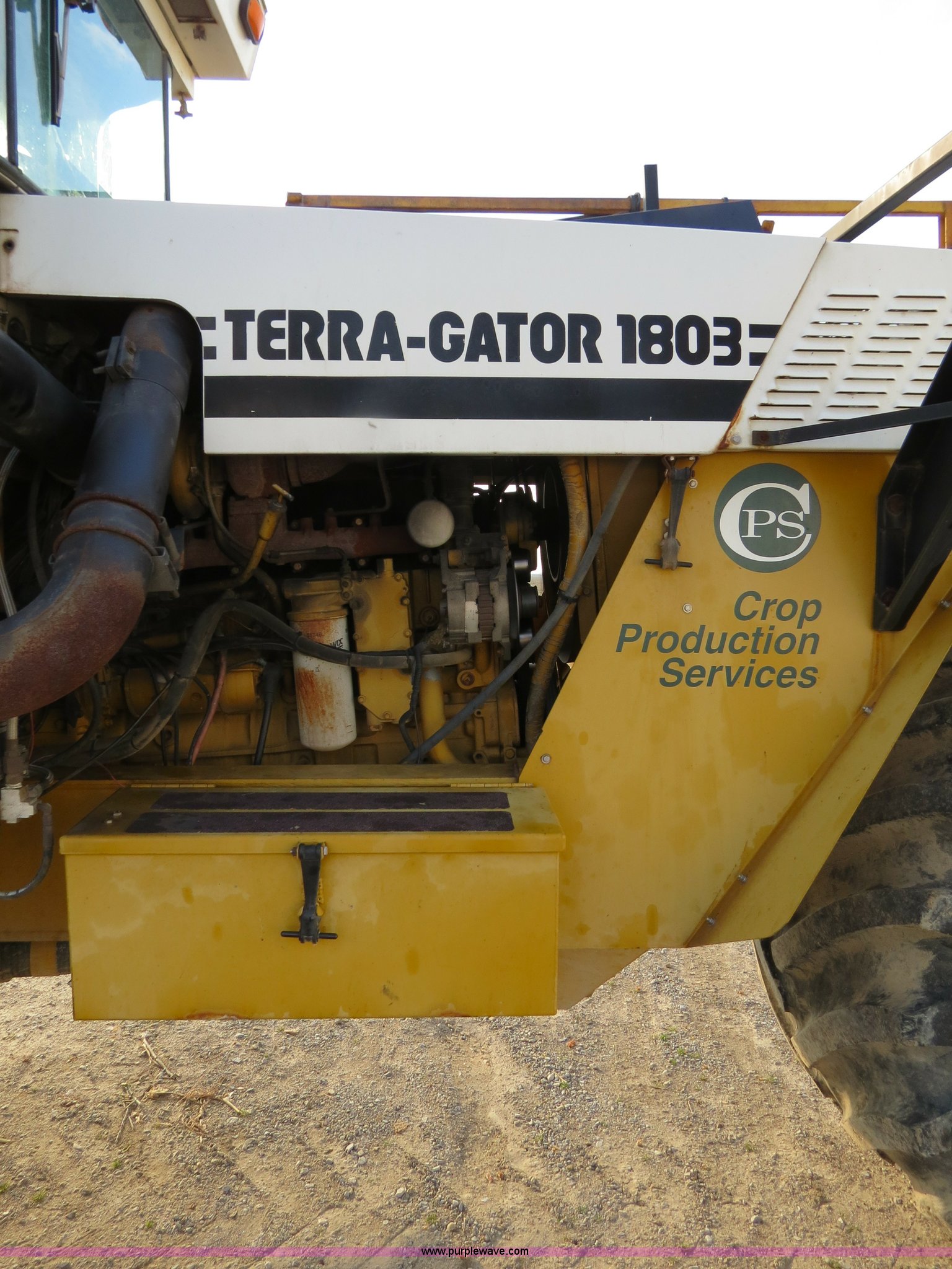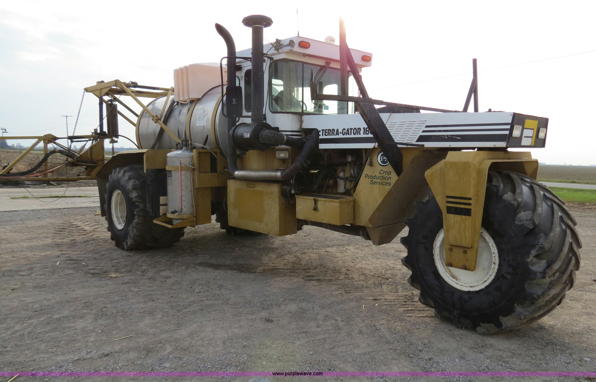 Purple Wave is selling a used Applicator Self Propelled in Michigan. This item is a 1995 Ag-Chem TerraGator 1803 liquid applicator floater with the following: 50,596 miles on odometer, 5,250 hours on meter, Cummins 8.3L six cylinder turbo diesel engine, 275 HP, Automatic transmission, Four speed with four speed auxiliary transmission, Modelt 1800 stainless steel induction tank, 1,800 gallon capacity, Serial L180472, 100 gallon top rinse tank, Dickey John DJCMS100 monitor, Dickey John DJCCS100 application rate monitor, 60/80' boom width, (5) boom sections, Four-way nozzle bodies, 60" nozzle spacing, Hydraulic boom fold, 55 gallon foam marker, Chemical eductor, Auto flush, AC and heat, AM/FM, Spring suspension seat, Tilt steering wheel, Trimble Ag GPS, Trimble light bar, Radar ground speed sensor, Work lights, Plastic toolbox, 66x43.00-25 tires, Serial 1833354, Unit# 81292