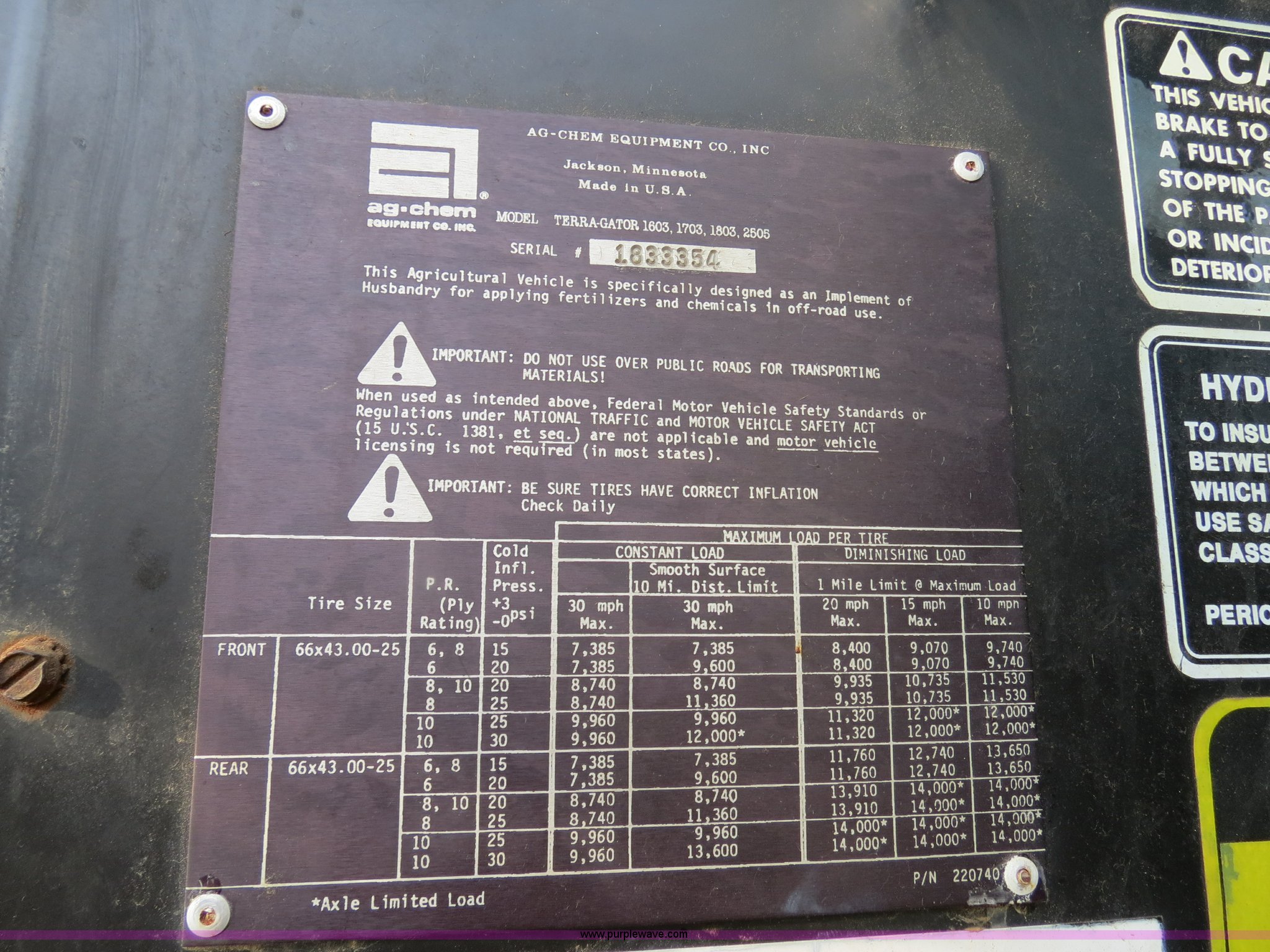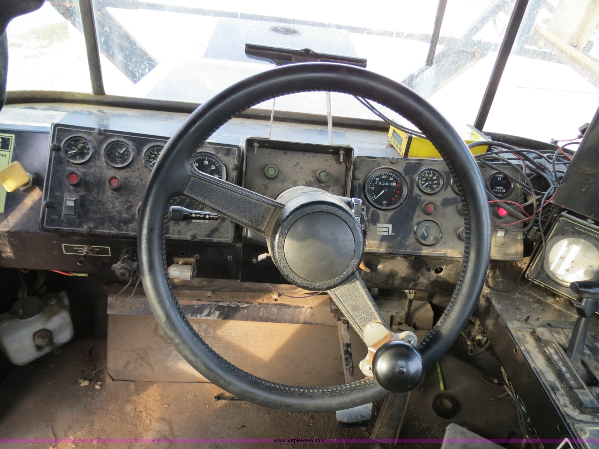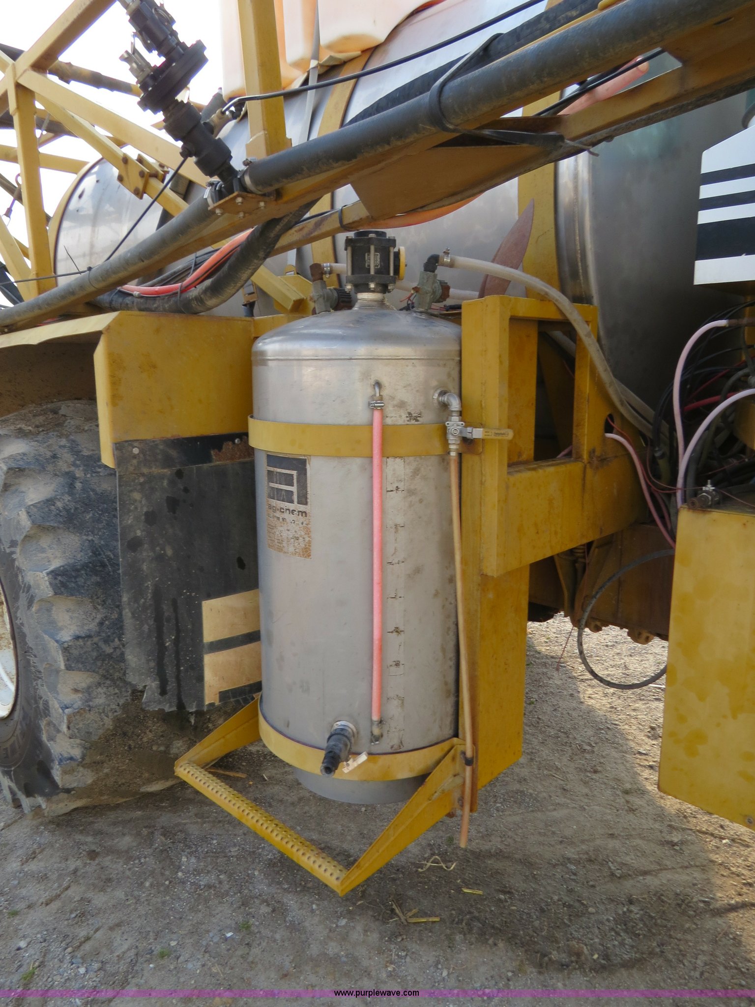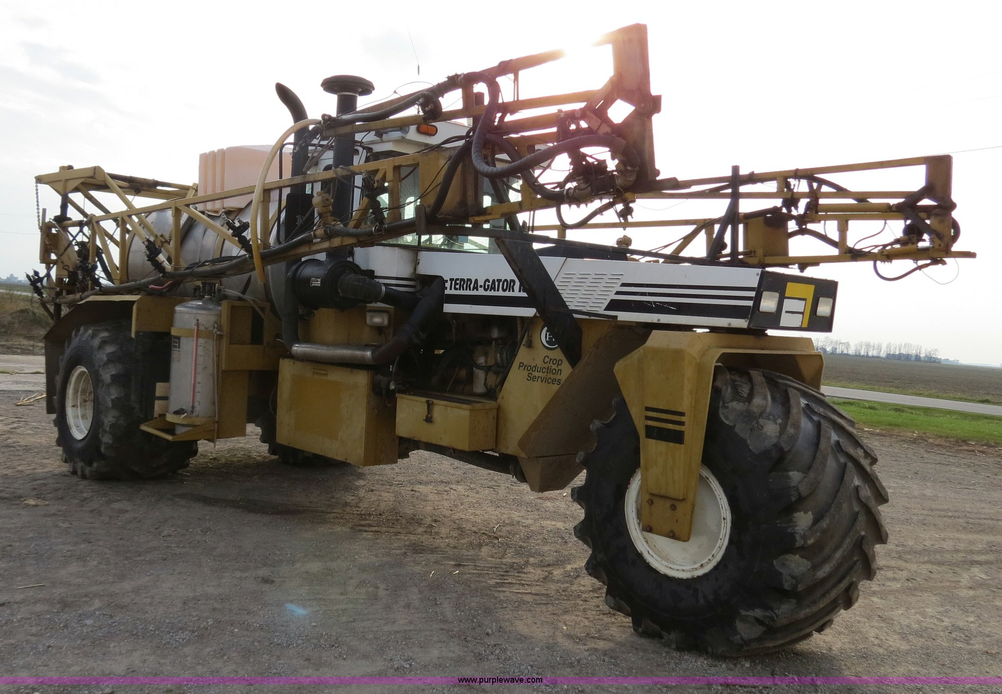 Purple Wave is selling a used Applicator Self Propelled in Michigan. This item is a 1995 Ag-Chem TerraGator 1803 liquid applicator floater with the following: 50,596 miles on odometer, 5,250 hours on meter, Cummins 8.3L six cylinder turbo diesel engine, 275 HP, Automatic transmission, Four speed with four speed auxiliary transmission, Modelt 1800 stainless steel induction tank, 1,800 gallon capacity, Serial L180472, 100 gallon top rinse tank, Dickey John DJCMS100 monitor, Dickey John DJCCS100 application rate monitor, 60/80' boom width, (5) boom sections, Four-way nozzle bodies, 60" nozzle spacing, Hydraulic boom fold, 55 gallon foam marker, Chemical eductor, Auto flush, AC and heat, AM/FM, Spring suspension seat, Tilt steering wheel, Trimble Ag GPS, Trimble light bar, Radar ground speed sensor, Work lights, Plastic toolbox, 66x43.00-25 tires, Serial 1833354, Unit# 81292