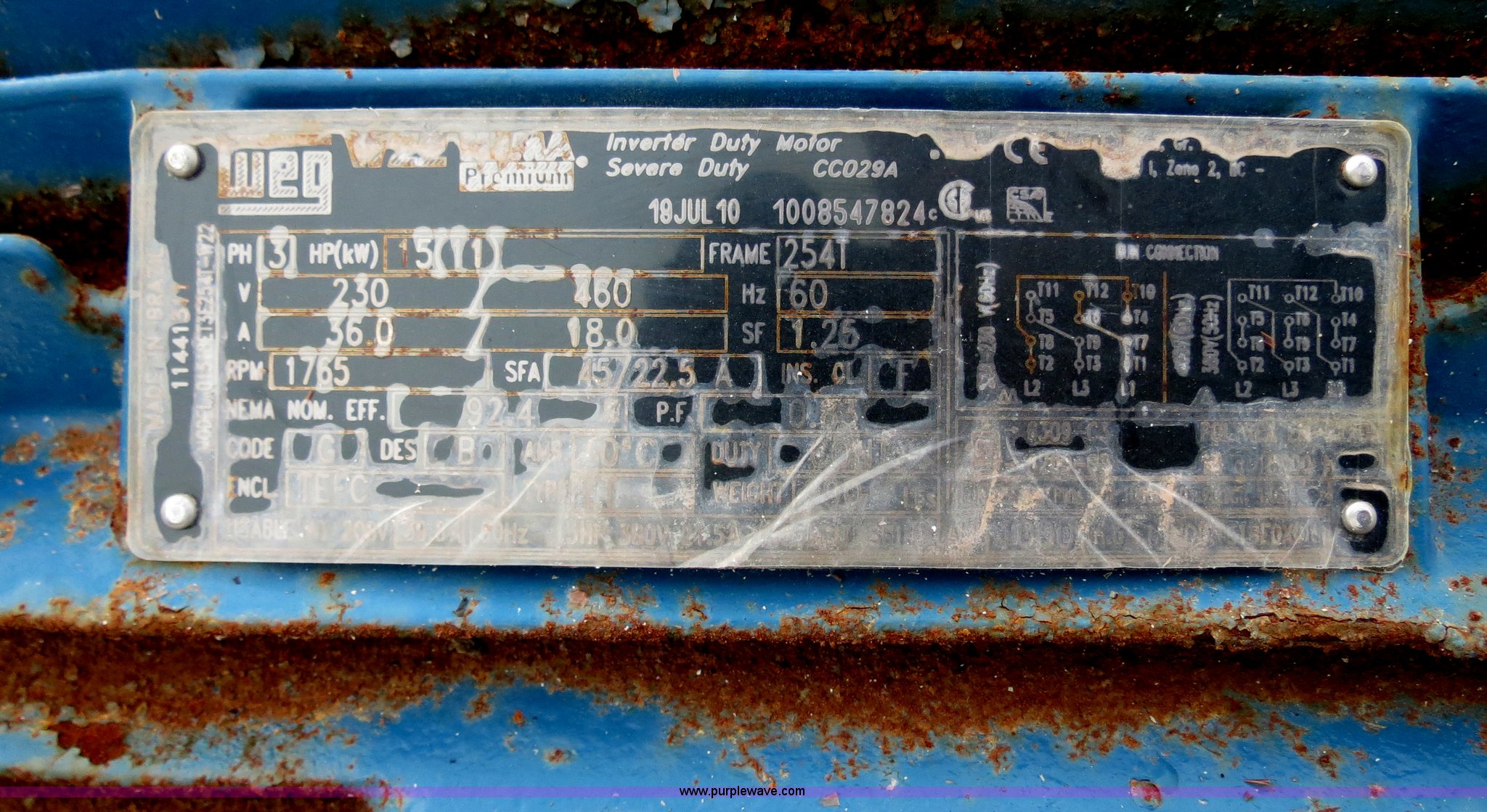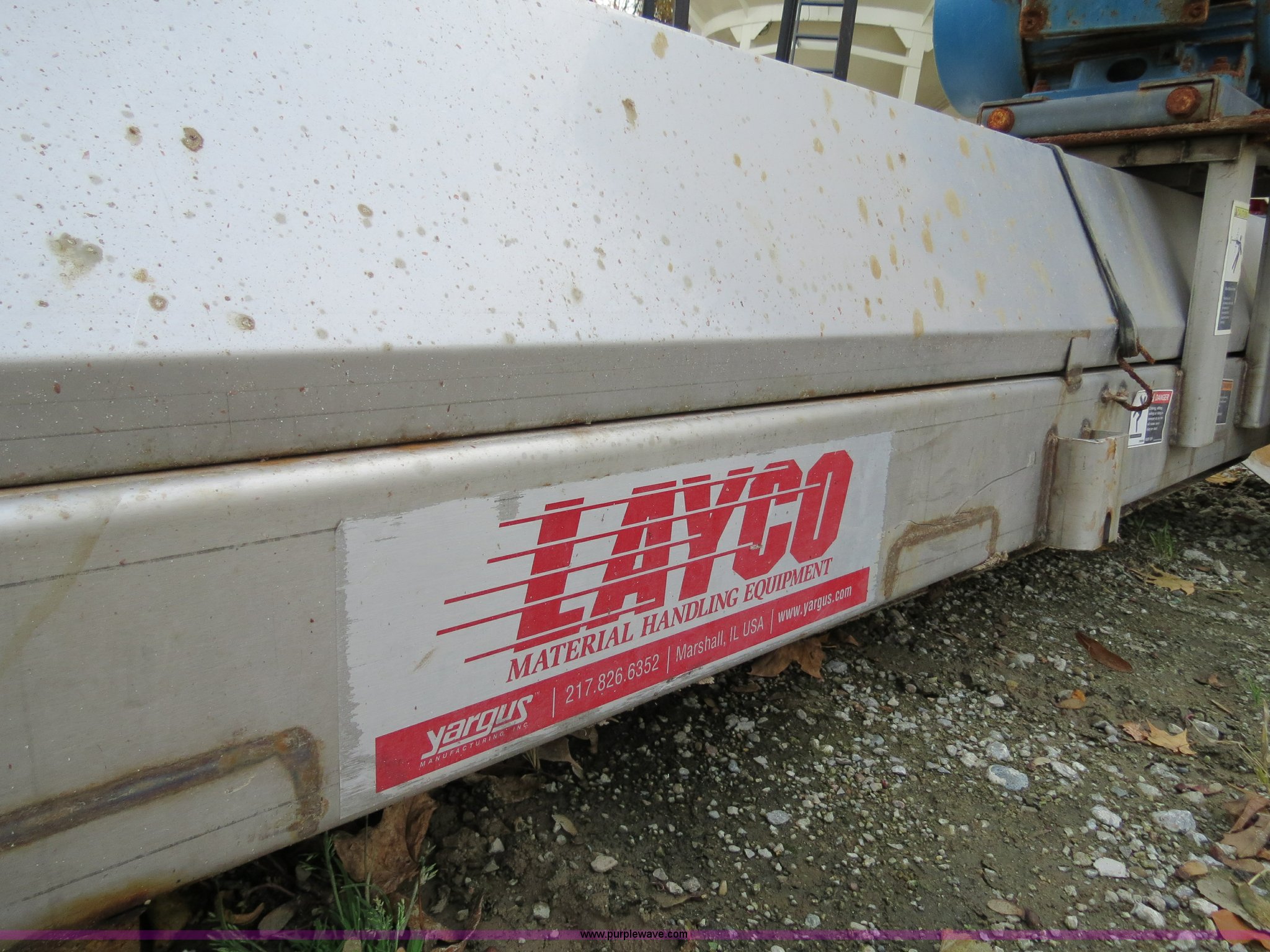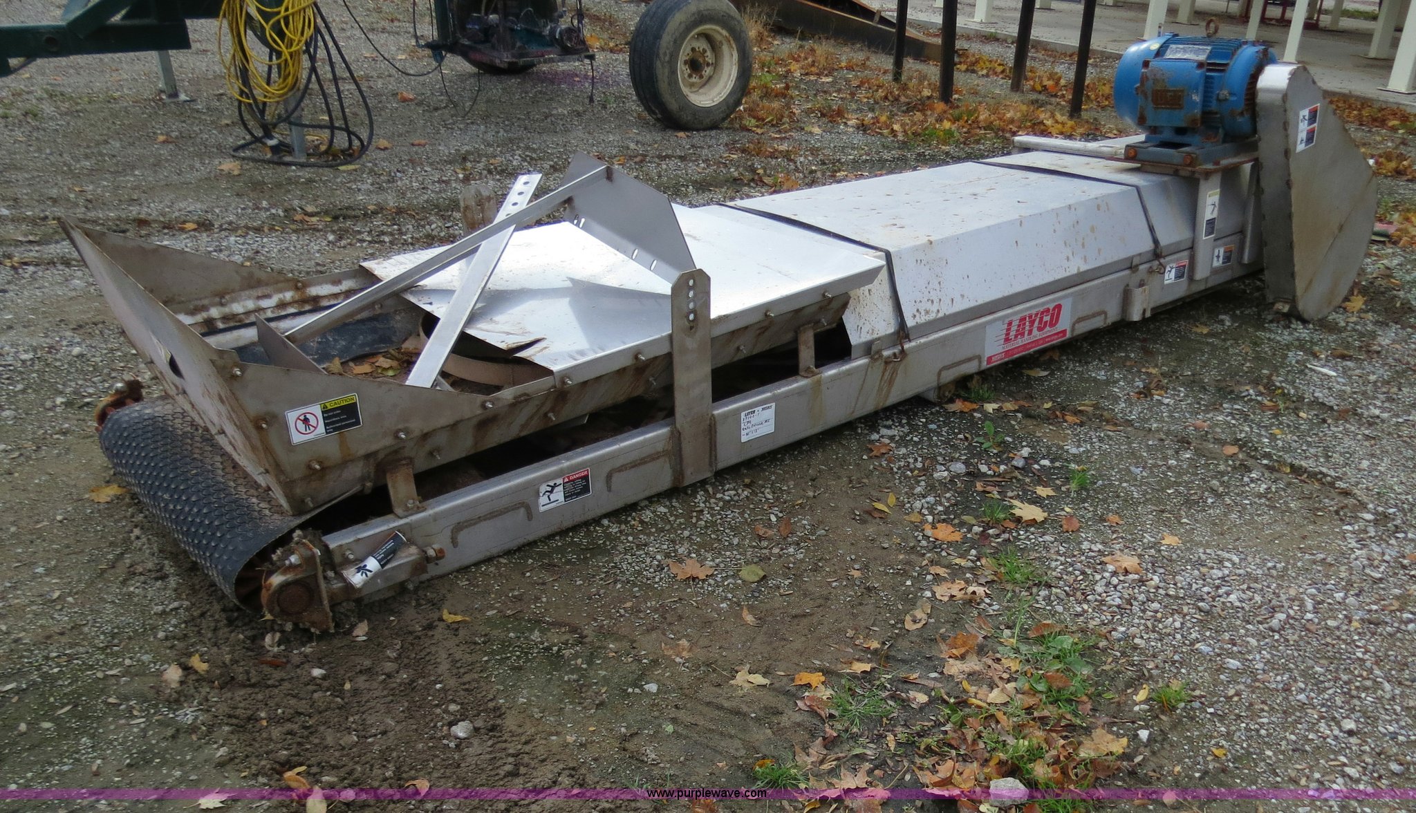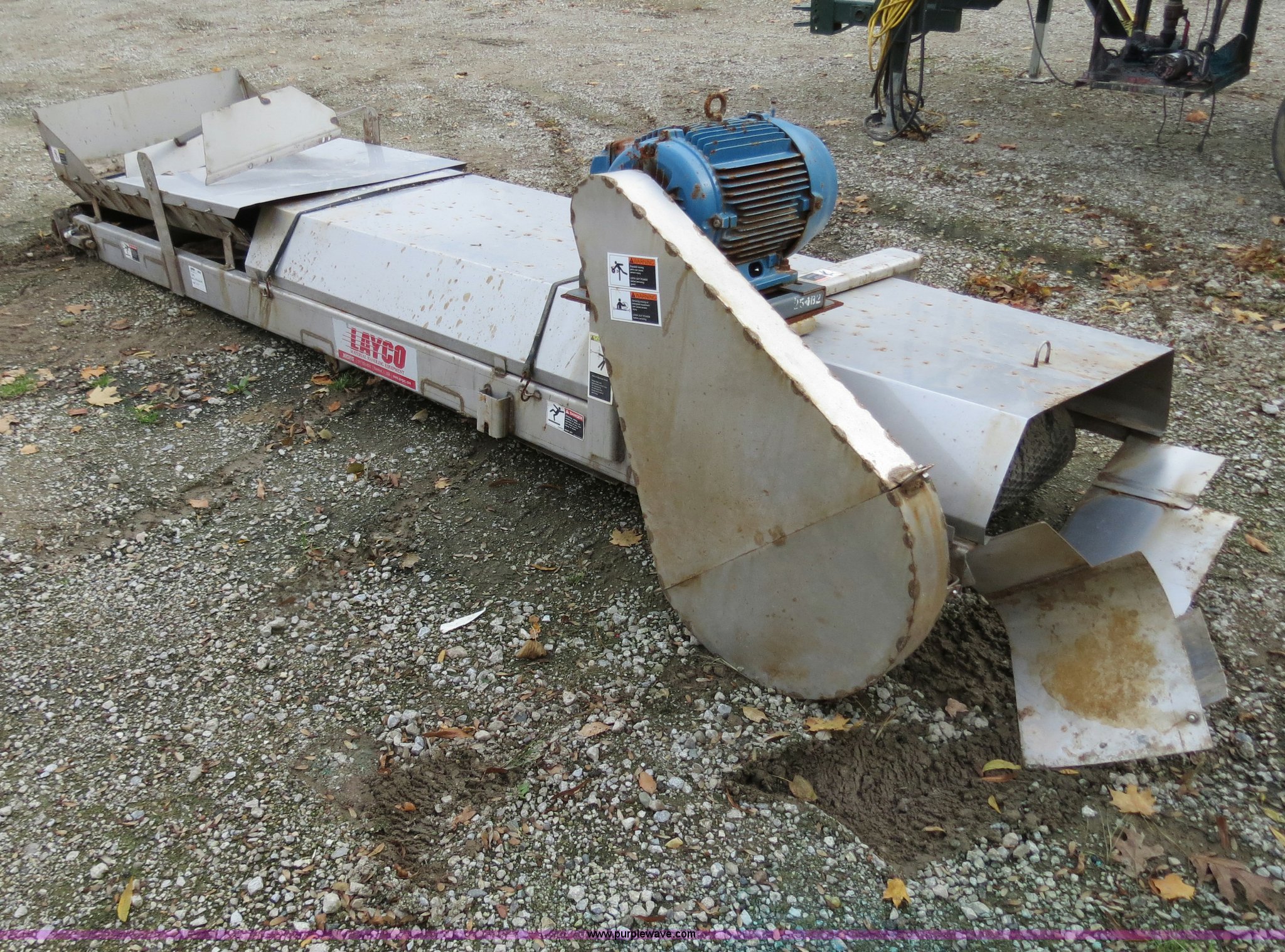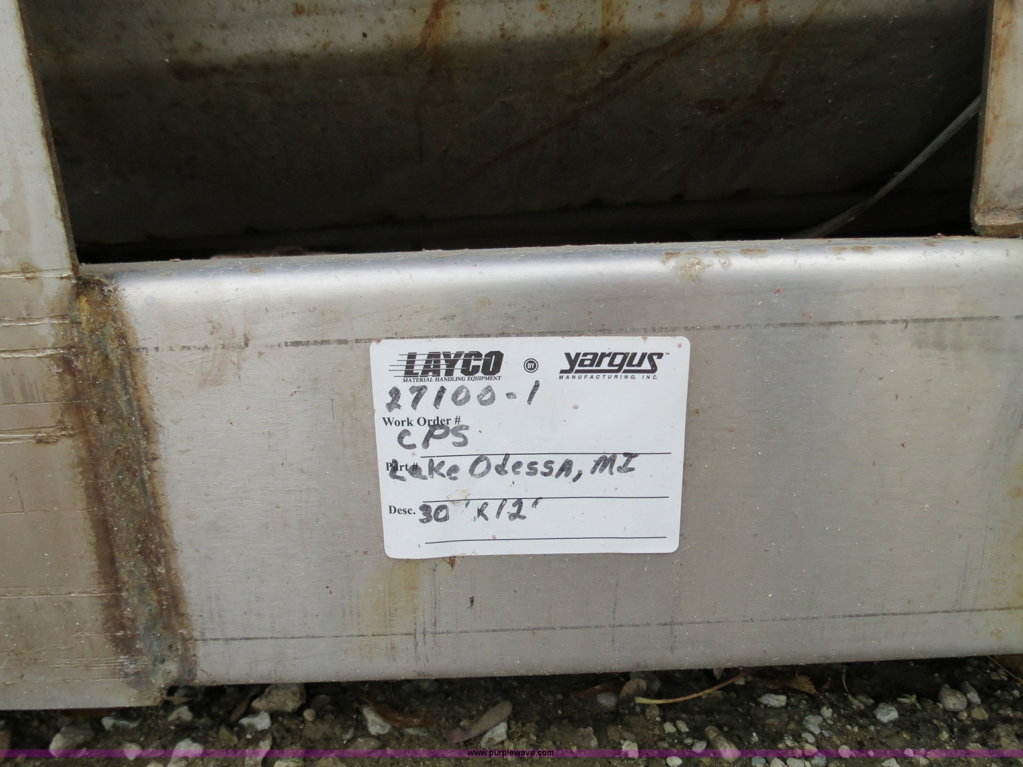 Purple Wave is selling a used Auger or Conveyor in Michigan. This item is a 2010 Layco CC029A 12' belt conveyor with the following: 20"W belt, Weg three phase electric motor, 15 HP, 230/460V, Serial S301210957