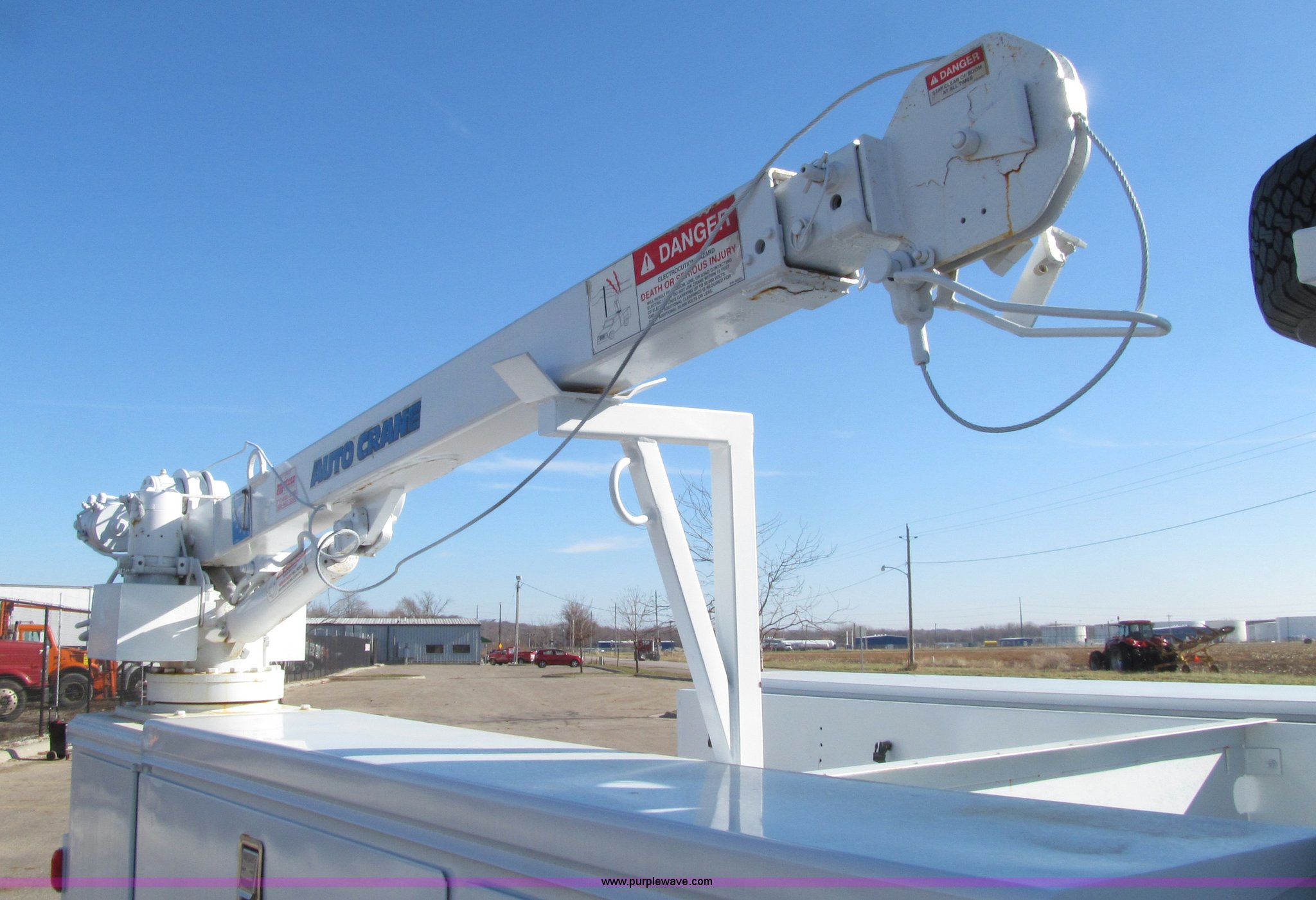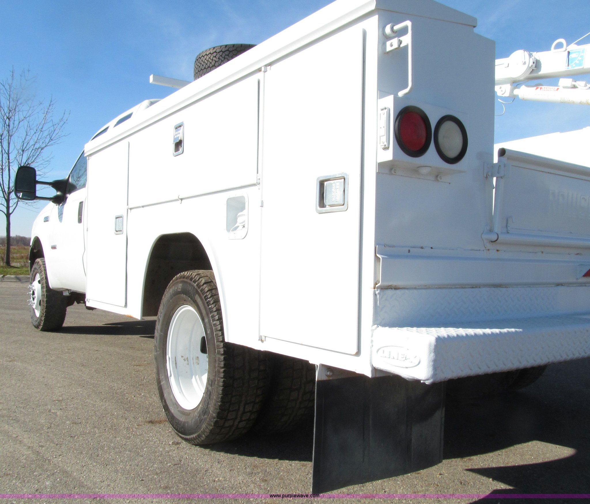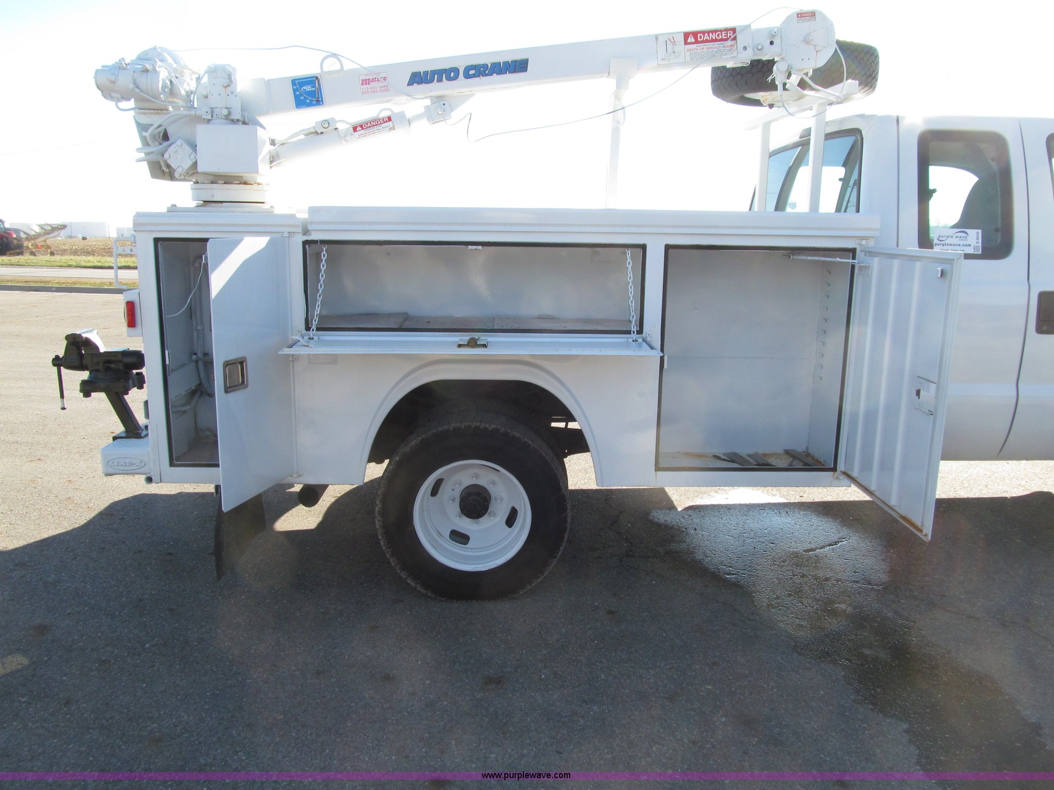 Purple Wave is selling a used Service Truck in Iowa. This item is a 2006 Ford F350 Super Duty XL SuperCab service truck with the following: 154,845 miles on odometer, 6.0L V8 OHV 32V turbo diesel engine, Automatic transmission, AC and heat, Tilt, Cruise, AM/FM, Manual windows and locks, Cloth interior, Rawson Koenig 9'L steel service body, Three compartments per side, Tailgate, Vise, Mudflaps, Autocrane 3203PRX crane, Serial PRX-0206-171, No controller, LT245/75R17 tires, Air bag light is on, Front bumper dented