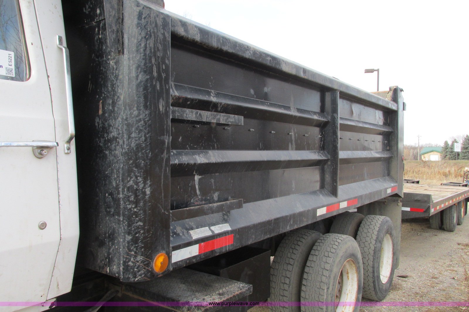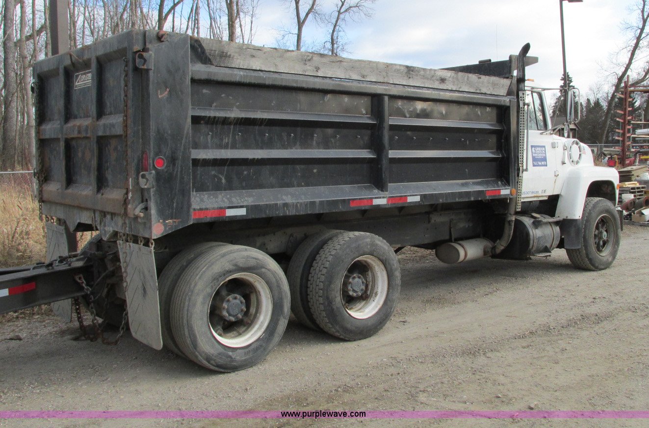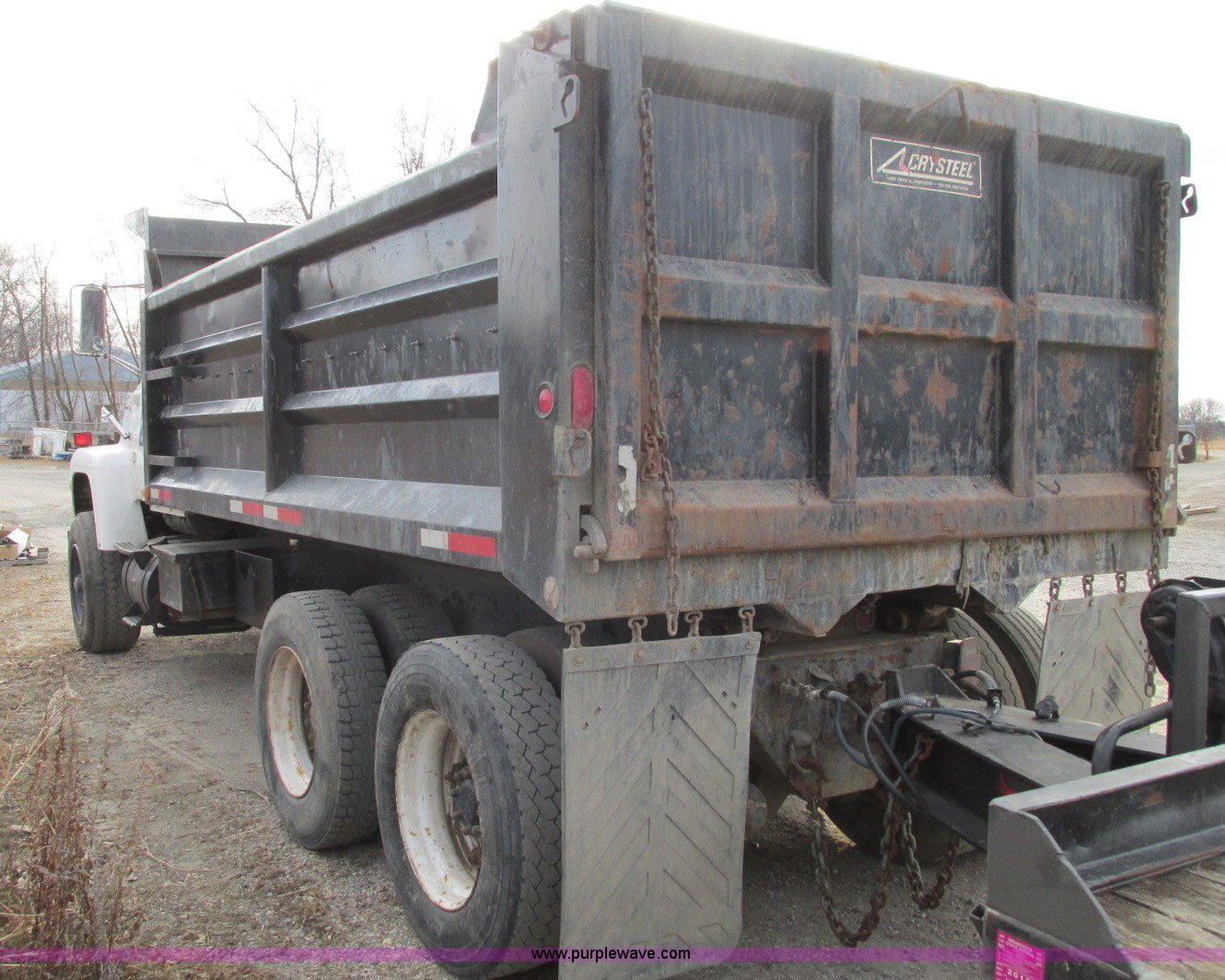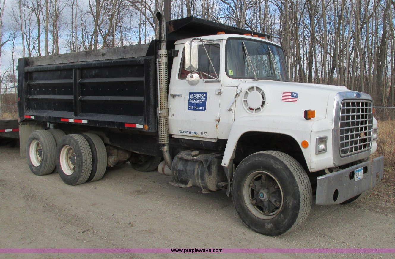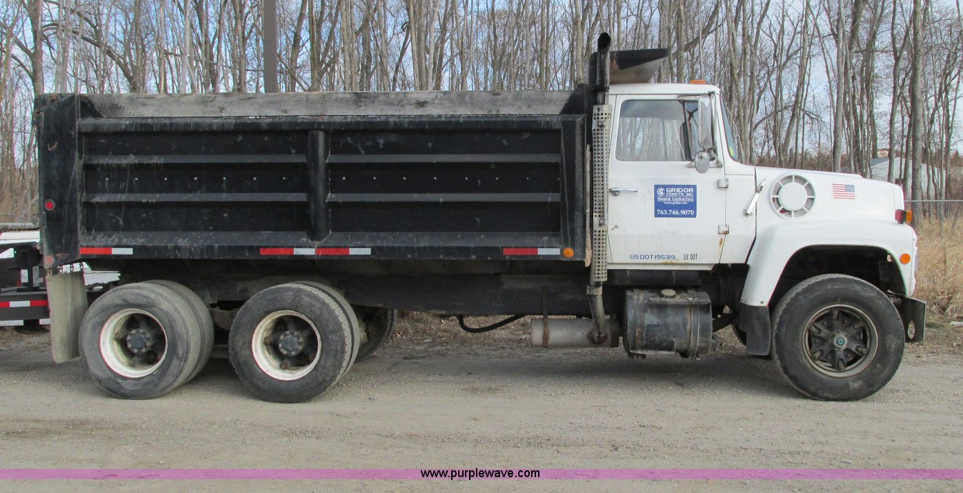Purple Wave is selling a used Construction Dump Truck in Minnesota. This item is a 1984 Ford LT8000 dump truck with the following: 432,522 actual miles, Caterpillar 3208 10.4L V8 diesel engine, Road Ranger 13 speed manual transmission, Heat, AM/FM/cassette, Air suspension seat, Crysteel 15' dump bed, Air end gate, Block heater, Trailer wiring, Pintle hitch, Dual 60 gallon fuel tanks, Muncie PTO, Air suspension, Air brakes, 212" wheelbase, 385/65R22.5 tires, GVWR 50,000 lbs, Board missing on driver's side of box, Dump box liner damaged, Trailer not included