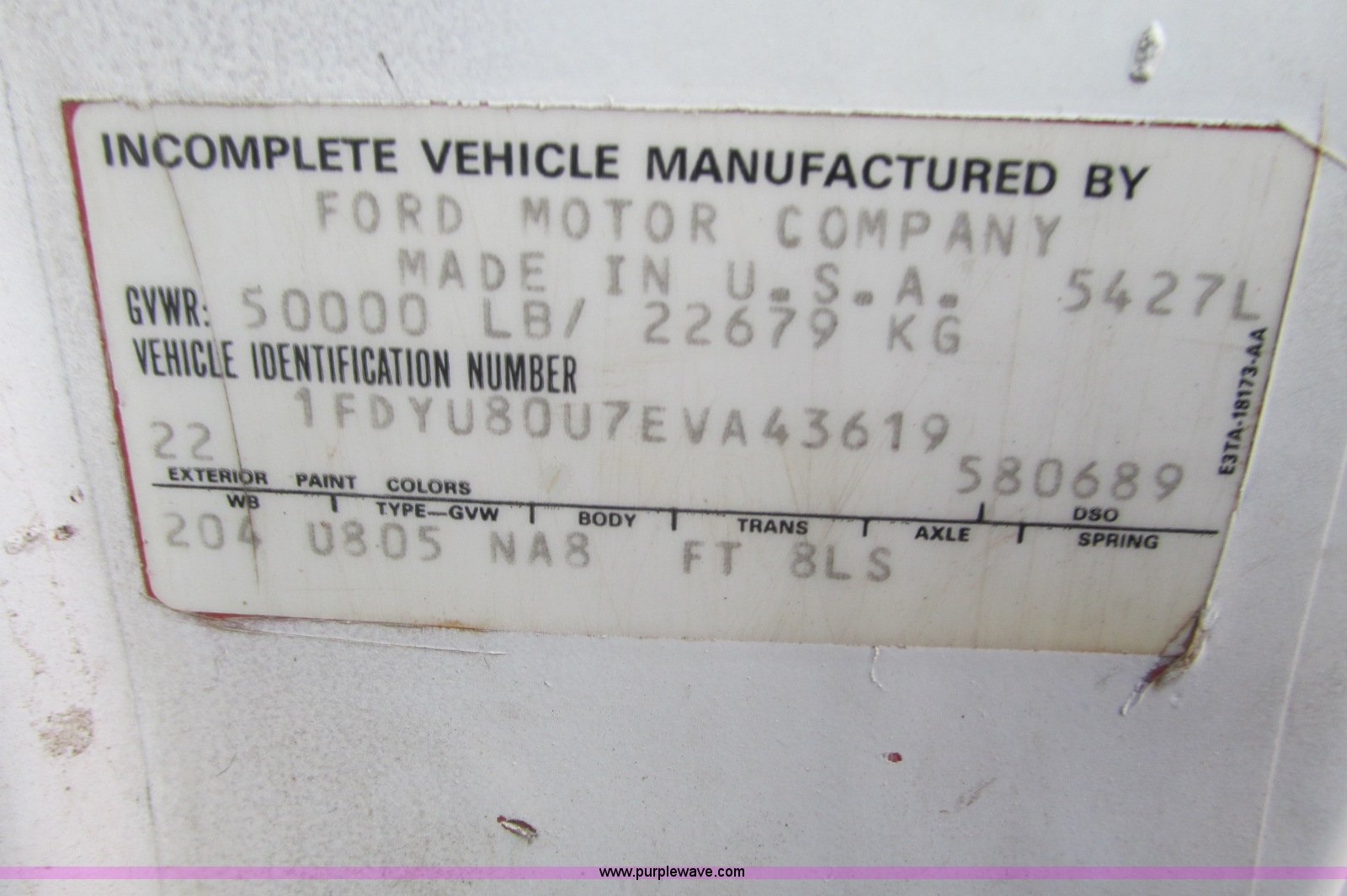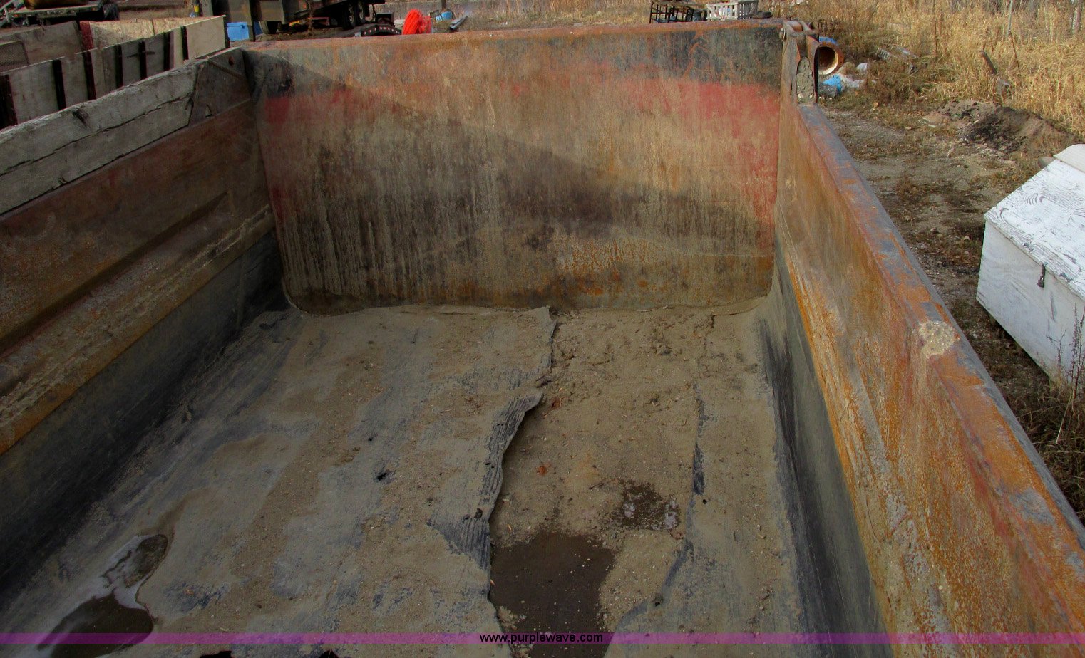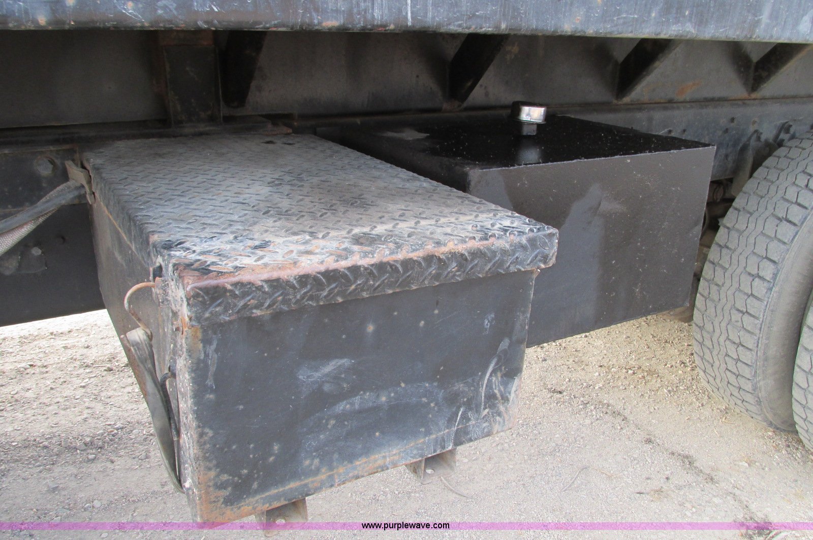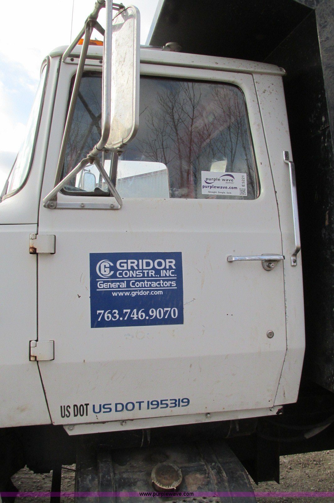 1984 Ford LT8000 dump truck. 432,522 actual miles, Caterpillar 3208 10.4L V8 diesel engine, Road Ranger 13 speed manual transmission, Heat, AM/FM/cassette, Air suspension seat, Crysteel 15' dump bed Air end gate, Block heater, Trailer wiring, Pintle hitch, Dual 60 gallon fuel tanks, Muncie PTO, Air suspension, Air brakes, 212" wheelbase, 385/65R22.5 tires, GVWR 50,000 lbs, Board missing on driver's side of box, Dump box liner damaged, Trailer not included. 1FDYU80U7EVA43619. Gridor Construction, Inc.. 3990 27th St SE. Buffalo, MN 55313