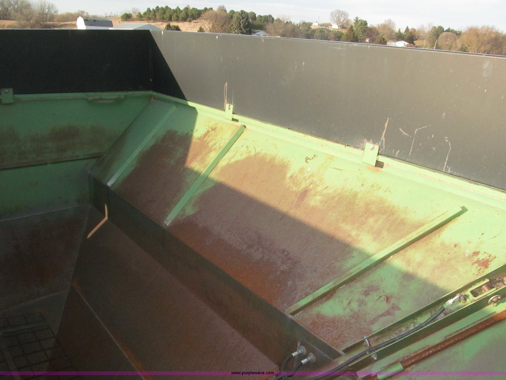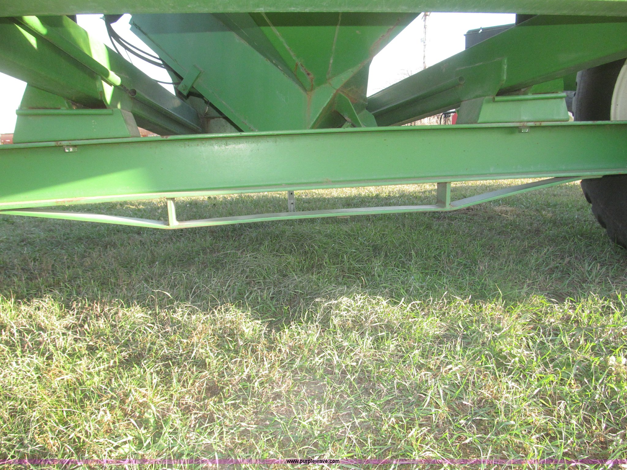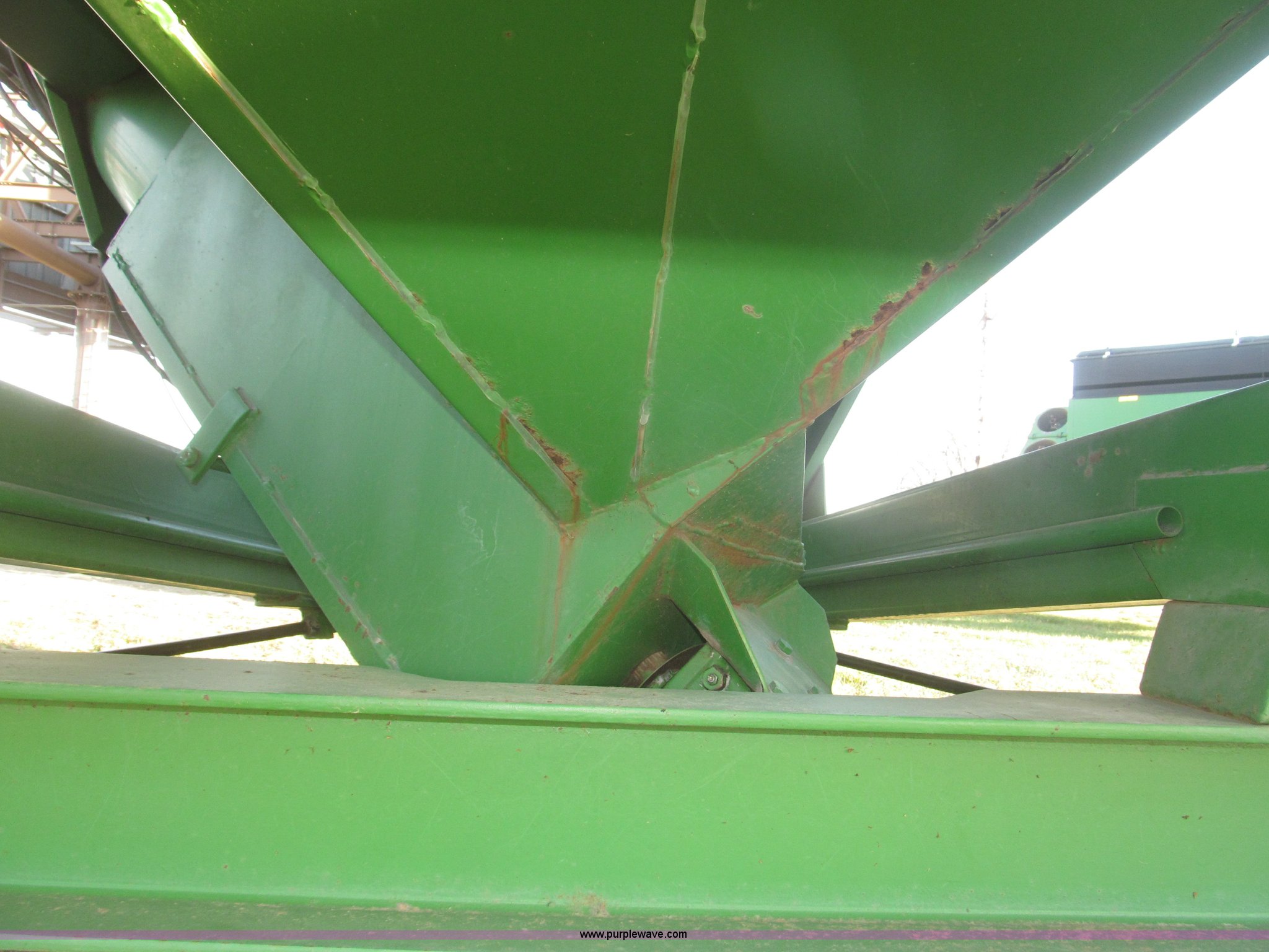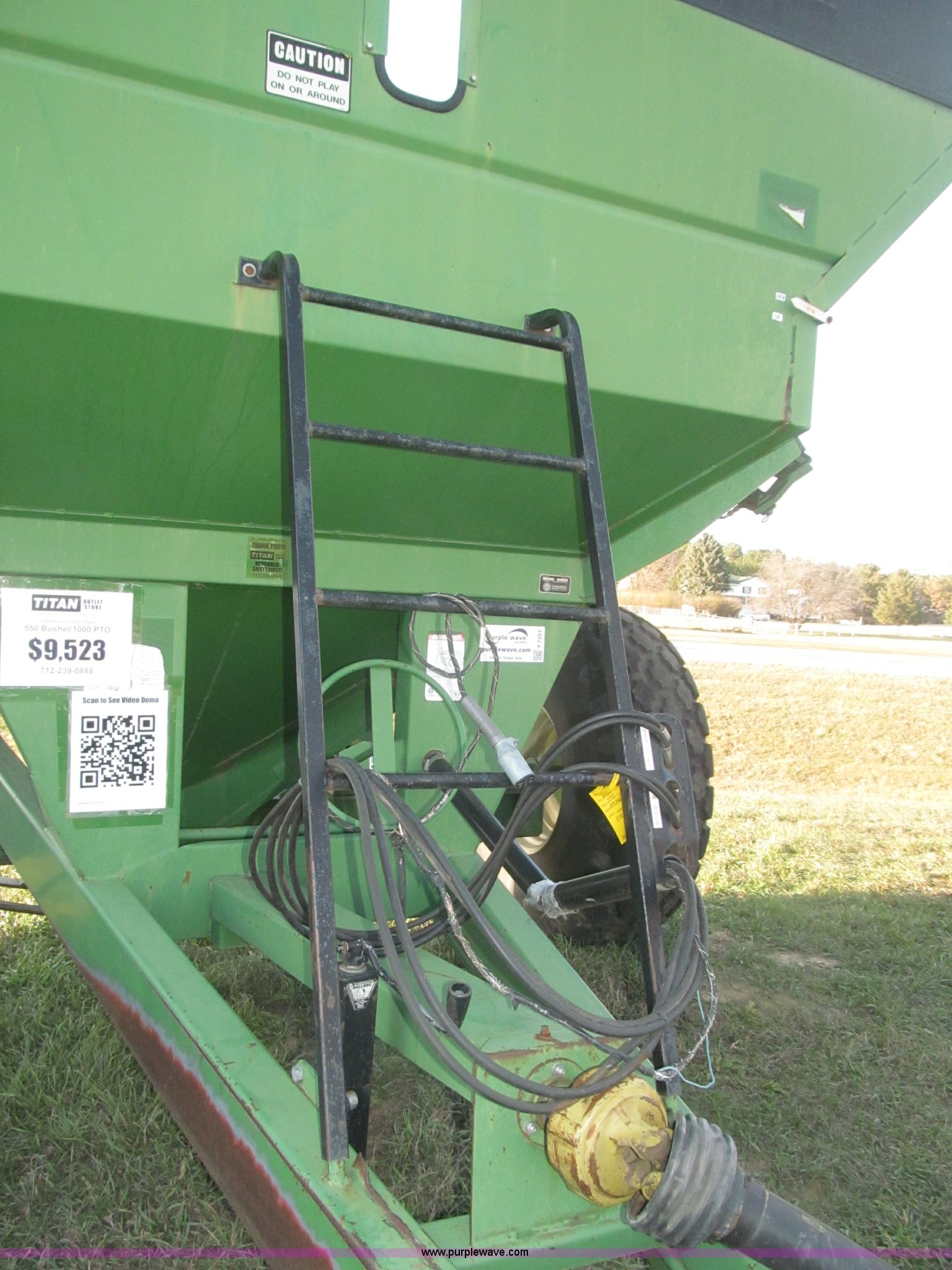 Purple Wave is selling a used Grain Cart or Gravity Wagon in Iowa. This item is a 2004 Brent GC572 grain cart with the following: 550 bushel capacity, 1000 PTO, Corner auger, 12'L x 14" diameter, 144" fixed angle, Work light, Bin extension, Front and rear view windows, Front access ladder, Manual bottom clean out gate, Hydraulic interior bottom bin gate control, Wire grate bin screen, Tail and hazard lights, 20" steel wheels, 23.1-26 tires, 12 ply, Seven pin trailer wiring, Plastic hose conduit broken, Serial 572683, Stock# 2193669