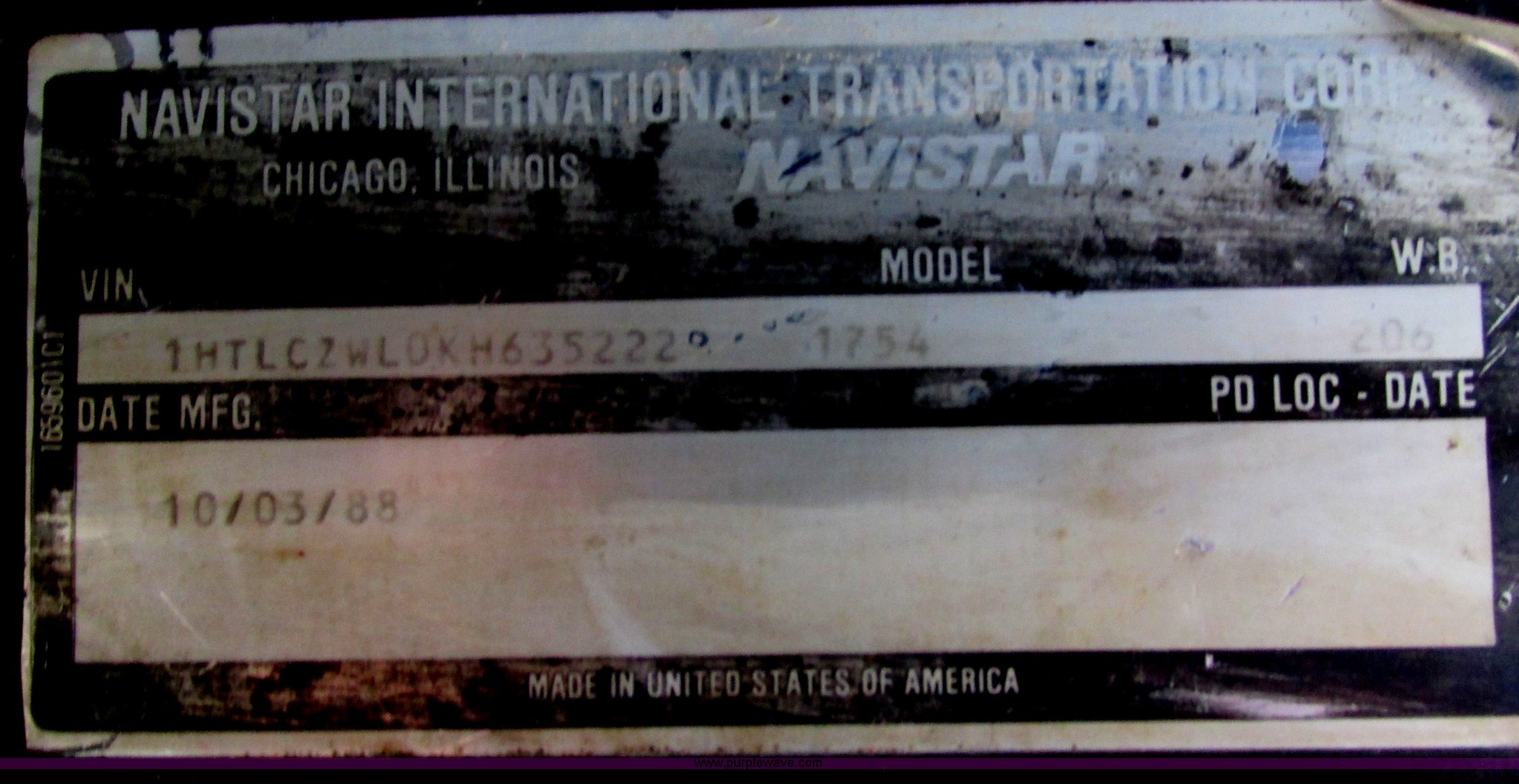 1989 International 1754 utility truck. International DT360 5.9L L6 diesel engine 170 HP, Allison AT500 automatic transmission, Heat, AM/FM/CD, Manual windows and locks, Vinyl/cloth interior, 12.5' utility bed, 50 gallon fuel tank, Receiver hitch, Trailer wiring, 10R22.5 tires 12 ply, Federal inspection completed April 2013, Service records available, Unit# 44-89. 1HTLCZWL0KH635222. Tschiggfrie Excavating Company. 425 Julien Dubuque Dr. Dubuque, IA 52003
