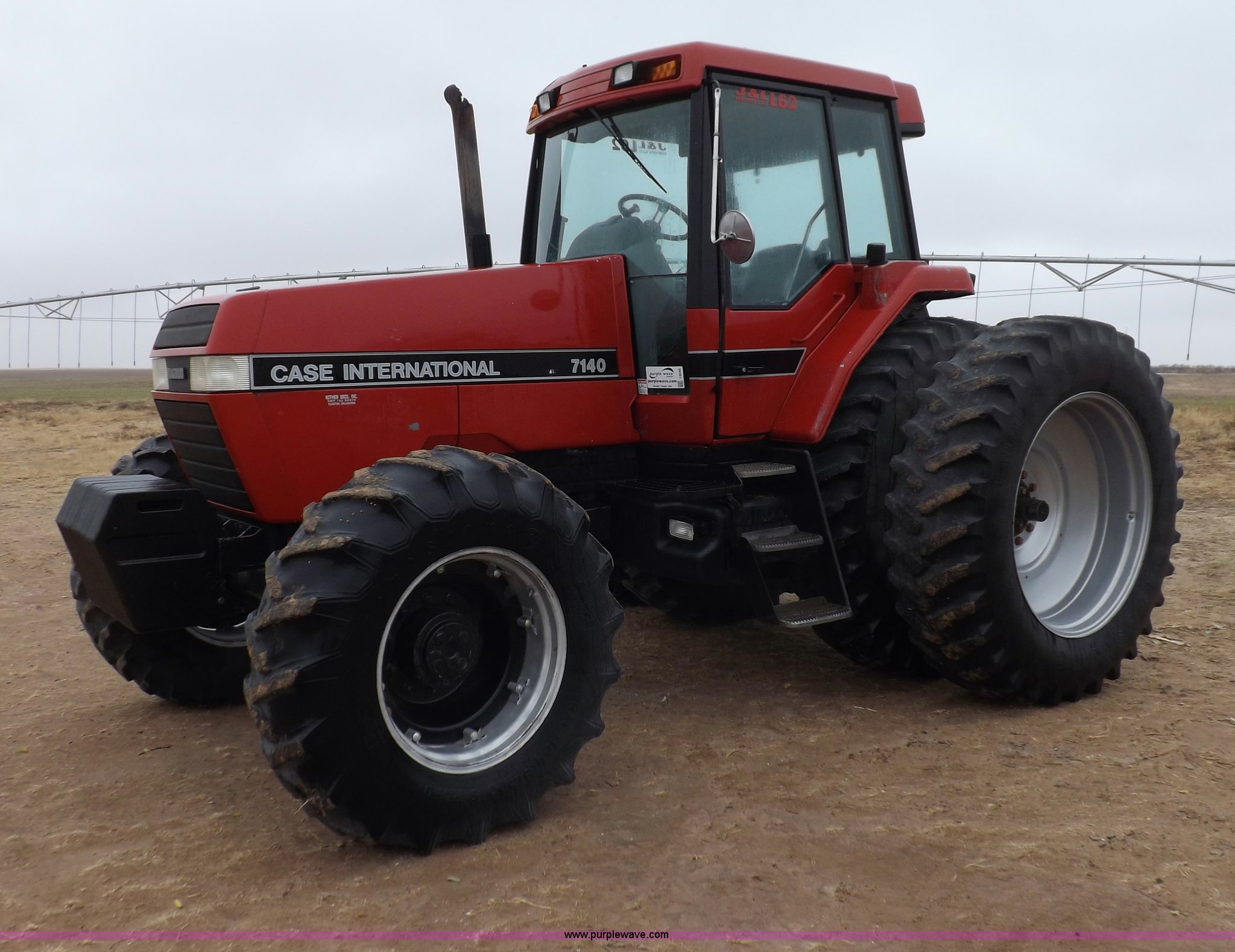 Purple Wave is selling a used Tractor in Oklahoma. This item is a 1990 Case IH 7140 MFWD tractor with the following: 6,027 hours on meter, CDC 8.3L six cylinder turbo diesel engine, 195 HP, Powershift transmission, 18F-4R gears, Differential lock, AC and heat, AM/FM/CD, Spring suspension seat, Tilt steering wheel, Three point, Draw bar, Hammer strip, Auxiliary outlet, 1000 PTO, (18) suitcase weights, 95 gallon fuel tank, 118" wheelbase, 16.9-28 front tires, 18.4R42 dual rear tires, Cracked right rear fender, Serial JJA0030010