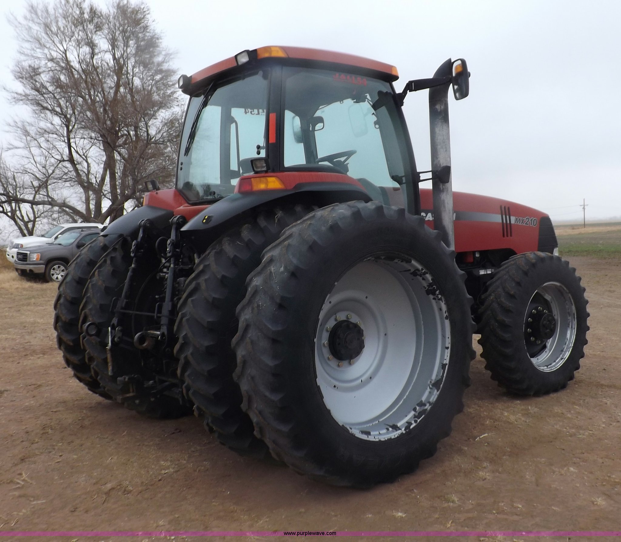 Purple Wave is selling a used Tractor in Oklahoma. This item is a 2005 Case IH MX210 MFWD tractor with the following: 3,761 hours on meter, Case IH 8.3L six cylinder turbo diesel engine, 210 HP, Powershift transmission, 18F-4R gears, Differential lock, AC and heat, AM/FM/cassette, Air suspension seat, Instructor's seat, Ground radar, Tilt steering wheel, Shades and visors, Foot throttle, Three point, Quick attach, Auxiliary outlet, 540/1000 PTO, Large 1000 PTO, (4) rear hydraulic remote sets, Electrical outlet, (10) 100 lbs suitcase weights, (2) rear wheel weights, 118" wheelbase, Firestone 380/85R34 front tires, Goodyear 480/80R46 dual rear tires, Serial JAZ134679, Unit# L54