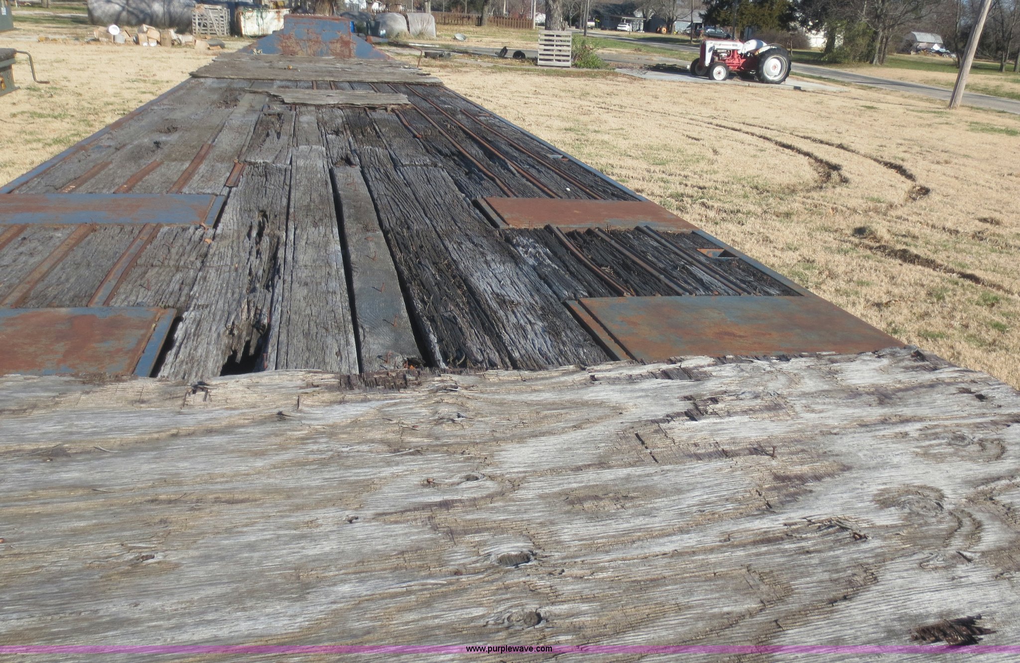 1978 Checker Cab CCM-21 flatbed trailer. 49' overall length, 96" overall width, Wood deck Needs replaced, Storage box, 12 ton capacity, Spring suspension, Air over hydraulic brakes, 9.00-20 tires. 1227. W&W Backhoe and Trenching. 201 Pecan. Mound Valley, KS 67354