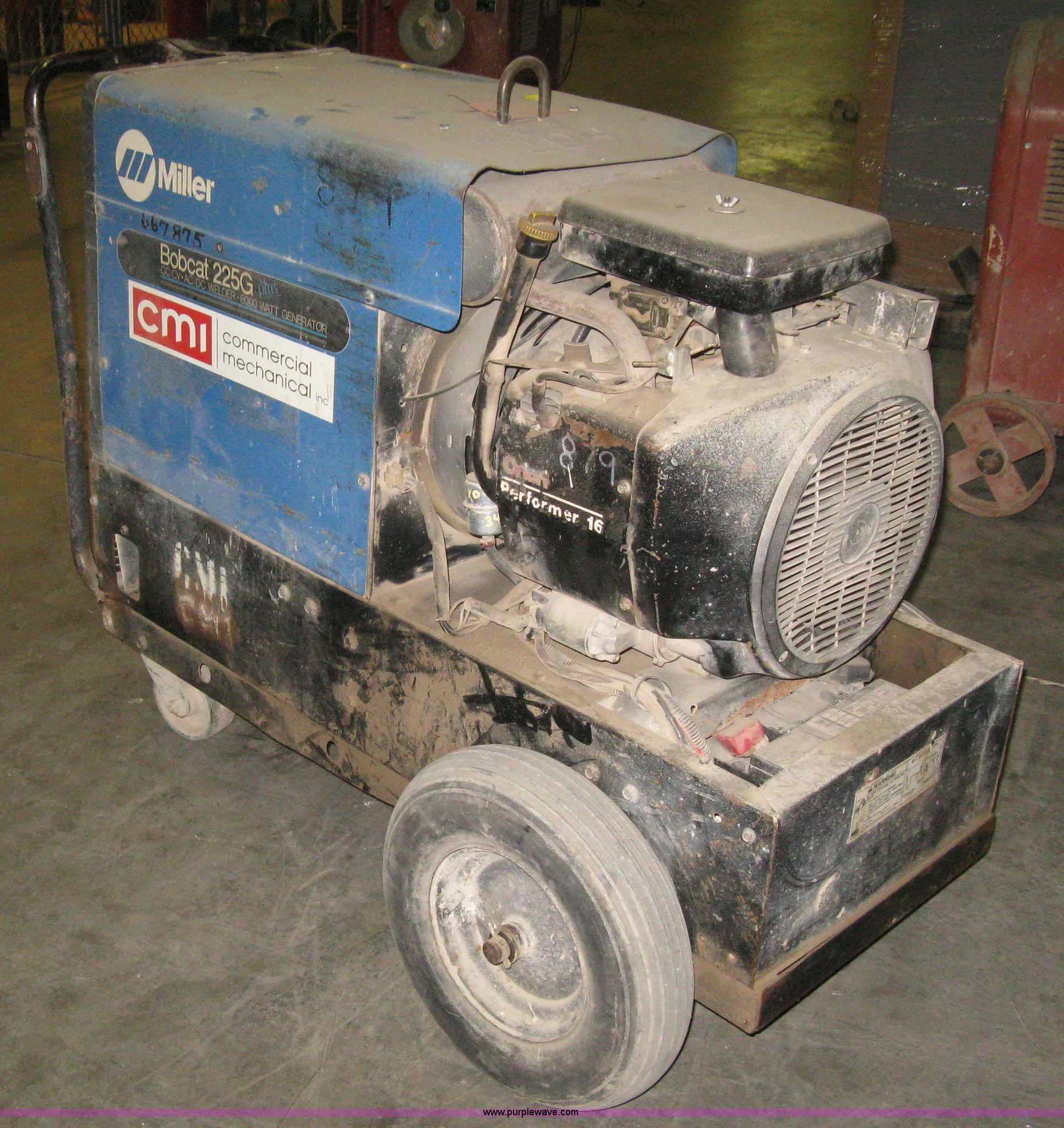Purple Wave is selling a used Welder (Manual) in Kansas. This item is a Miller Bobcat 225G welder/generator with the following: 3,855 hours on meter, Onan Performance 16 gas engine, 120/240V, Single phase, 70/35 amps, 8,000 watt generator, CC/CV - AC/DC welder, Roll-around cart, Engine inoperable, Needs replaced or rebuilt, Serial KG099095