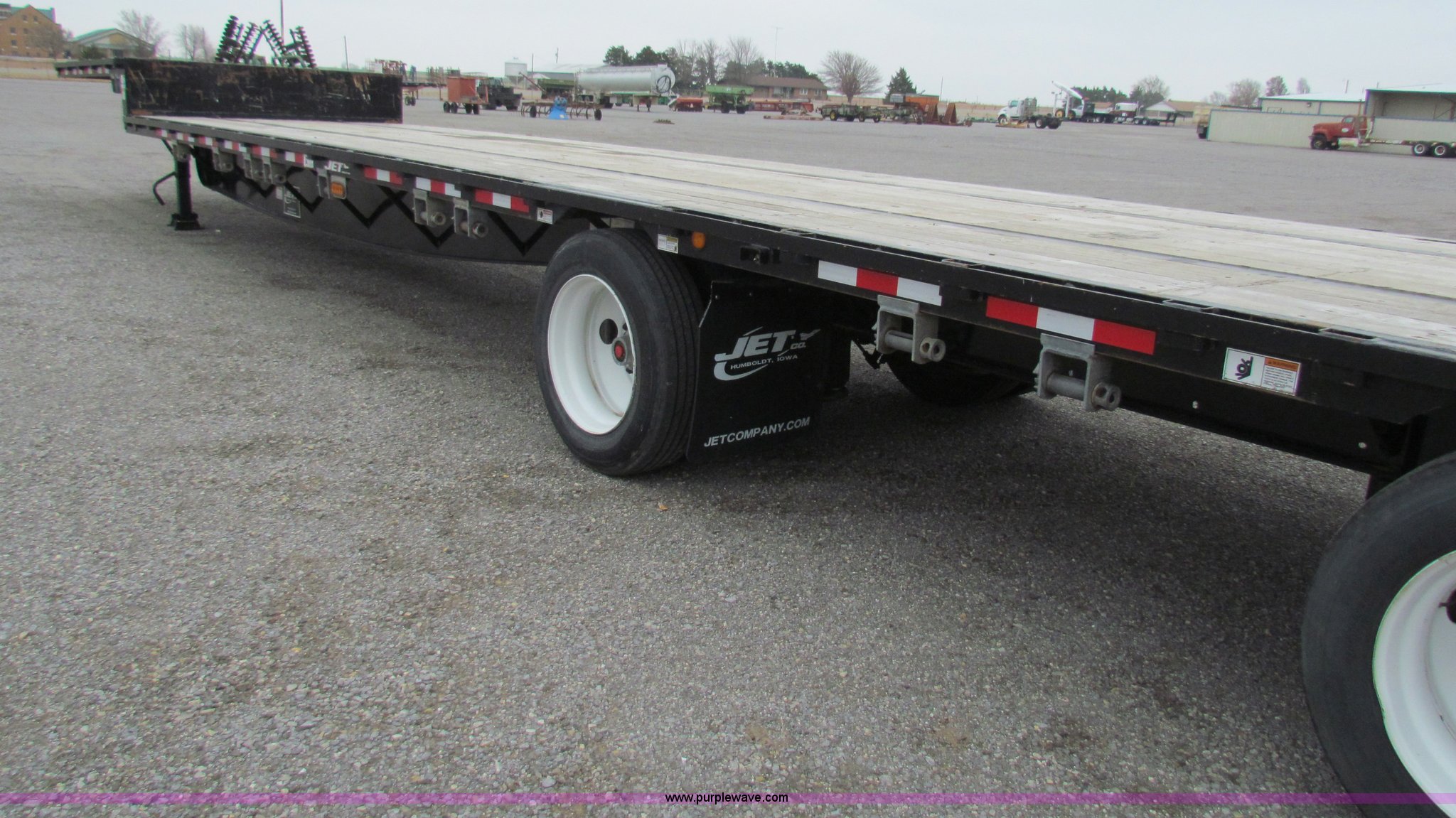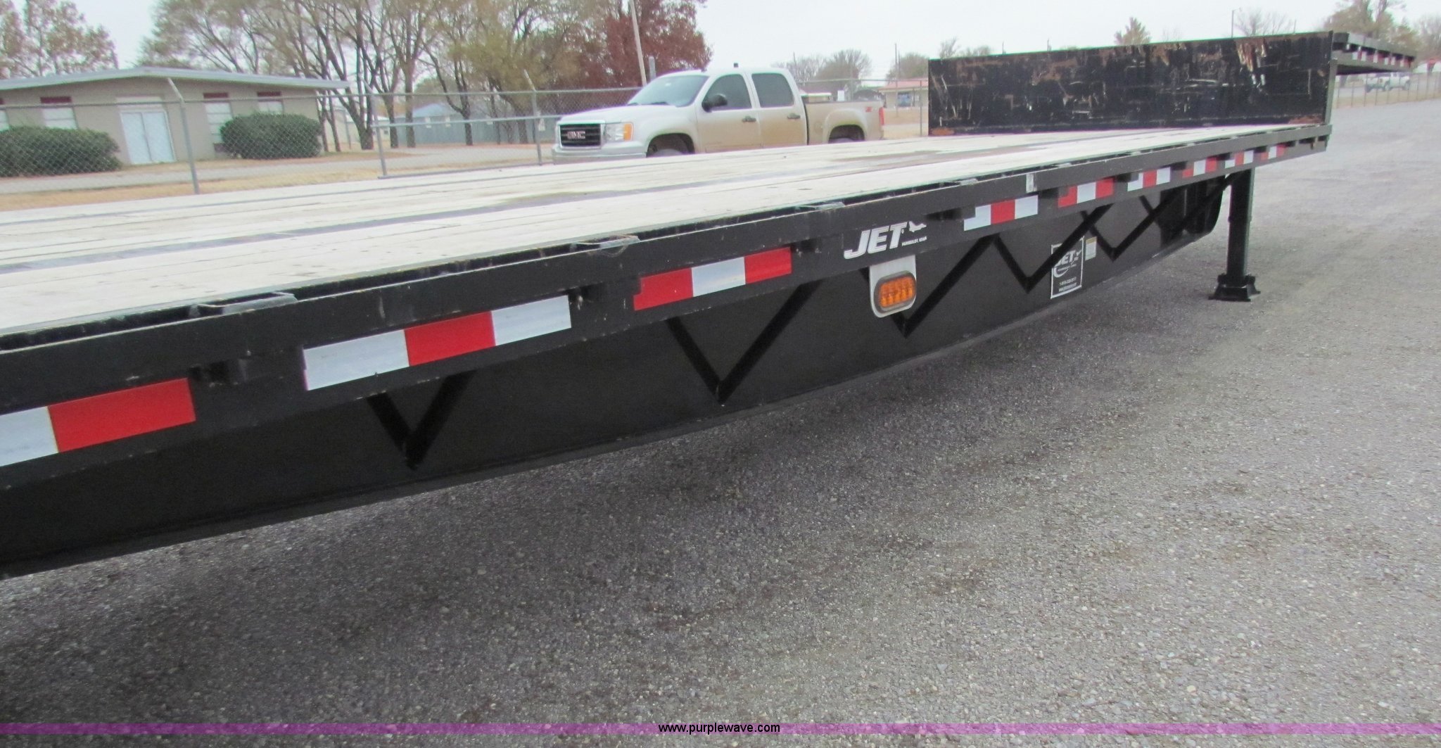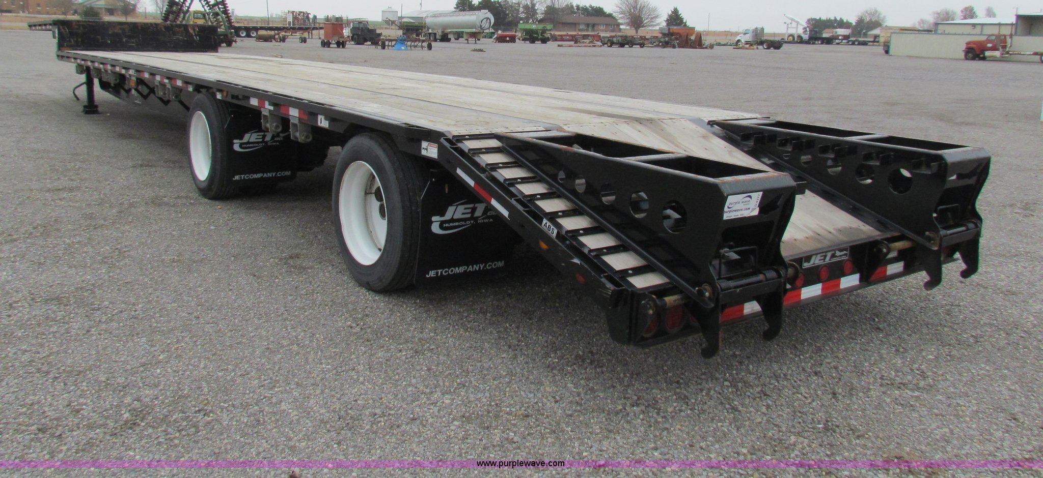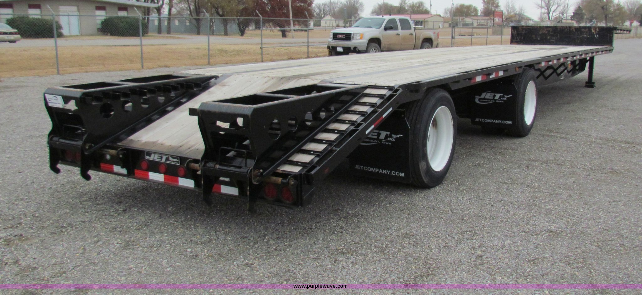 Purple Wave is selling a used Flat or Drop Deck Trailer in Oklahoma. This item is a 2012 Jetco 531 step deck trailer with the following: 37'L flat deck, 11'L upper deck, 5'L dovetail, 102"W, Folding ramps, Wood floor, (10) racket strap tie downs, LED lights, Spread axle, Mud flaps, Air suspension, Air brakes, 255/70R22.5 tires, GVWR 80,000 lbs