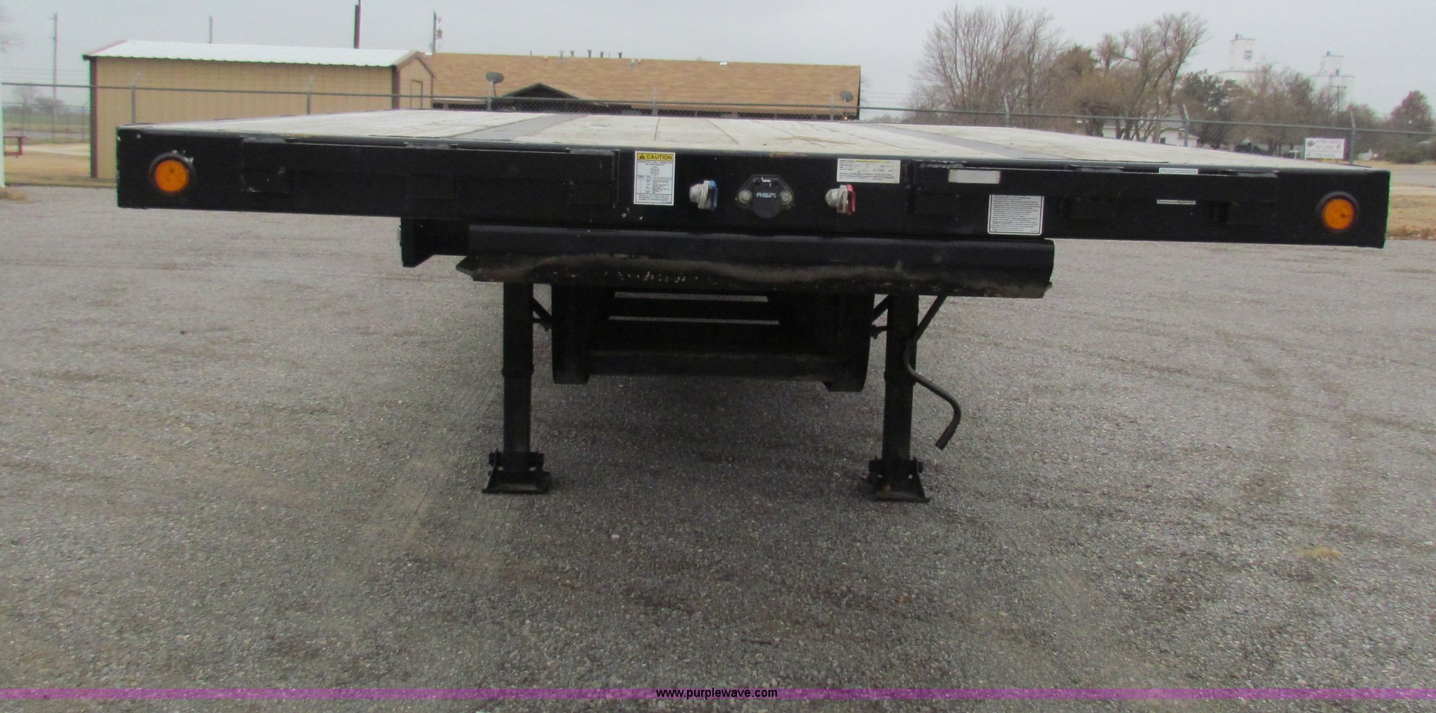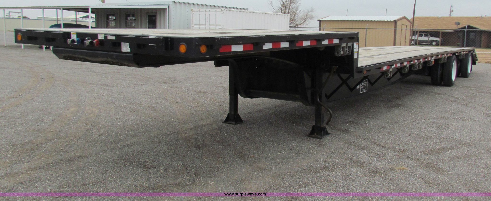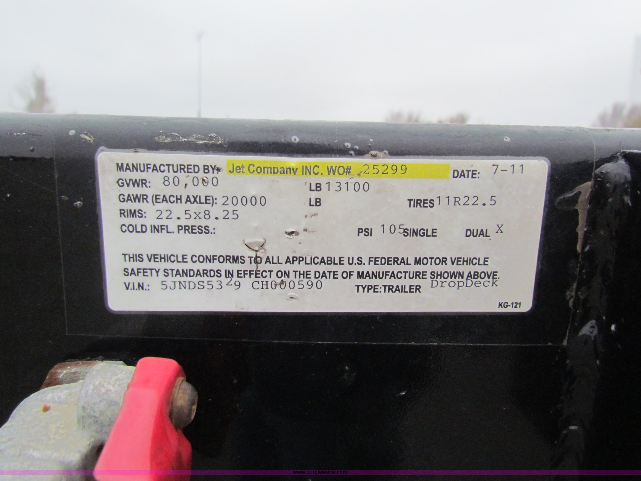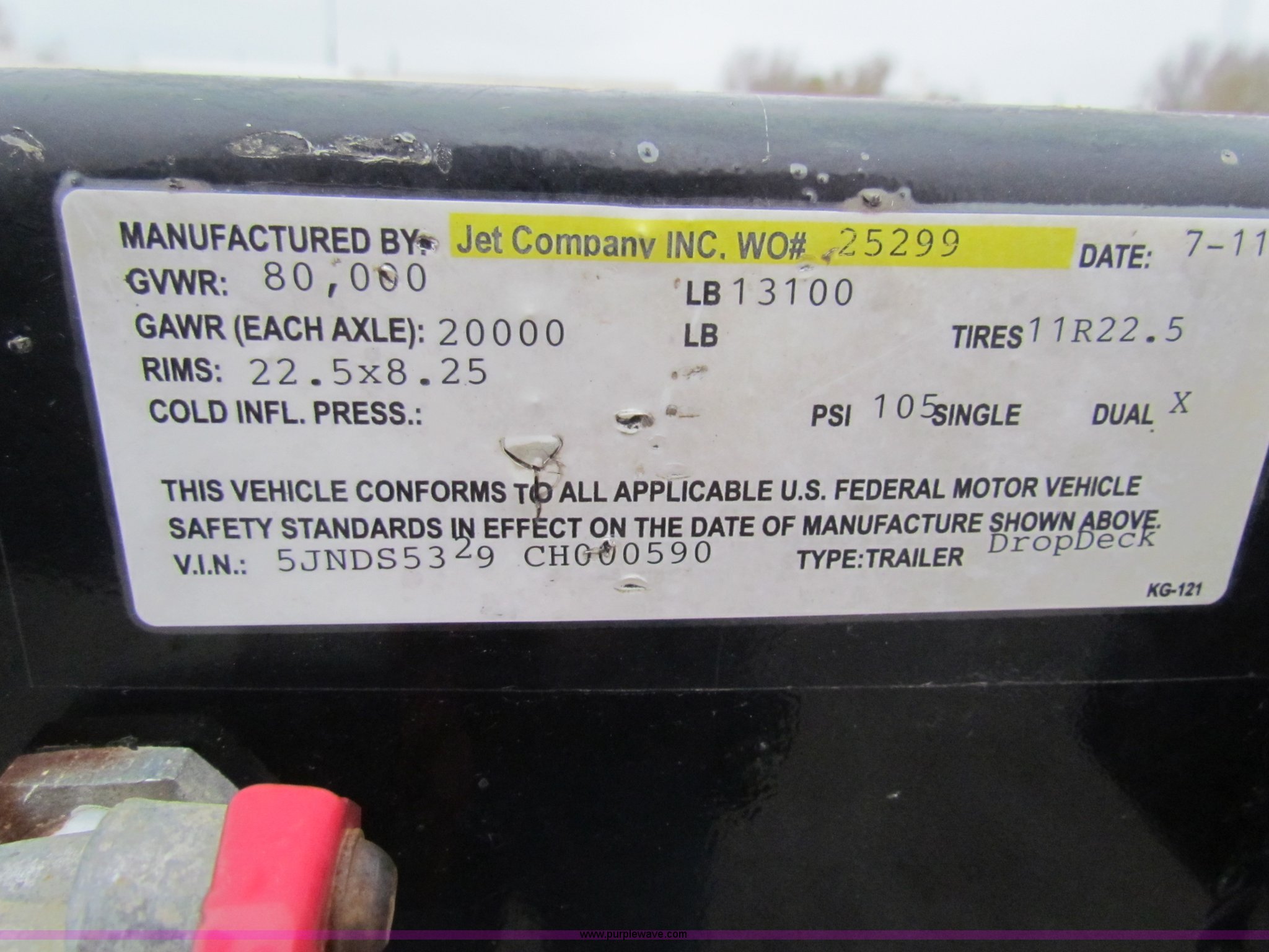Purple Wave is selling a used Flat or Drop Deck Trailer in Oklahoma. This item is a 2012 Jetco 531 step deck trailer with the following: 37'L flat deck, 11'L upper deck, 5'L dovetail, 102"W, Folding ramps, Wood floor, (10) racket strap tie downs, LED lights, Spread axle, Mud flaps, Air suspension, Air brakes, 255/70R22.5 tires, GVWR 80,000 lbs