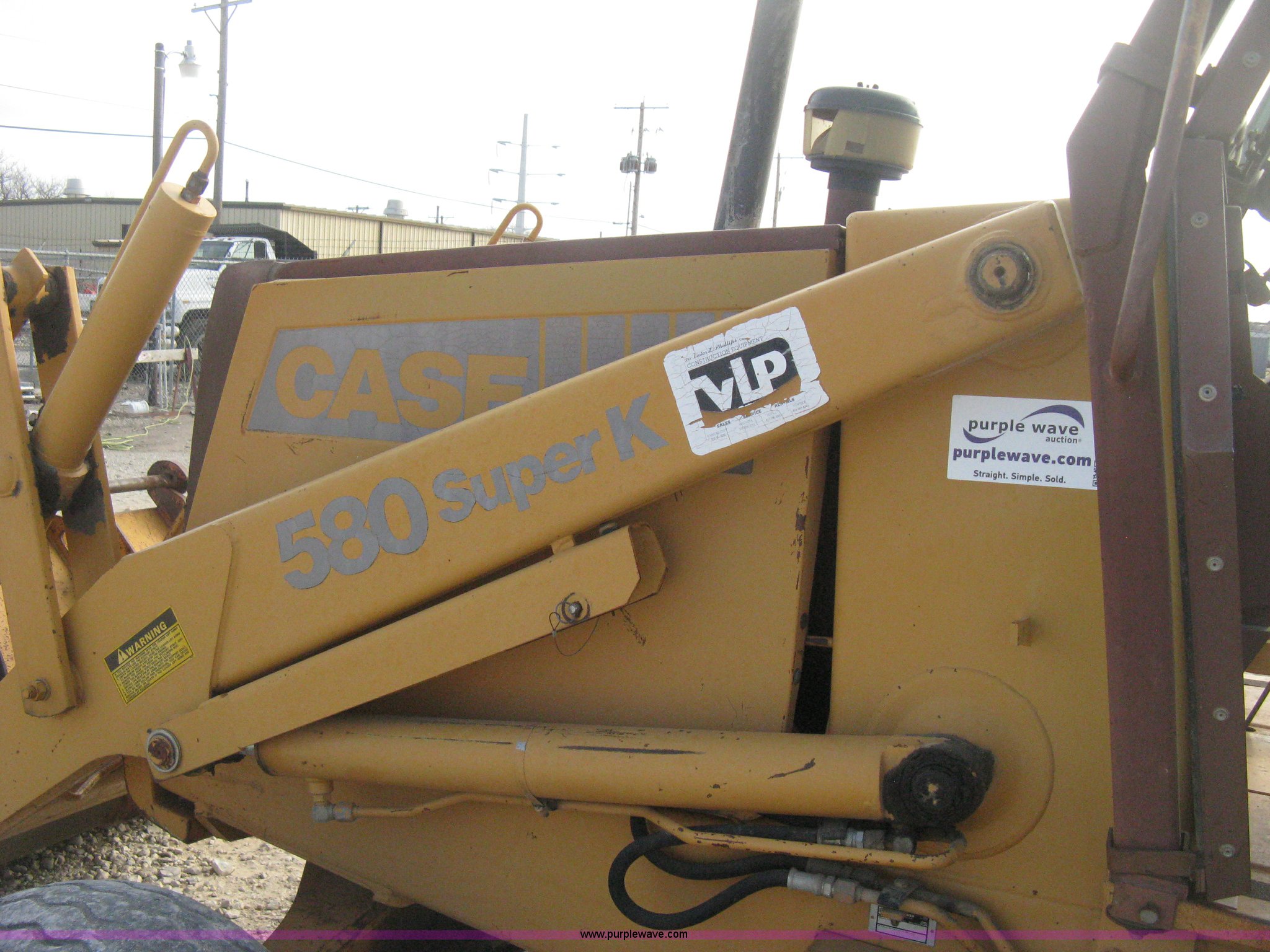 Purple Wave is selling a used Tractor Loader Backhoe in Kansas. This item is a 1991 Case 580 Super K Construction King backhoe with the following: 5,998 hours on meter, Four cylinder diesel engine, Model 4-390, Serial 44616153, Four speed shuttle shift transmission, OROPS, Suspension seat, Vandel guards, Joystick loader controls, Work lights, 82" loader bucket, Bolt-on edge, 18" toothed backhoe bucket, Hang-on pallet forks, 42"L x 4"W, Outriggers with dirt pads, 11L-16SL front tires, 19.5L-24 rear tires, 13,516 lbs. base operating weight, Serial JJG0163254