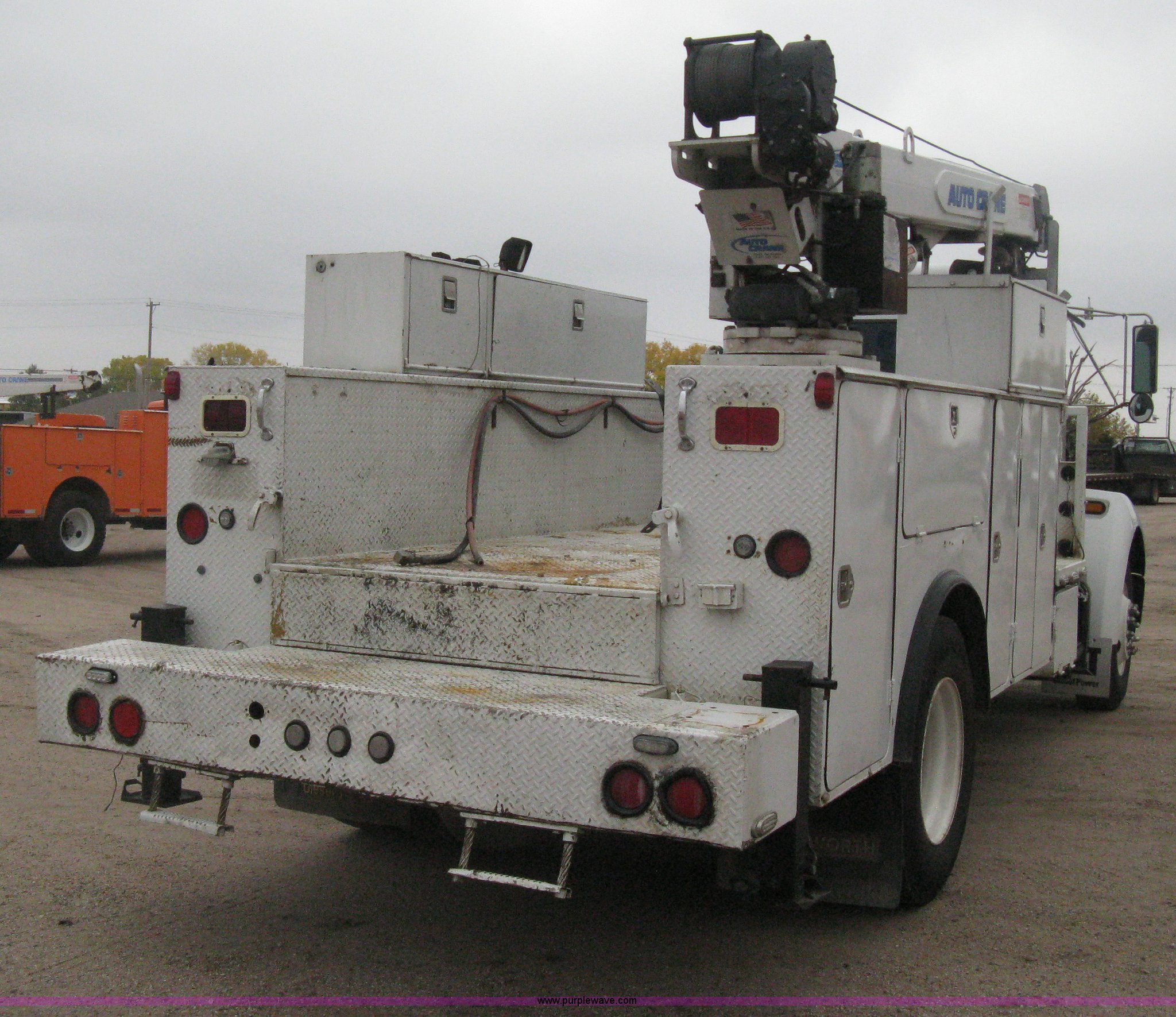 Purple Wave is selling a used Service Truck in Kansas. This item is a 2002 Kenworth T300 mechanic truck with the following: 235,101 miles on odometer, 11,234 hours on meter, Caterpillar 3126 7.2L diesel engine, 10 speed manual transmission, AC and heat, AM/FM/CD, Air suspension seat, Auto Crane 6006EH telescopic crane, Tethered remote, Serial 6006EH-0207-061, Service bed, 94"W x 11'L, 32" front platform, Step up counter weight bumper, 24"L, Diamond plate floor, Recessed tie-downs, Air remotes, Work lights, (8) tool compartments, (3) top mount toolboxes, Built in tool trays, Two post out riggers, Single exhaust stack, Spring suspension, Air brakes, Front wheel nut covers, GVWR 33,000 lbs, FAWR 10,000 lbs, RAWR 23,000 lbs, 11R-22.5 tires, Exterior rust damage to bed, Unit# 05.28