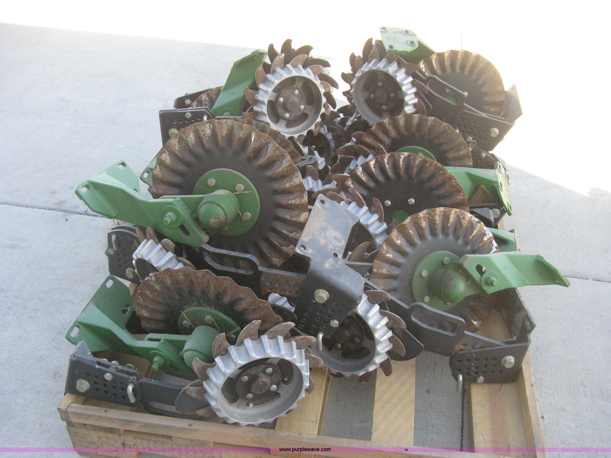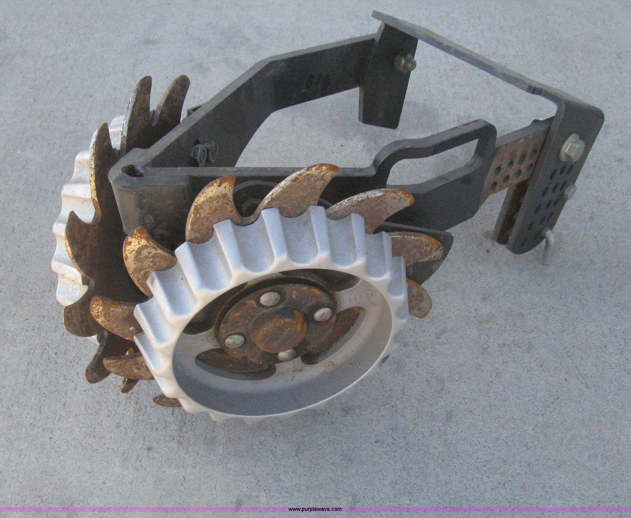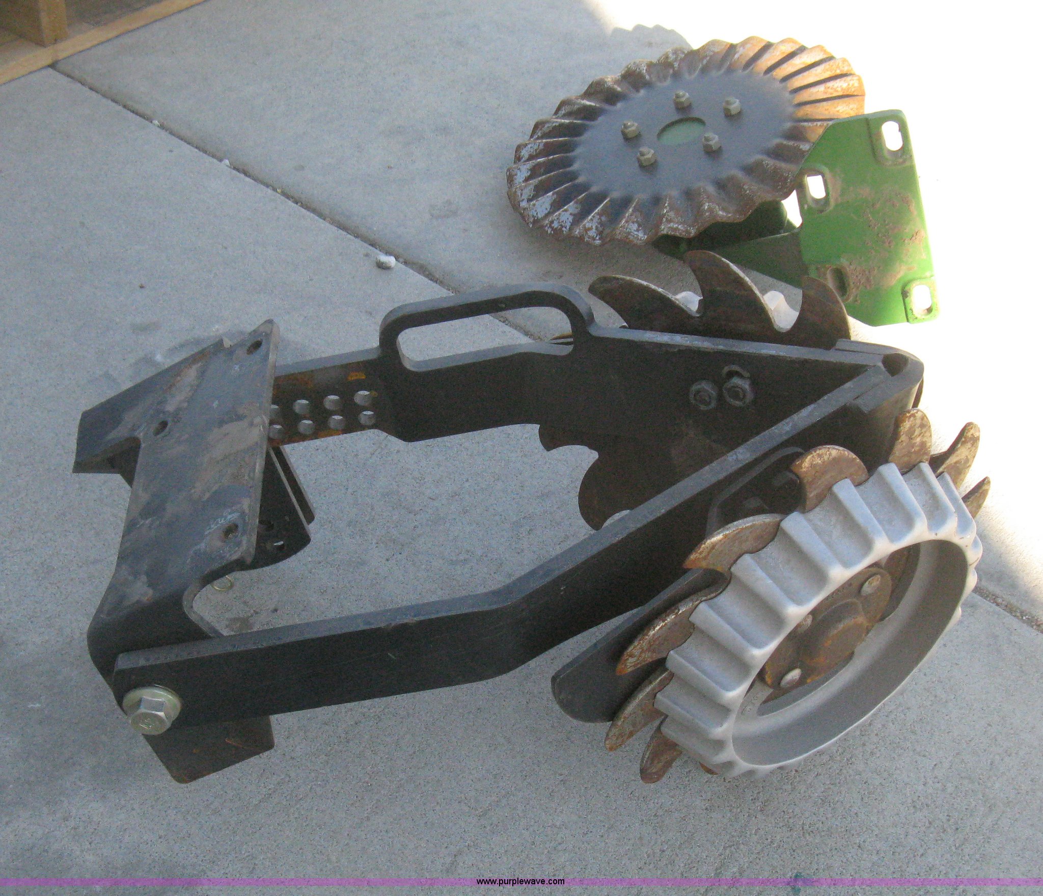 Purple Wave is selling a used Planter or Seeder Attach. in Kansas. This item is a Disks and coulters with the following: (12) twin disk row cleaners with depth gauges, Mounting bracket, (12) coulters, Mounting bracket, Removed from John Deere 1720 planter