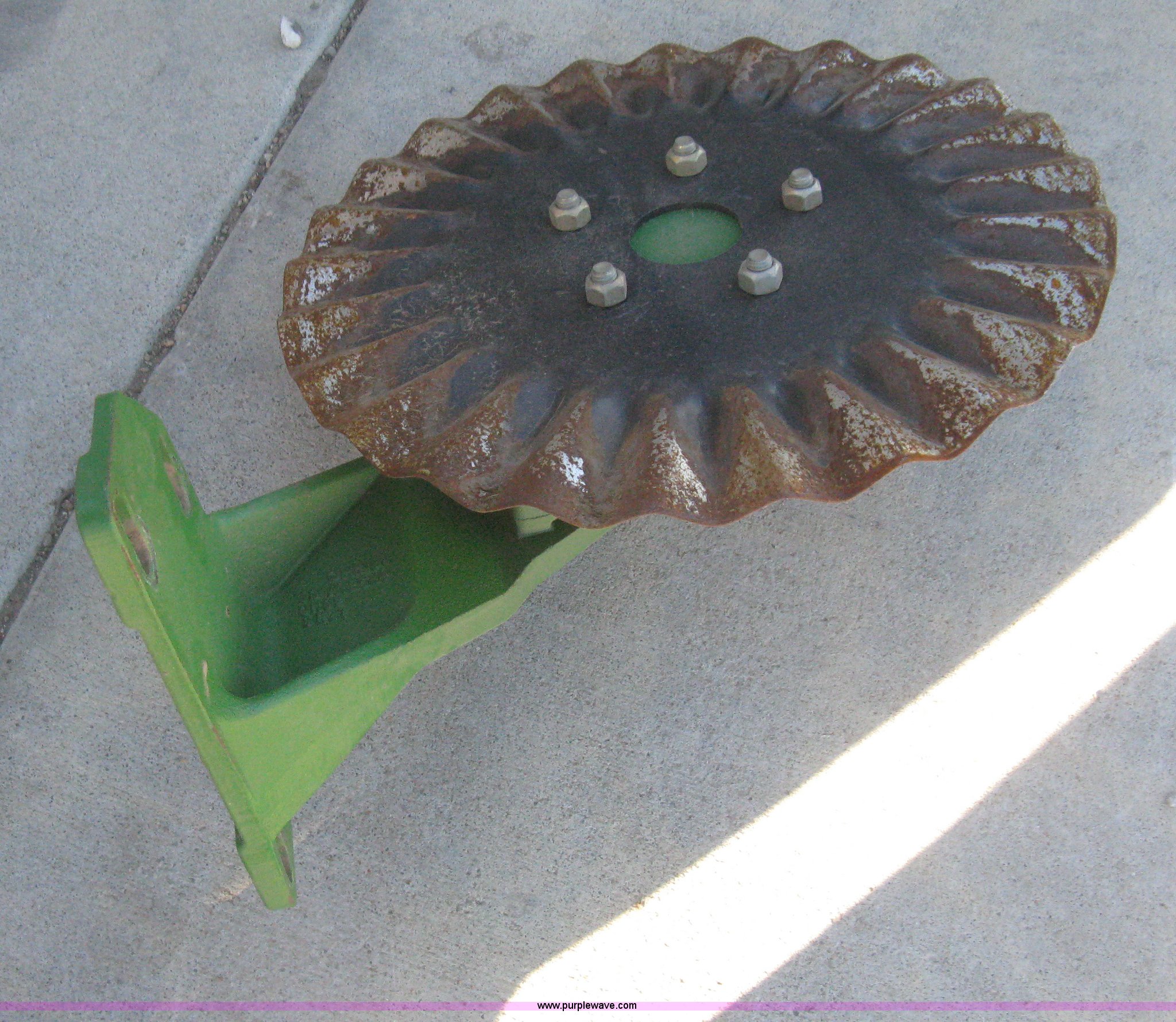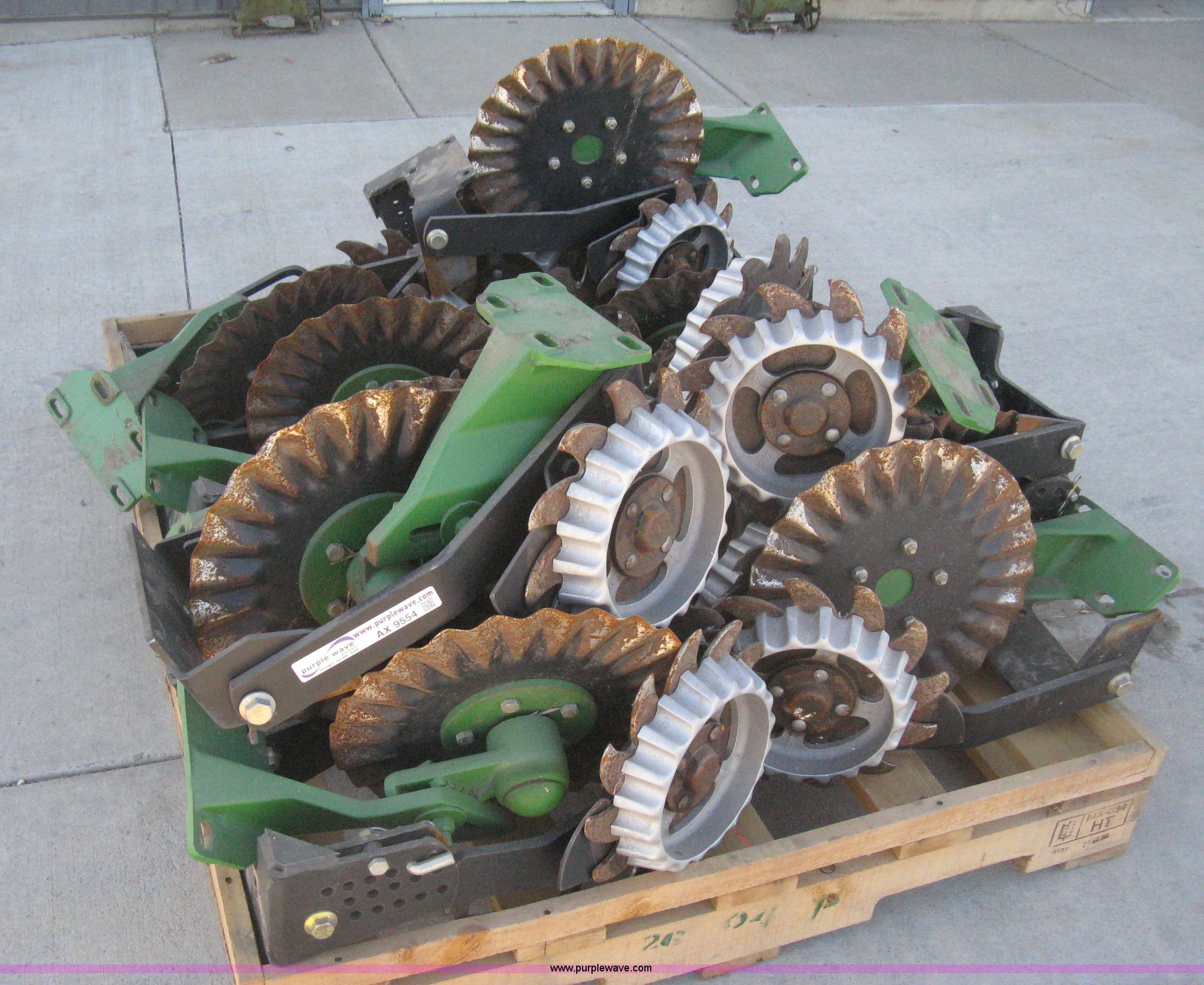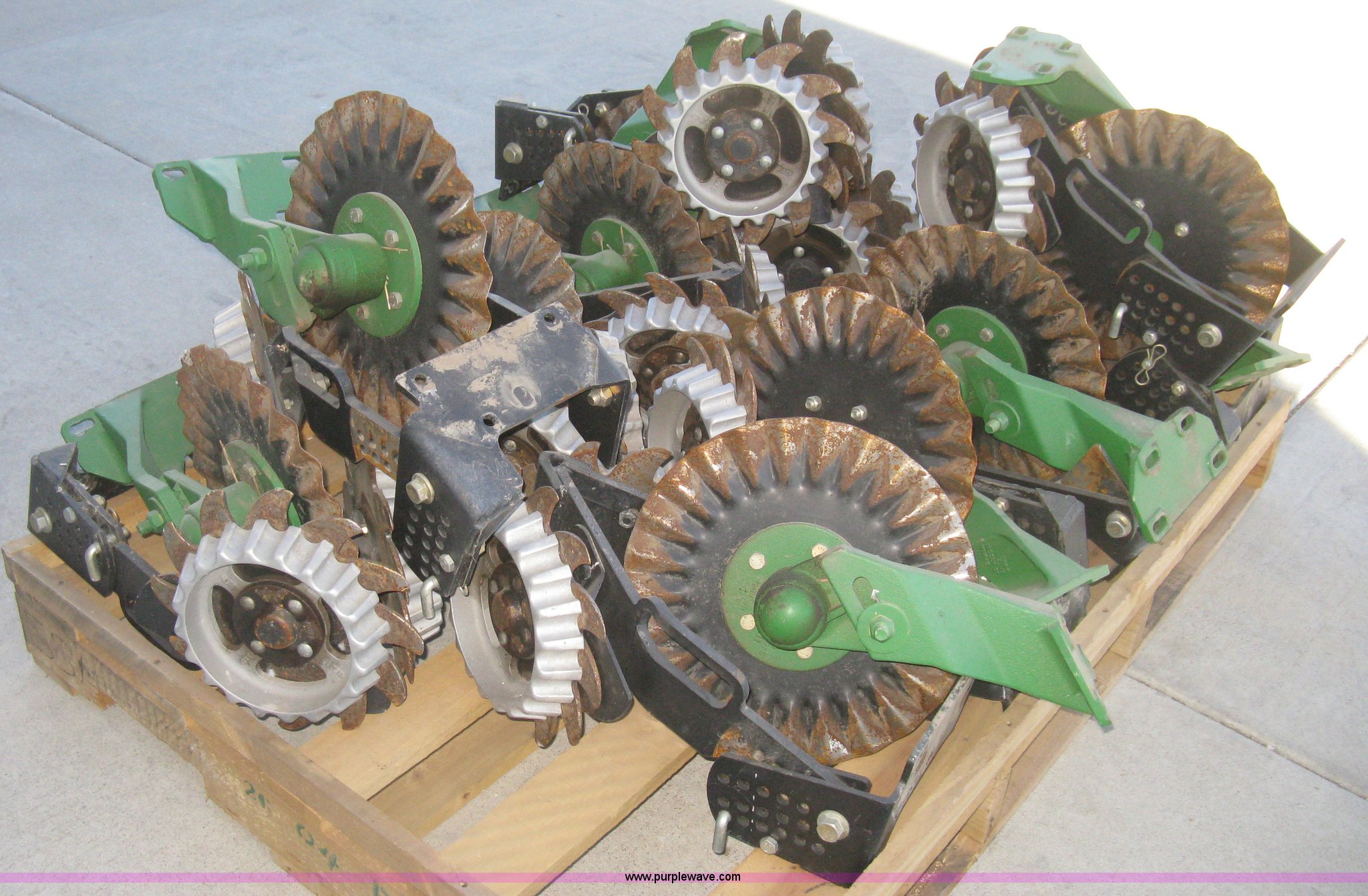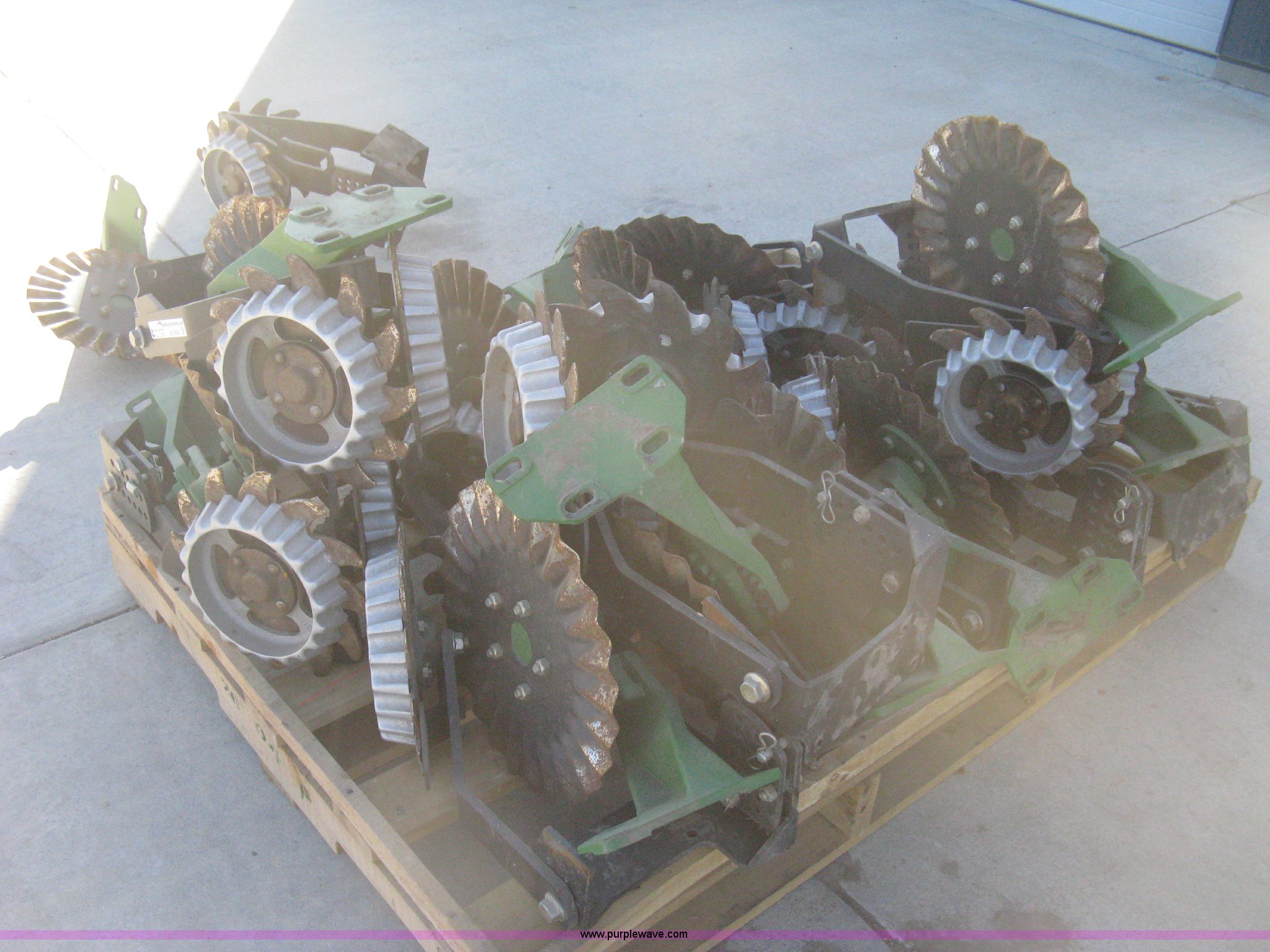 Purple Wave is selling a used Planter or Seeder Attach. in Kansas. This item is a Disks and coulters with the following: (12) twin disk row cleaners with depth gauges, Mounting bracket, (12) coulters, Mounting bracket, Removed from John Deere 1720 planter