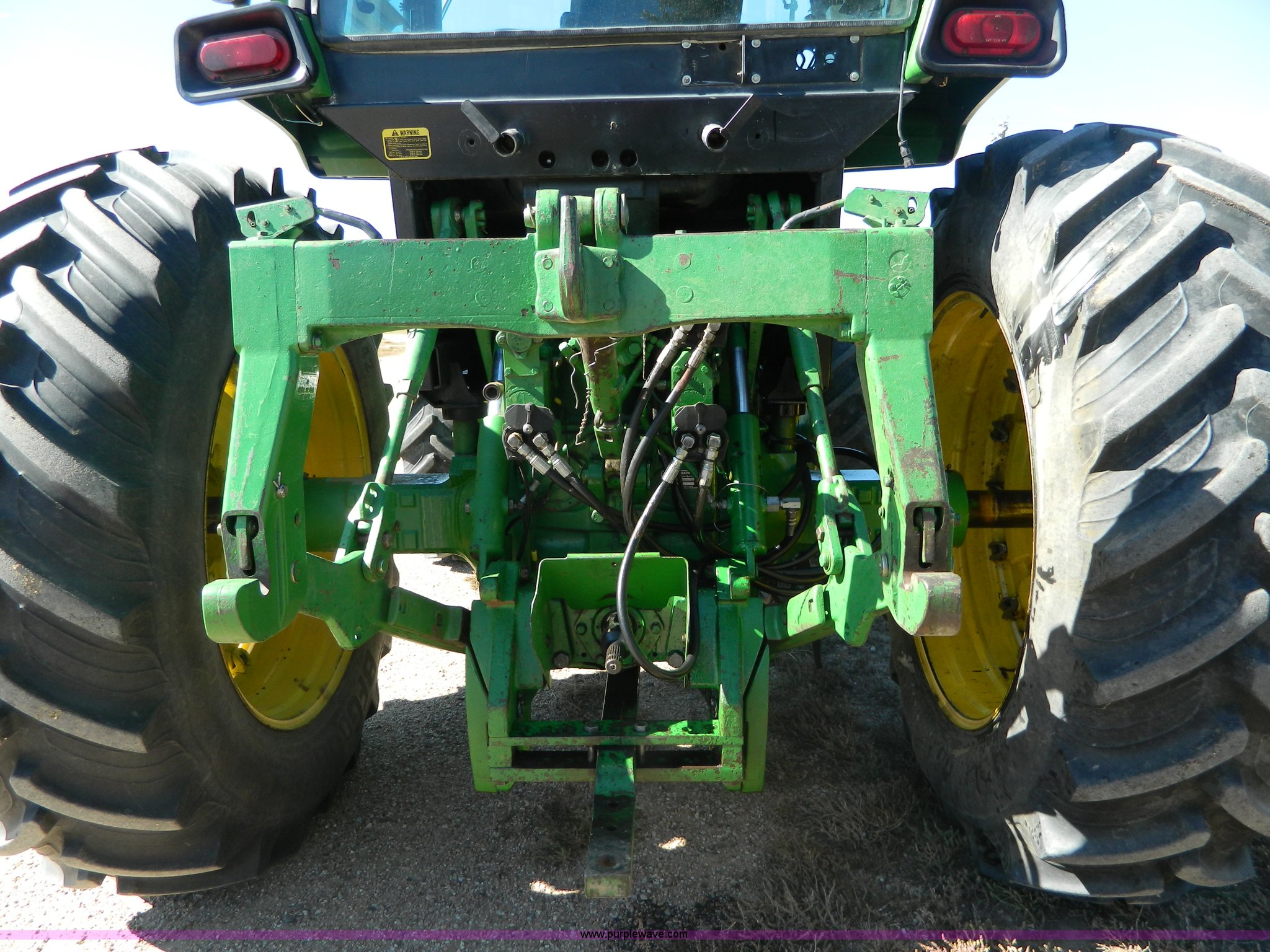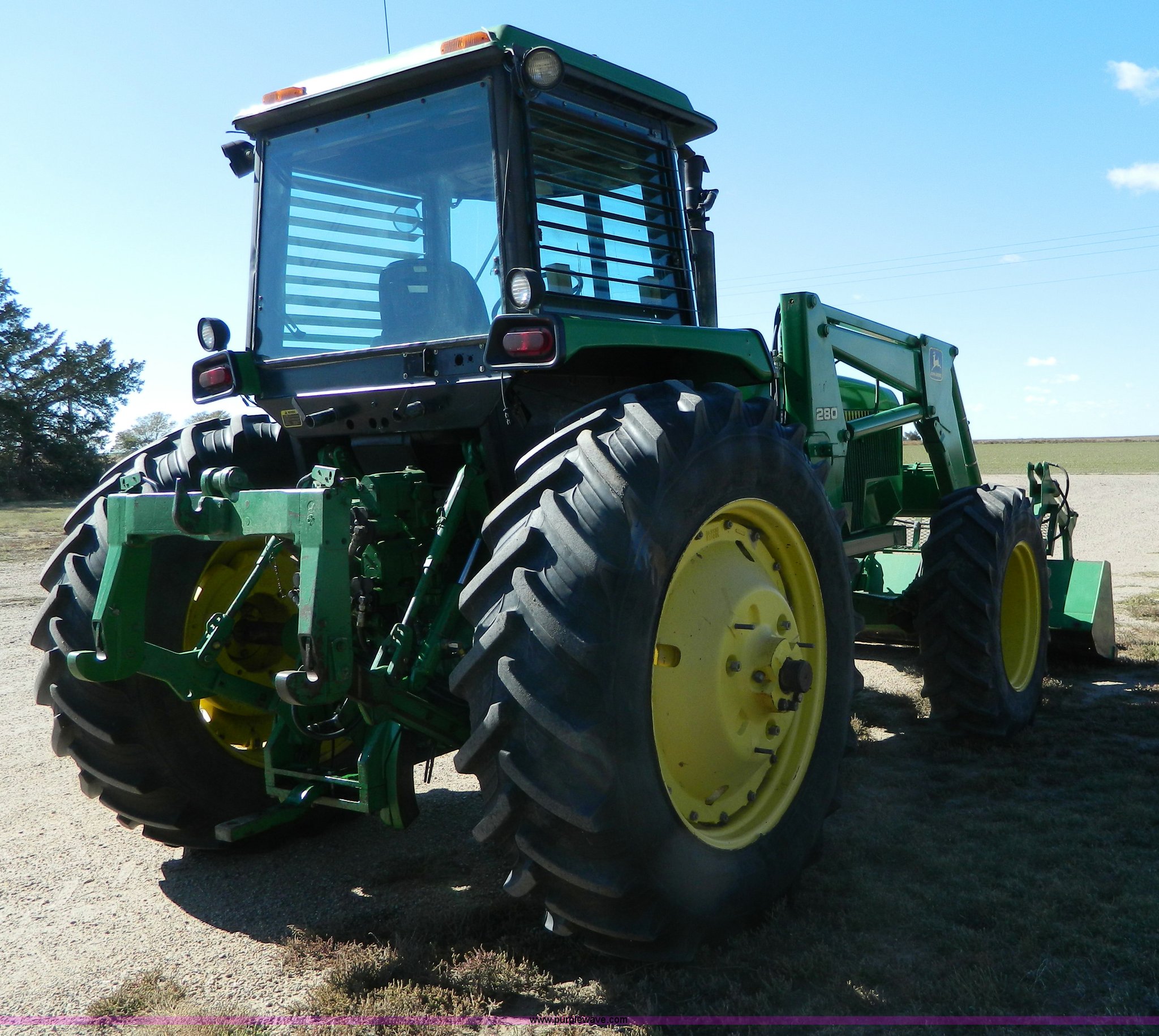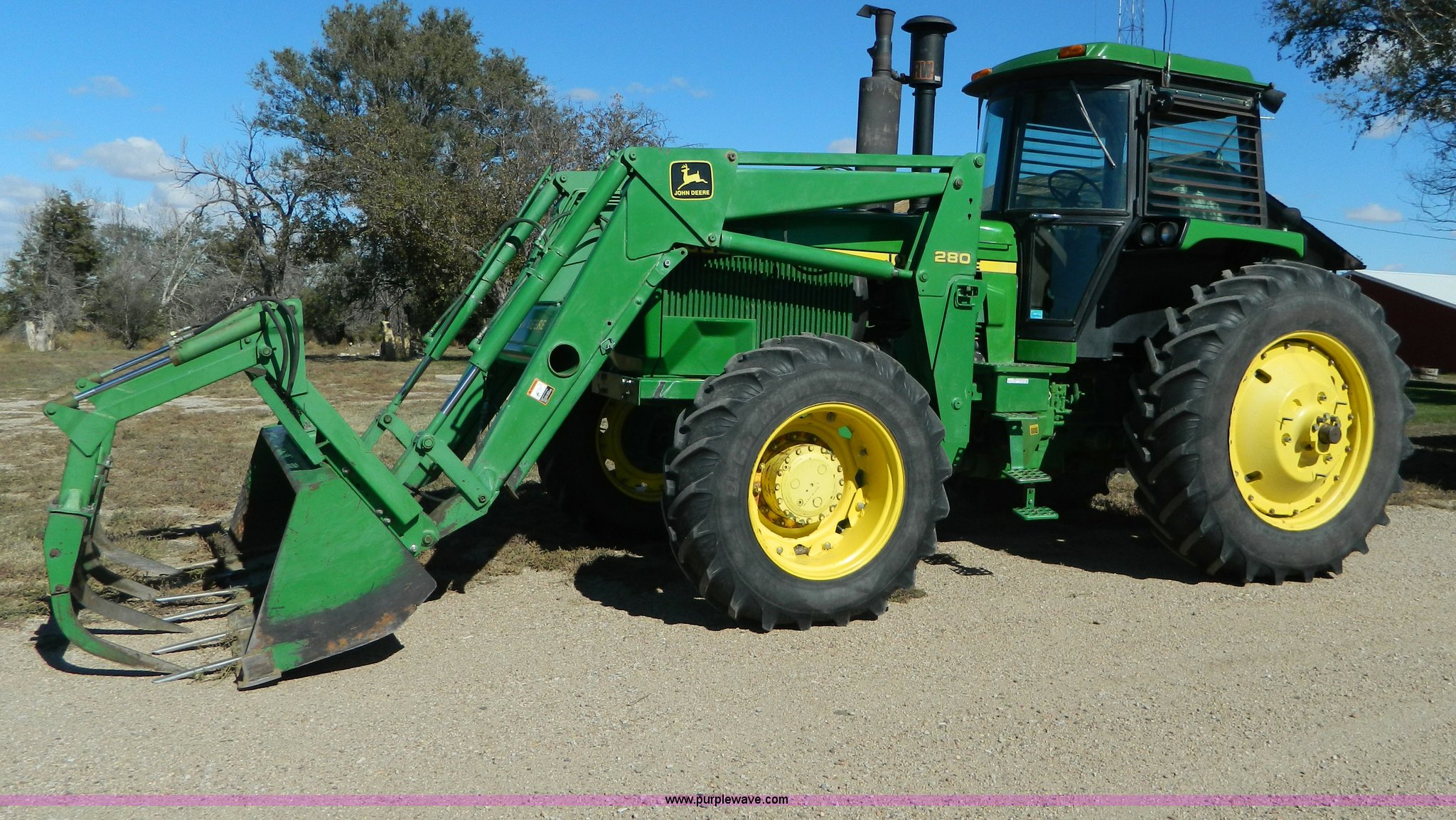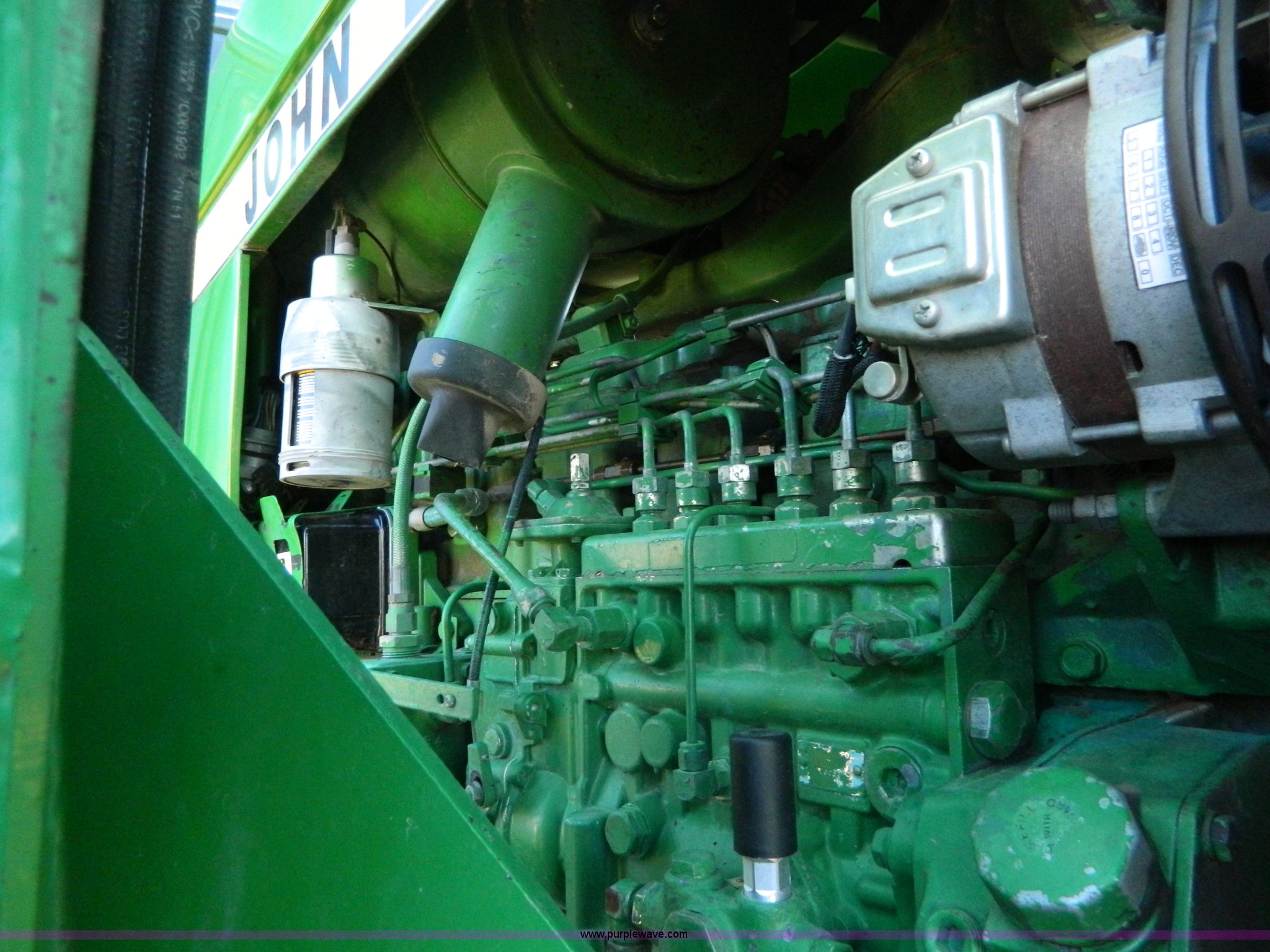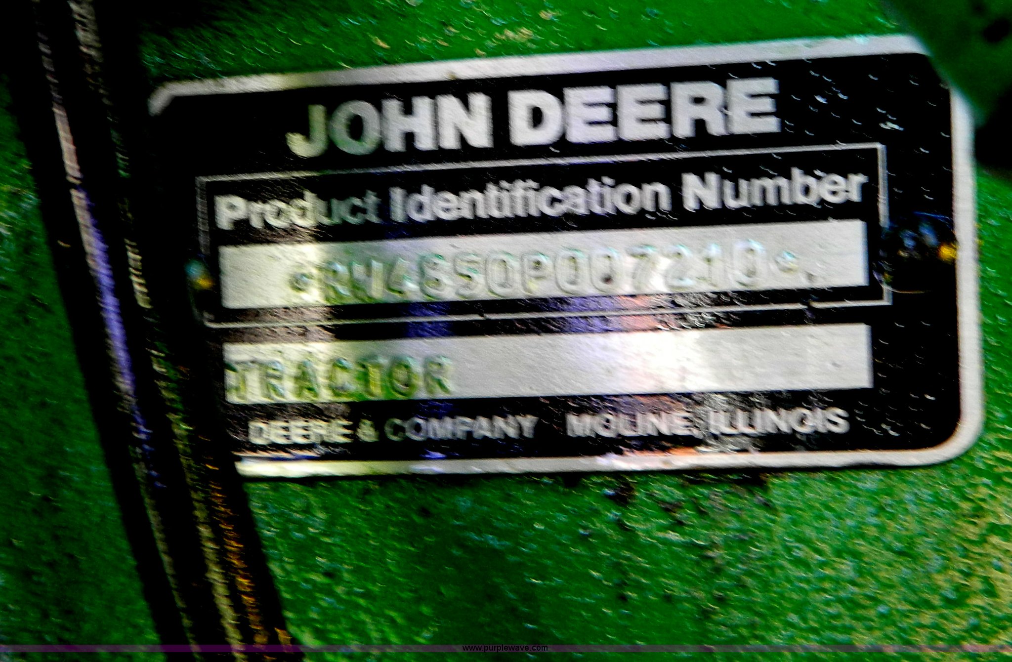 Purple Wave is selling a used Tractor in Kansas. This item is a 1984 John Deere 4850 MFWD tractor with the following: 11,259 hours on meter, John Deere six cylinder diesel engine, Serial RG6466A284133, Powershift transmission, 15F-4R gears, AC and heat, AC converted to R134A refrigerant, AM/FM, Air suspension seat, Tilt steering wheel, Shades and visors, Three point, Quick attach, Draw bar, 1000 PTO, (3) rear hydraulic remotes, 14.9-30 front tires, 18.4R42 dual rear tires, Stored inside, Loader not included, selling separately as AZ9109, Serial RW4850P007210