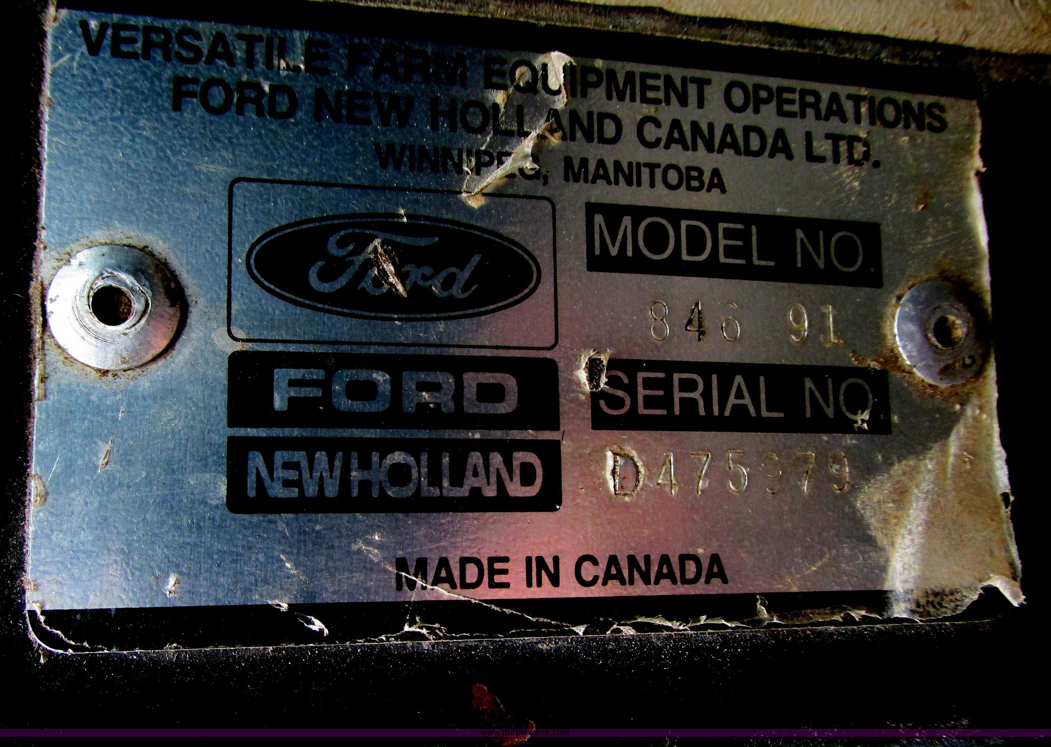 1991 Ford 846 Versatile 4WD tractor. 6,281 hours on meter, Cummins L10 611 C.I.D. six cylinder diesel engine 230 HP, Serial 34643734, Manual transmission 12F-3R gears, AC and heat, AM/FM/cassette, Spring suspension seat, Tilt steering wheel, Work lights, Three point Quick attach, Category 4, Draw bar, (4) rear hydraulic remotes , 460/85R38 dual tires, Possible LCD dash display issues, Main center articulating pin replaced November 2013, Serial D475979. View equipment video. Central Sod Farms. 12915 St Route 47. Newark, IL 60541