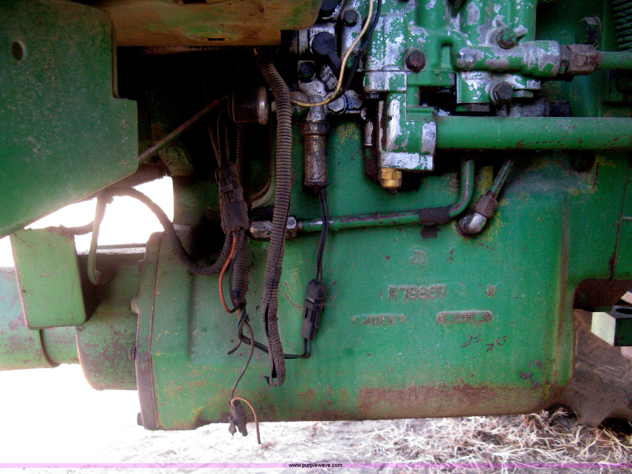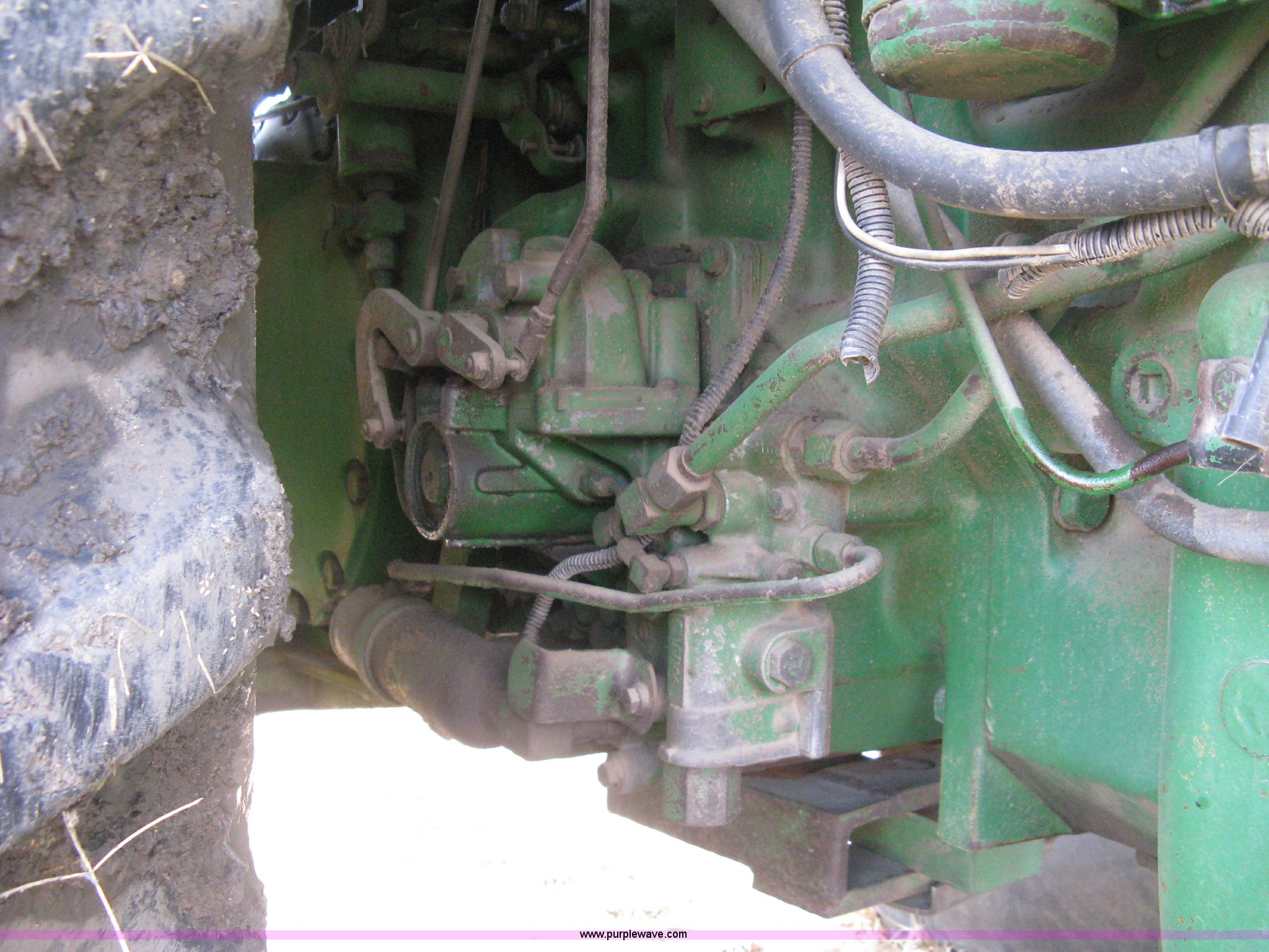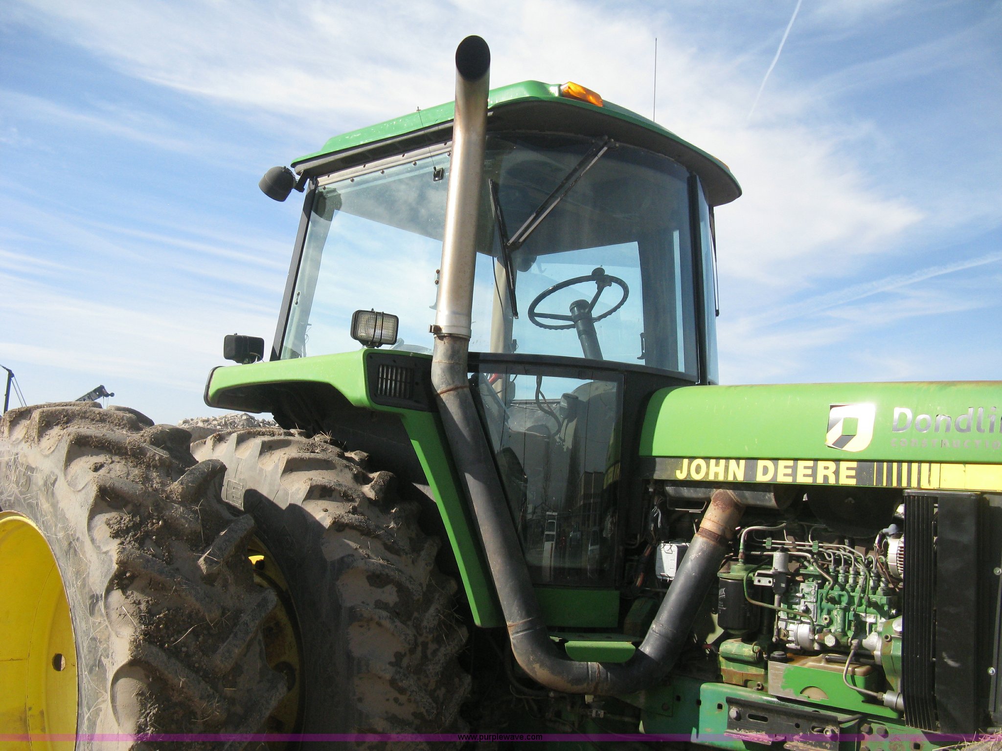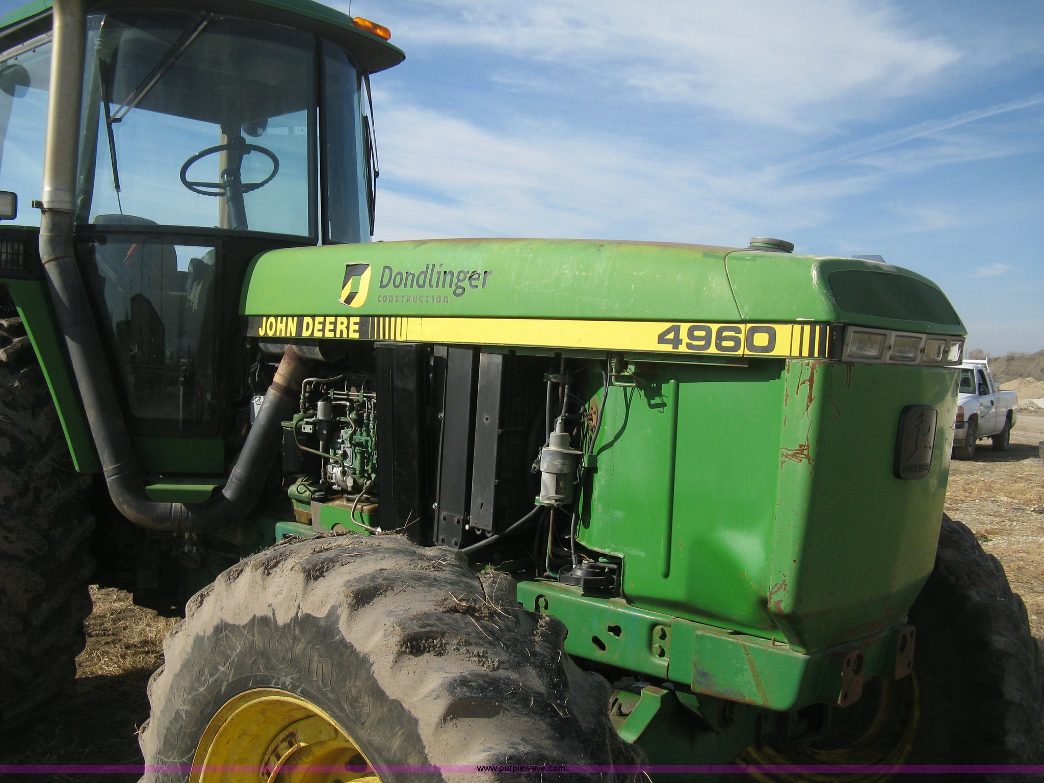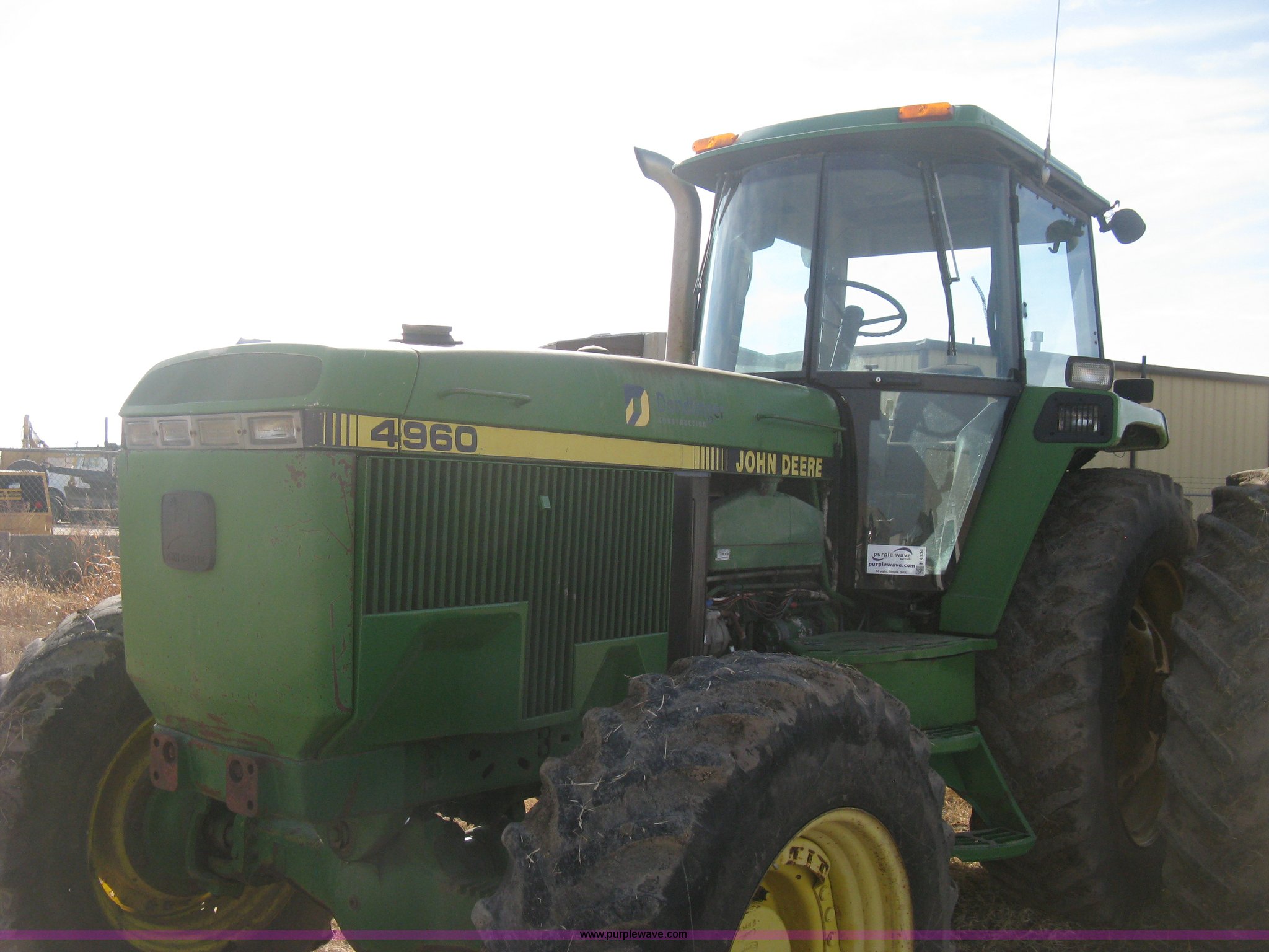 Purple Wave is selling a used Tractor in Kansas. This item is a 1992 John Deere 4960 MFWD tractor with the following: 1,313 hours on replaced meter, John Deere six cylinder diesel engine, Powershift transmission, 15F gears, AC and heat, AM/FM, Air suspension seat, Tilt steering wheel, Draw bar, Casting mount damaged at bolt holes, Auxiliary outlet, 1000 PTO, (3) sets of rear hydraulic remotes, (4) rear wheel weights, 380/85R30 front tires, 18.4R42 rear dual tires, Hydraulic leak at PTO shaft, Non-operational door latch, Rear cab glass missing, Serial RW4960P002624