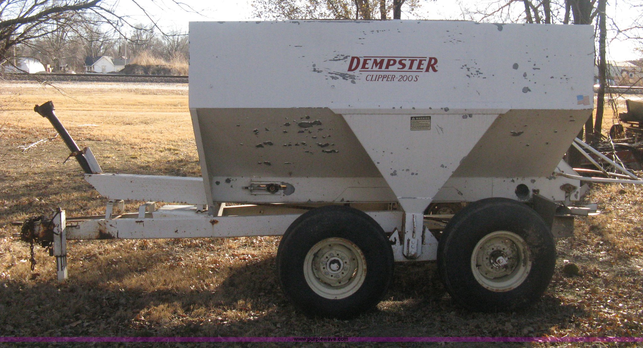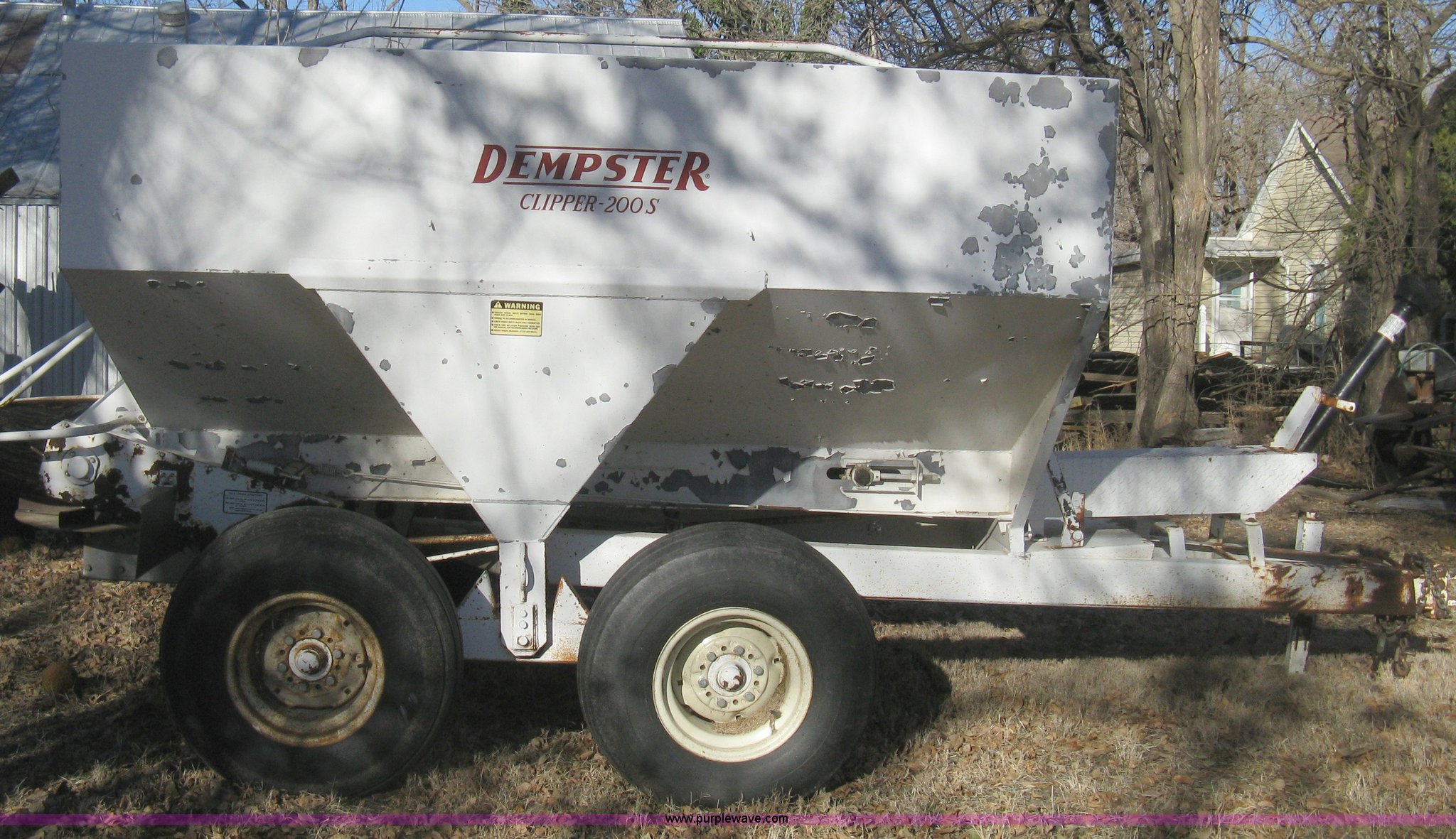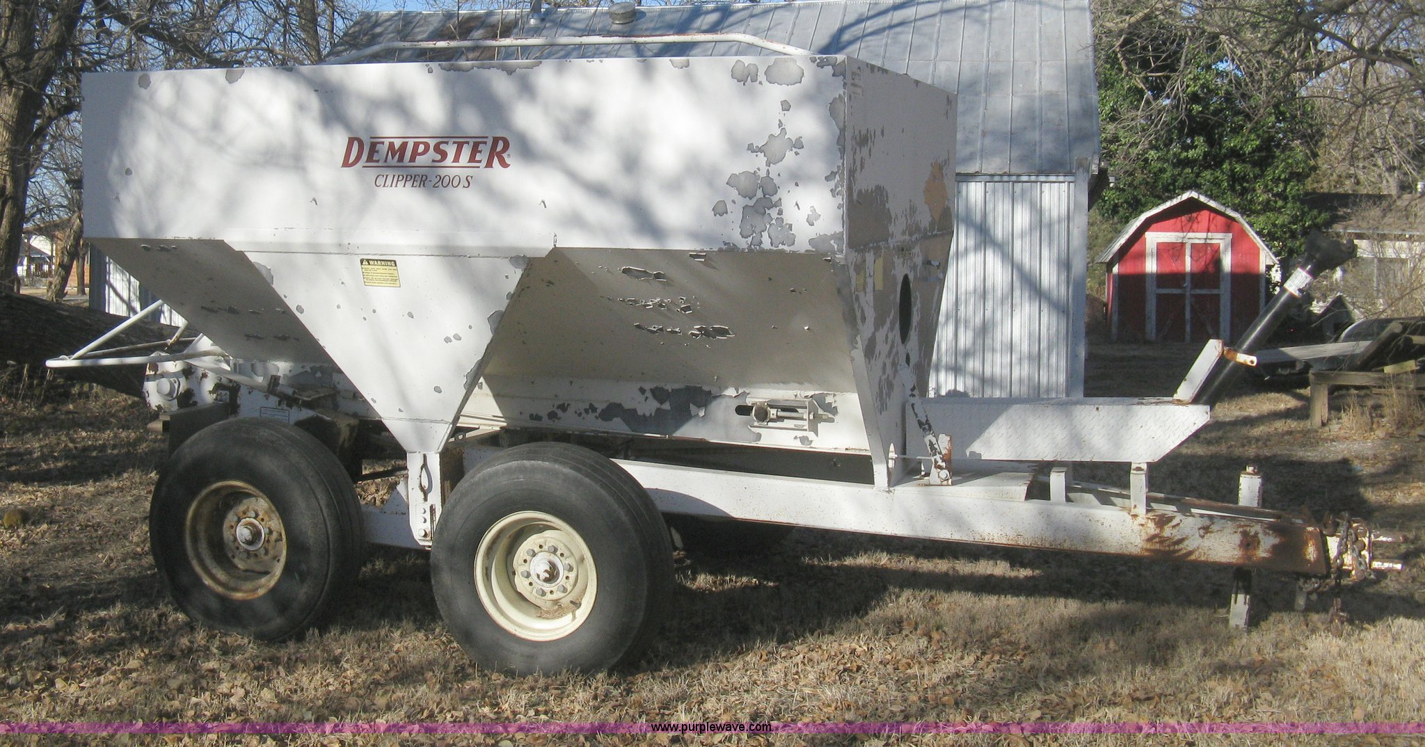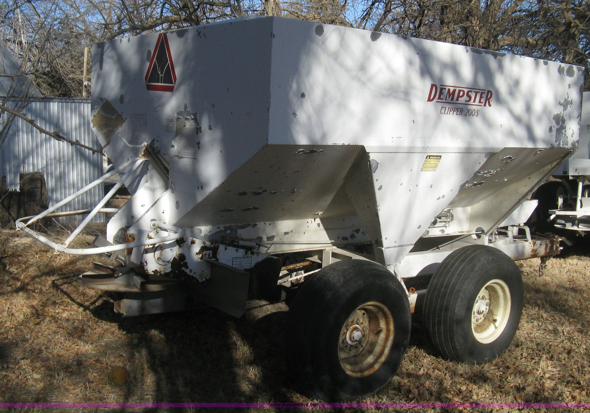 Purple Wave is selling a used Fertilizer or Seed Tender in Kansas. This item is a Dempster Clipper 200S dry fertilizer spreader with the following: 540 PTO drive spinner, Single disk broadcaster, Ground drive walking floor, Shaft drive, Pin hitch, Tandem axle chassis, 12.5L-15SL tires, Paint peeling, Serial 95102