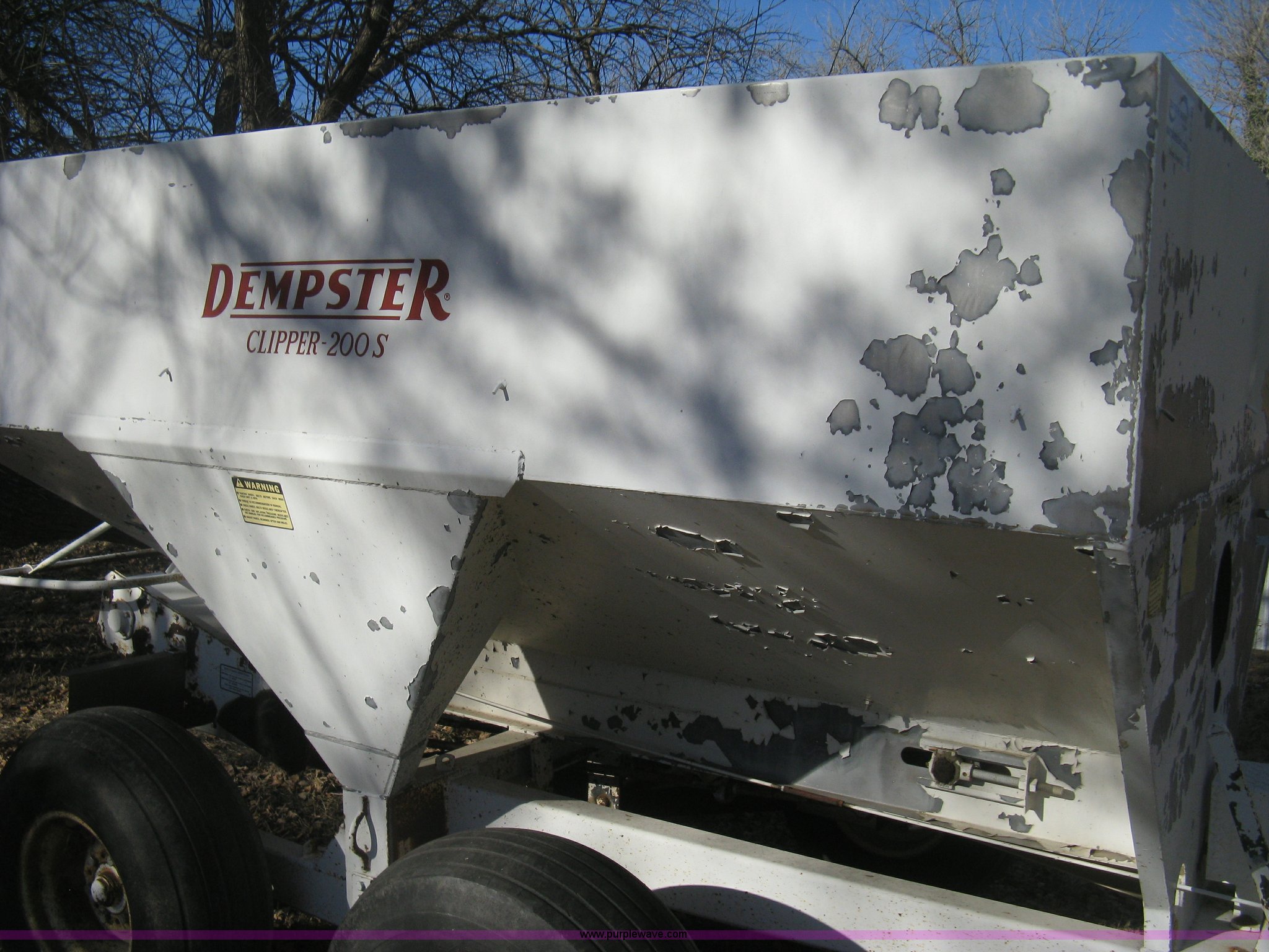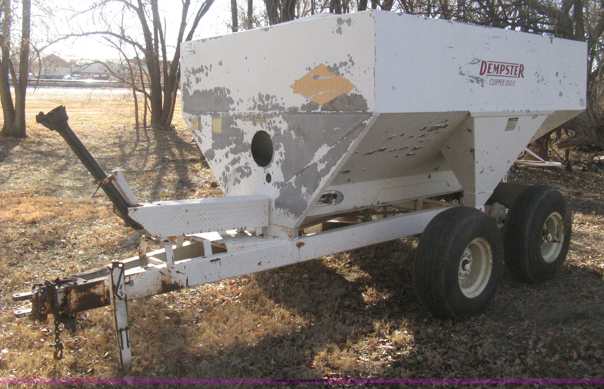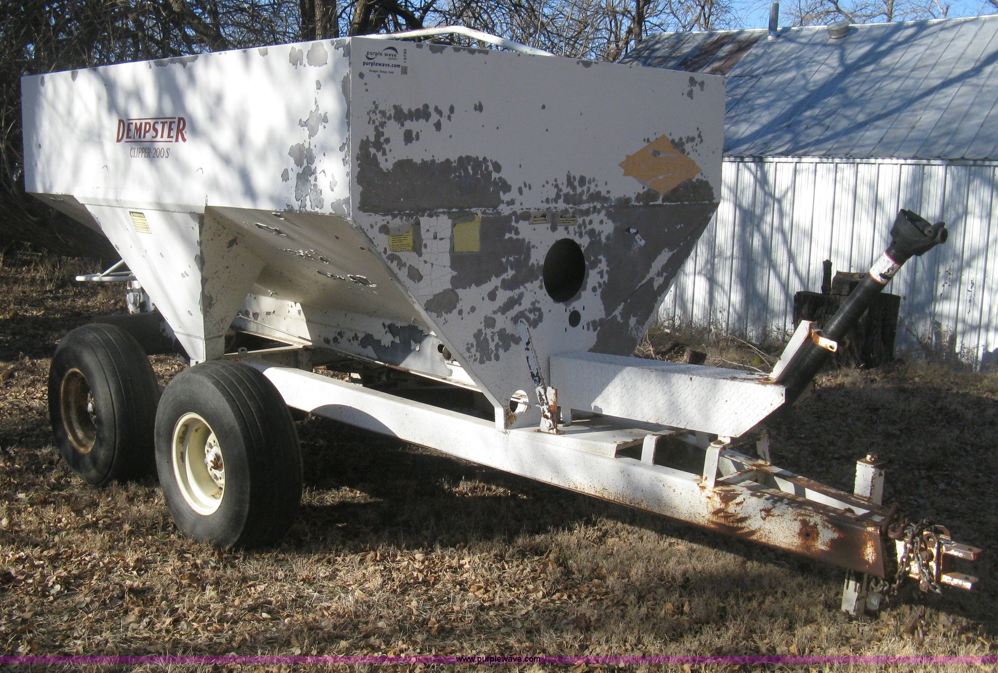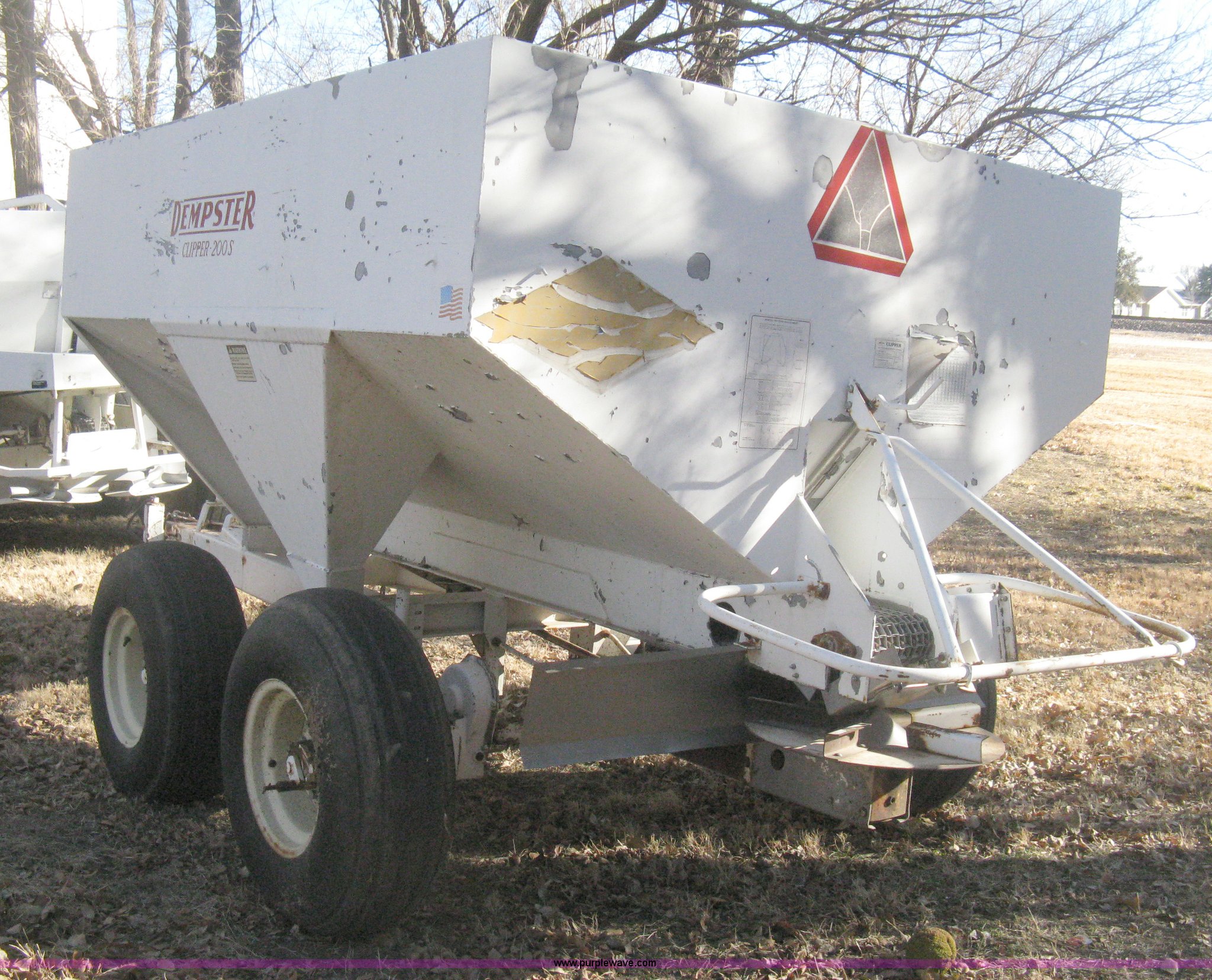Purple Wave is selling a used Fertilizer or Seed Tender in Kansas. This item is a Dempster Clipper 200S dry fertilizer spreader with the following: 540 PTO drive spinner, Single disk broadcaster, Ground drive walking floor, Shaft drive, Pin hitch, Tandem axle chassis, 12.5L-15SL tires, Paint peeling, Serial 95102