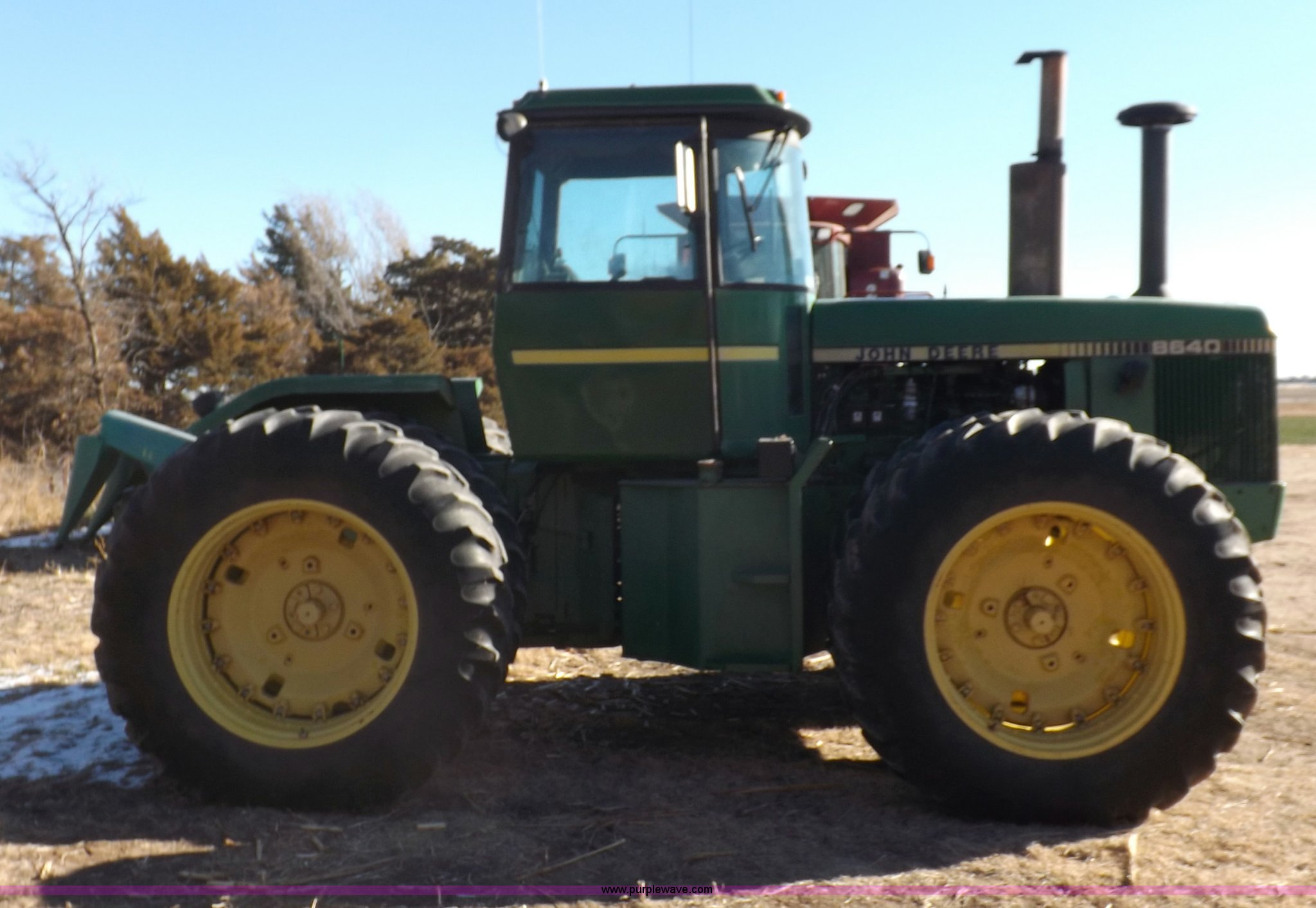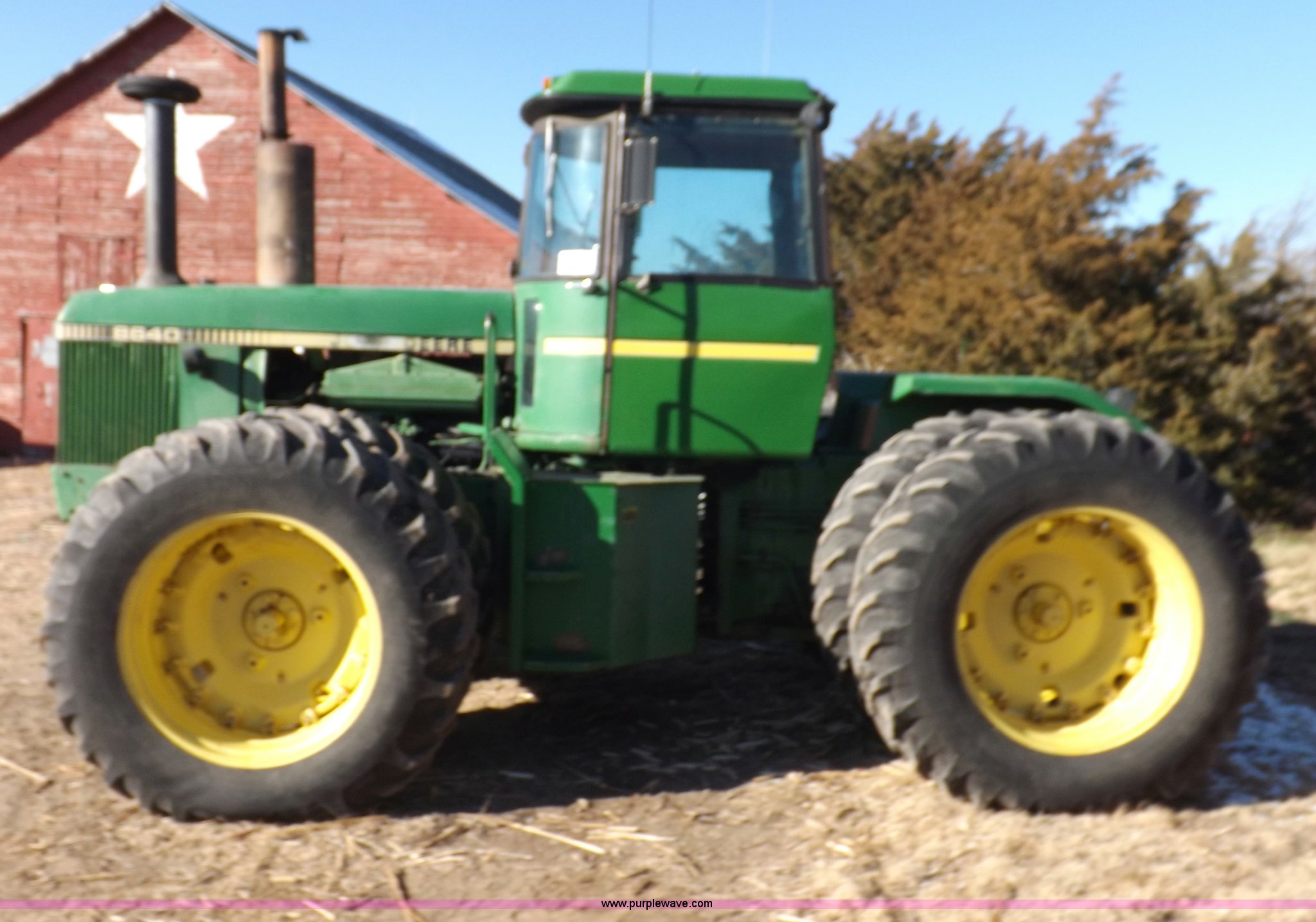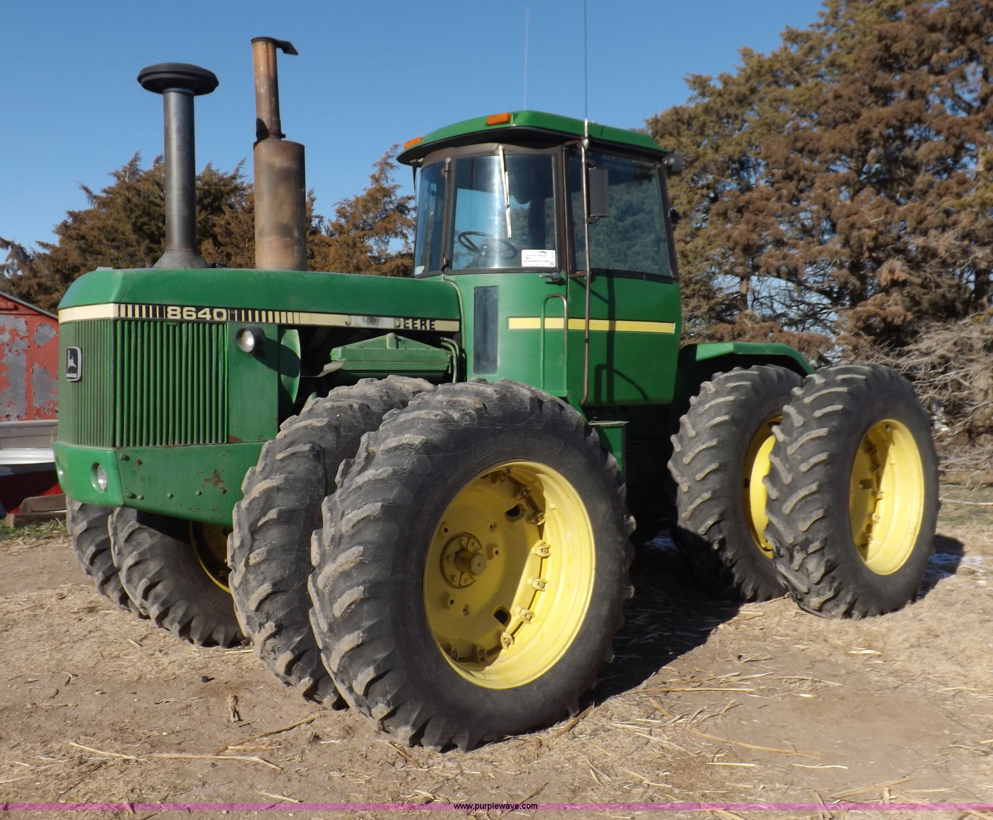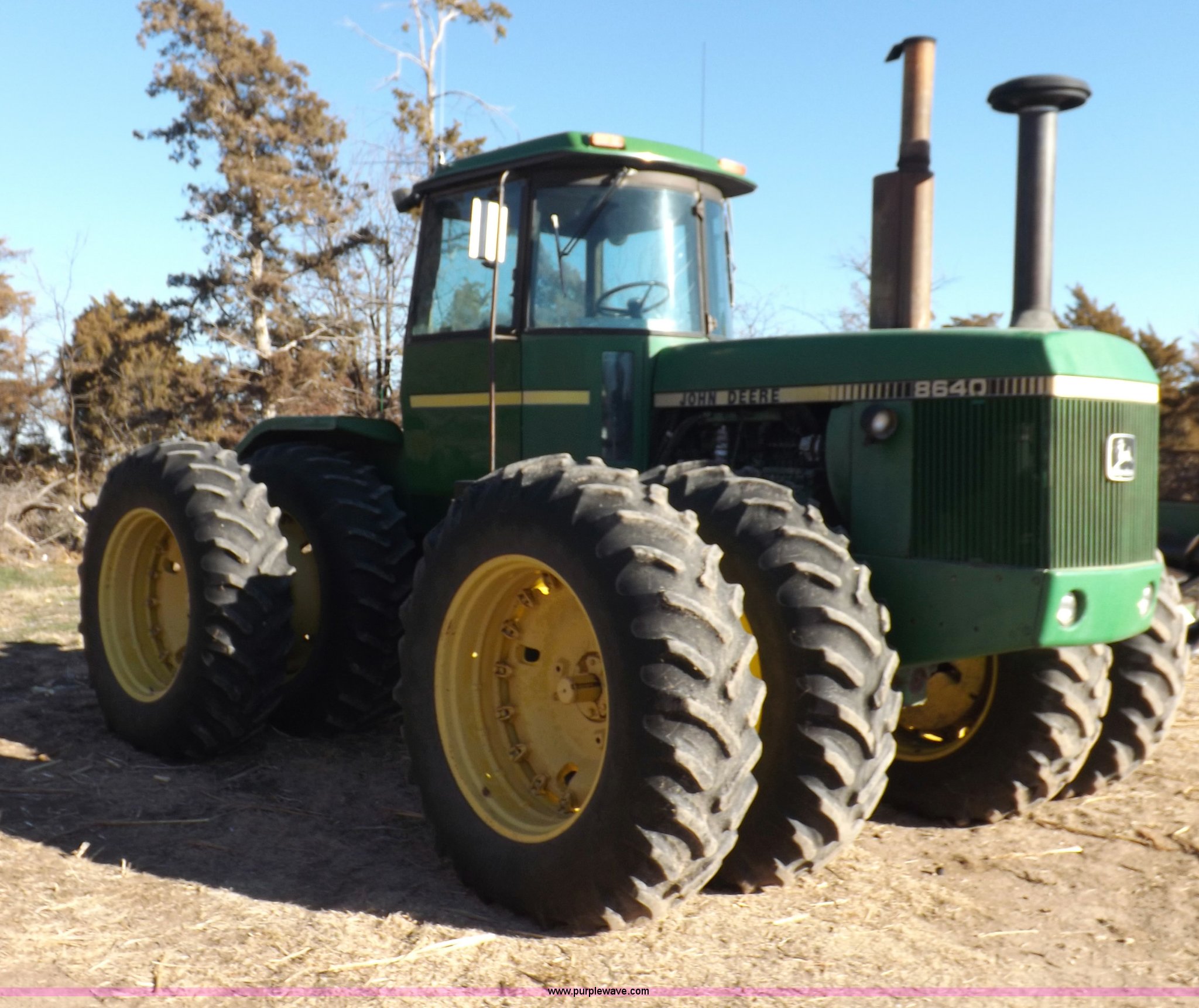 Purple Wave is selling a used Articulated 4-Wheel Drive Tractor in Kansas. This item is a 1979 John Deere 8640 4WD tractor with the following: 12,429 hours on meter, John Deere six cylinder diesel engine, Model 6619AR-08081184R6, Serial 081184R6, Quad Range transmission, 16F-4R gears, Differential lock, AC and heat, AM/FM/cassette, Spring suspension seat, Tilt steering wheel, Three point, Quick attach, Draw bar, Auxiliary outlet, 1000 PTO, 116" wheelbase, 18.4R38 dual tires, Head gasket needs replaced, Injectors need work, Will need to be transported, Serial 8640H0015771R