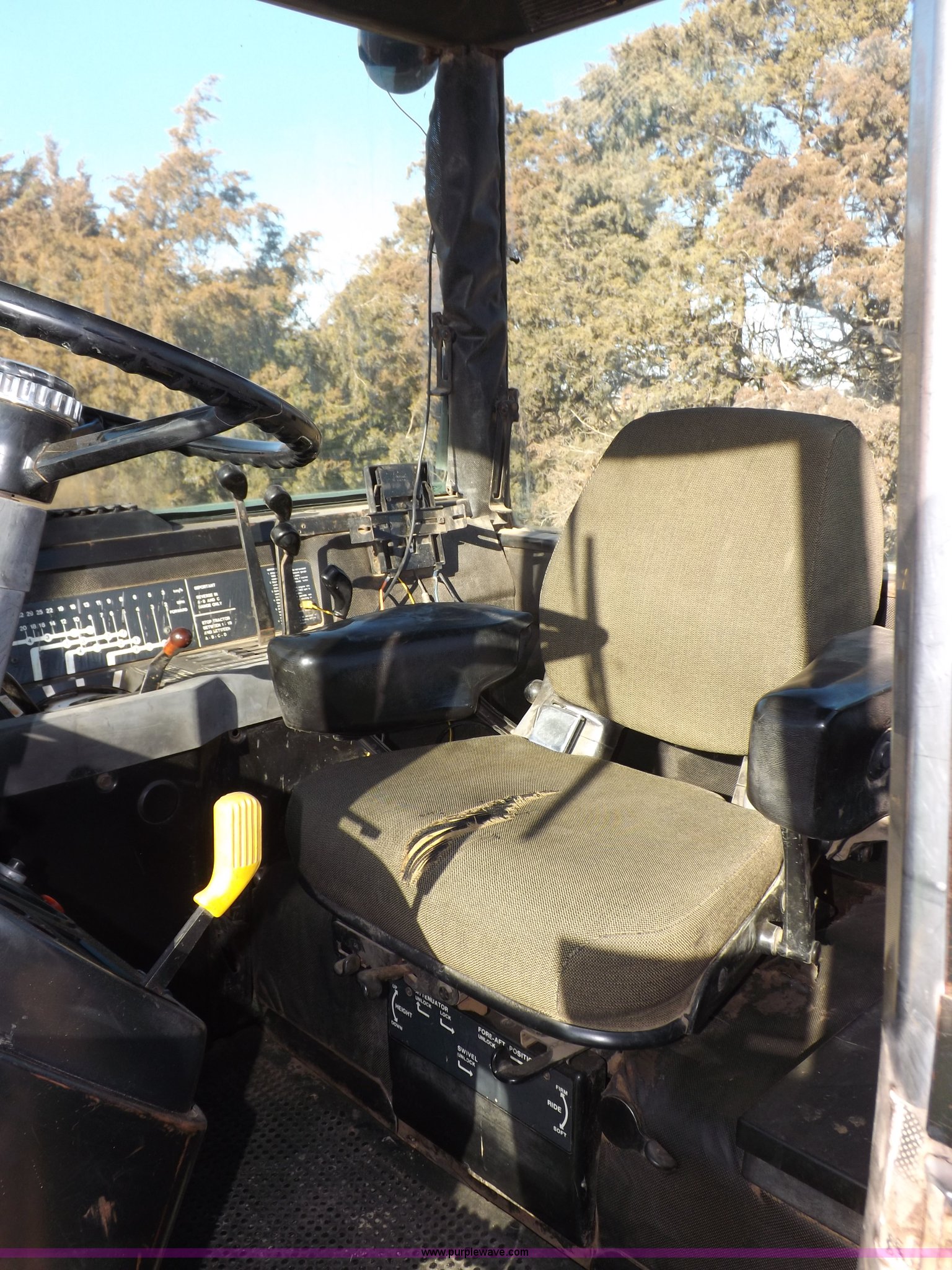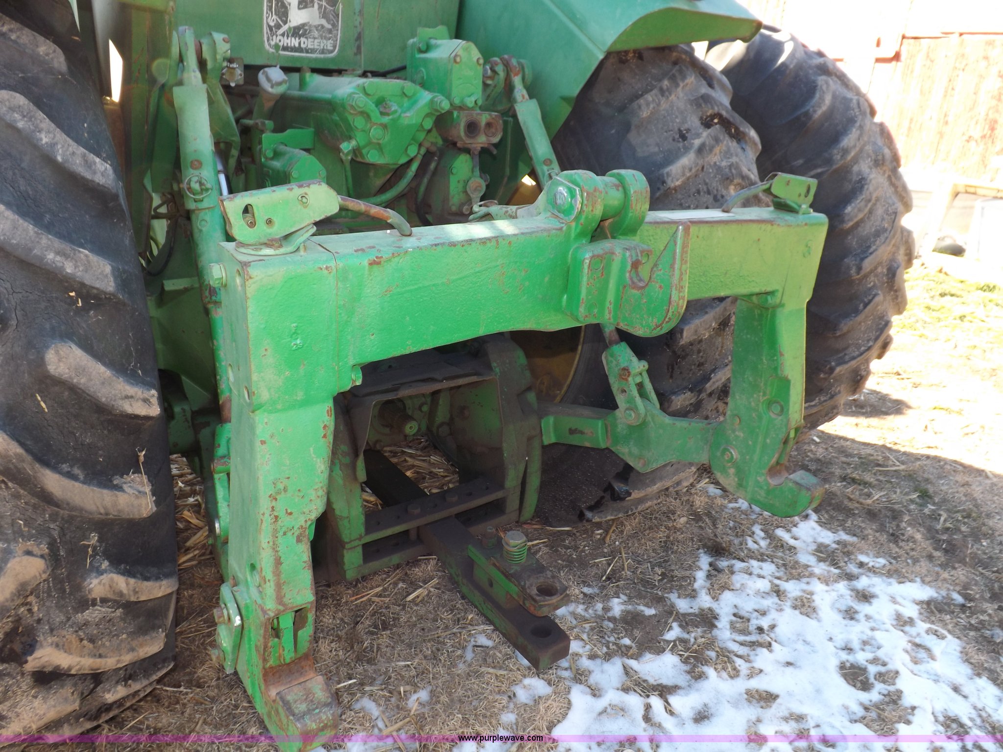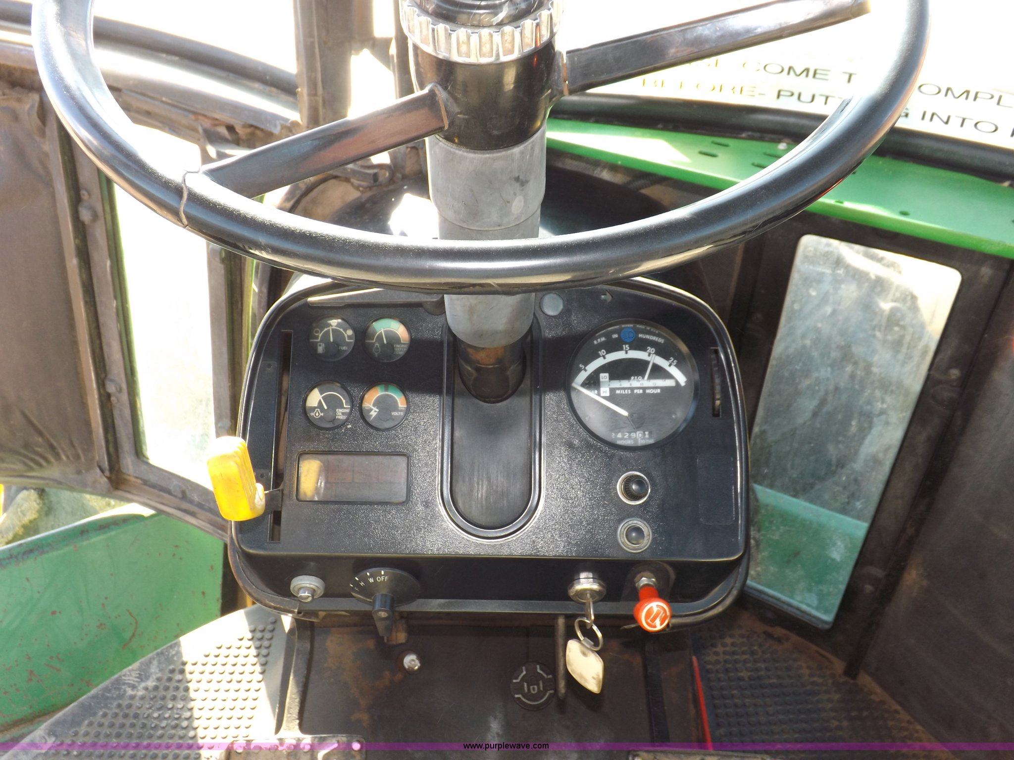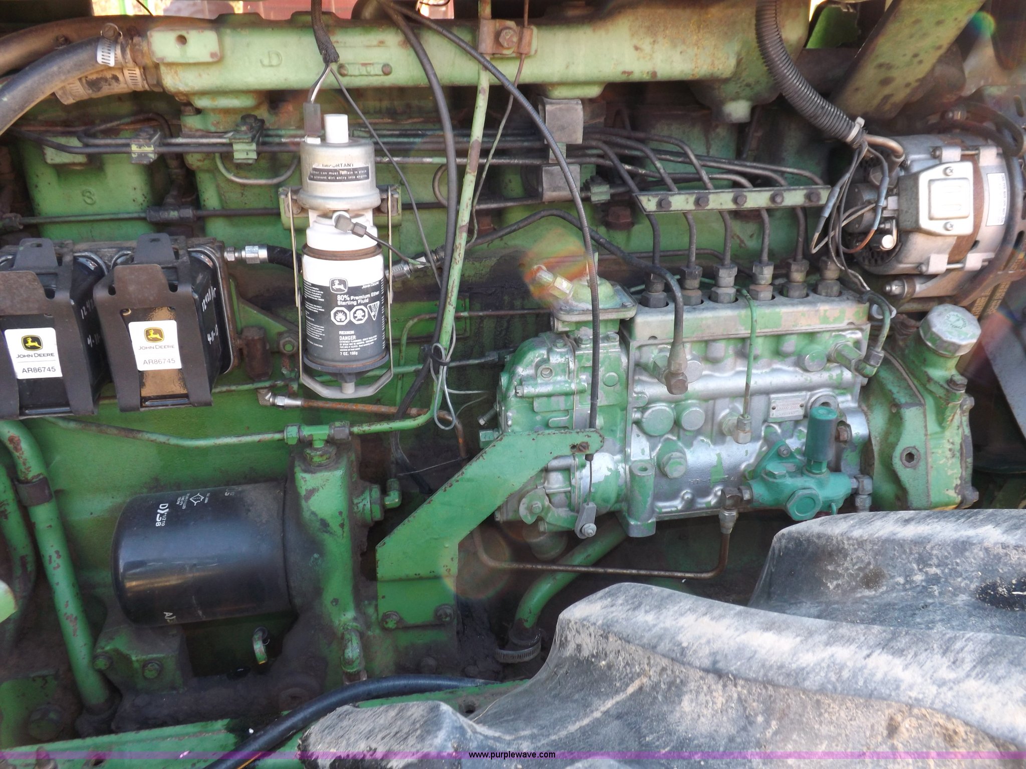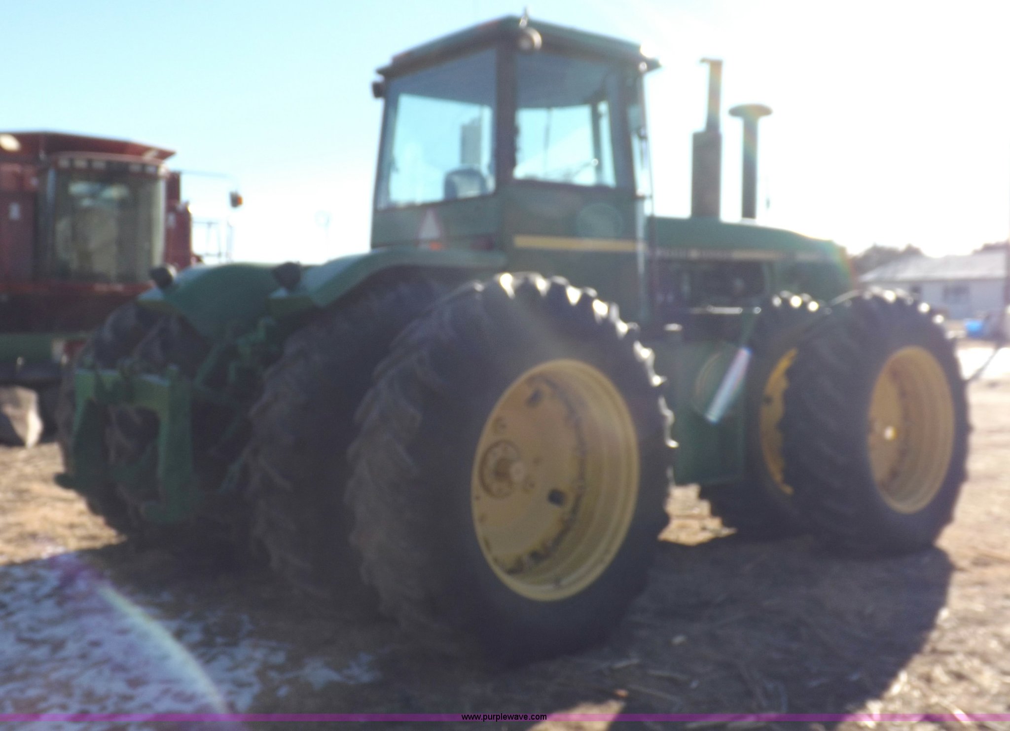 Purple Wave is selling a used Articulated 4-Wheel Drive Tractor in Kansas. This item is a 1979 John Deere 8640 4WD tractor with the following: 12,429 hours on meter, John Deere six cylinder diesel engine, Model 6619AR-08081184R6, Serial 081184R6, Quad Range transmission, 16F-4R gears, Differential lock, AC and heat, AM/FM/cassette, Spring suspension seat, Tilt steering wheel, Three point, Quick attach, Draw bar, Auxiliary outlet, 1000 PTO, 116" wheelbase, 18.4R38 dual tires, Head gasket needs replaced, Injectors need work, Will need to be transported, Serial 8640H0015771R